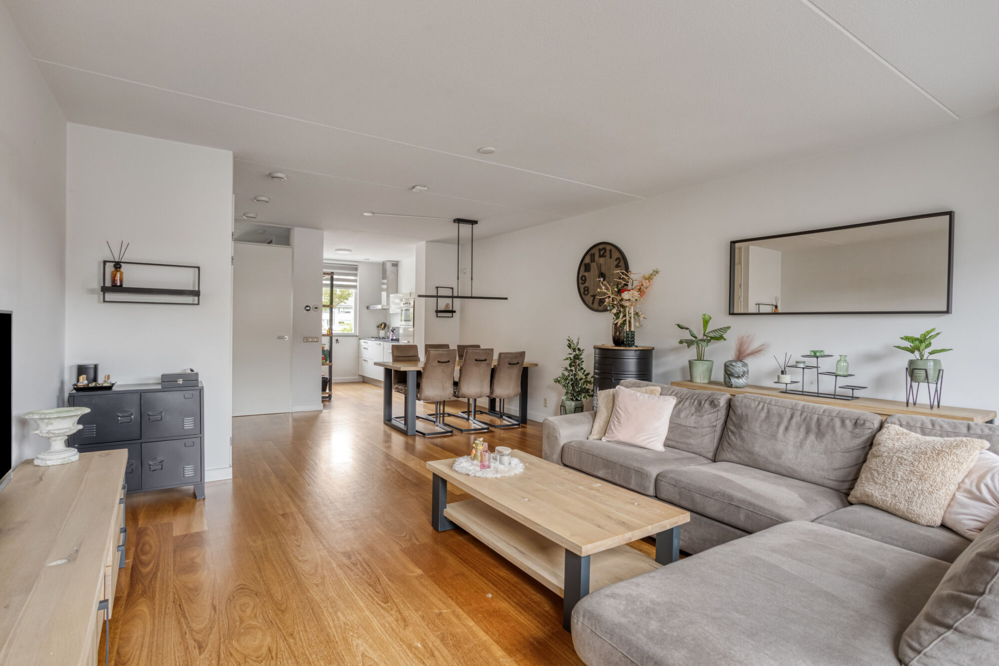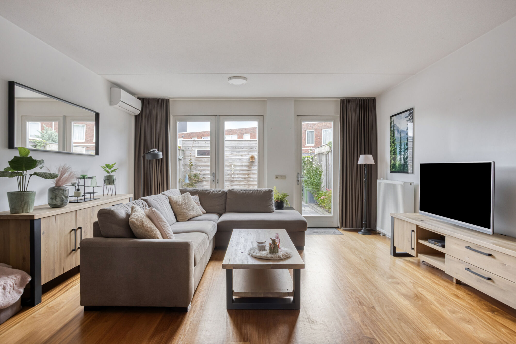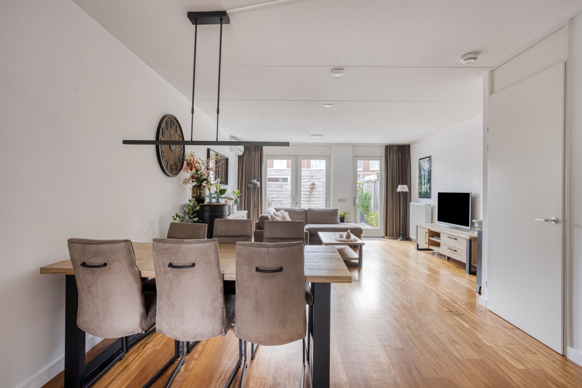 De royale living kenmerkt zich door veel lichtinval vanwege de grote raampartijen. Mede door de hoge plafonds wordt het gevoel van ruimtelijkheid vergroot. De airco zorgt voor extra comfort in de zomerdagen en in de winterdagen.