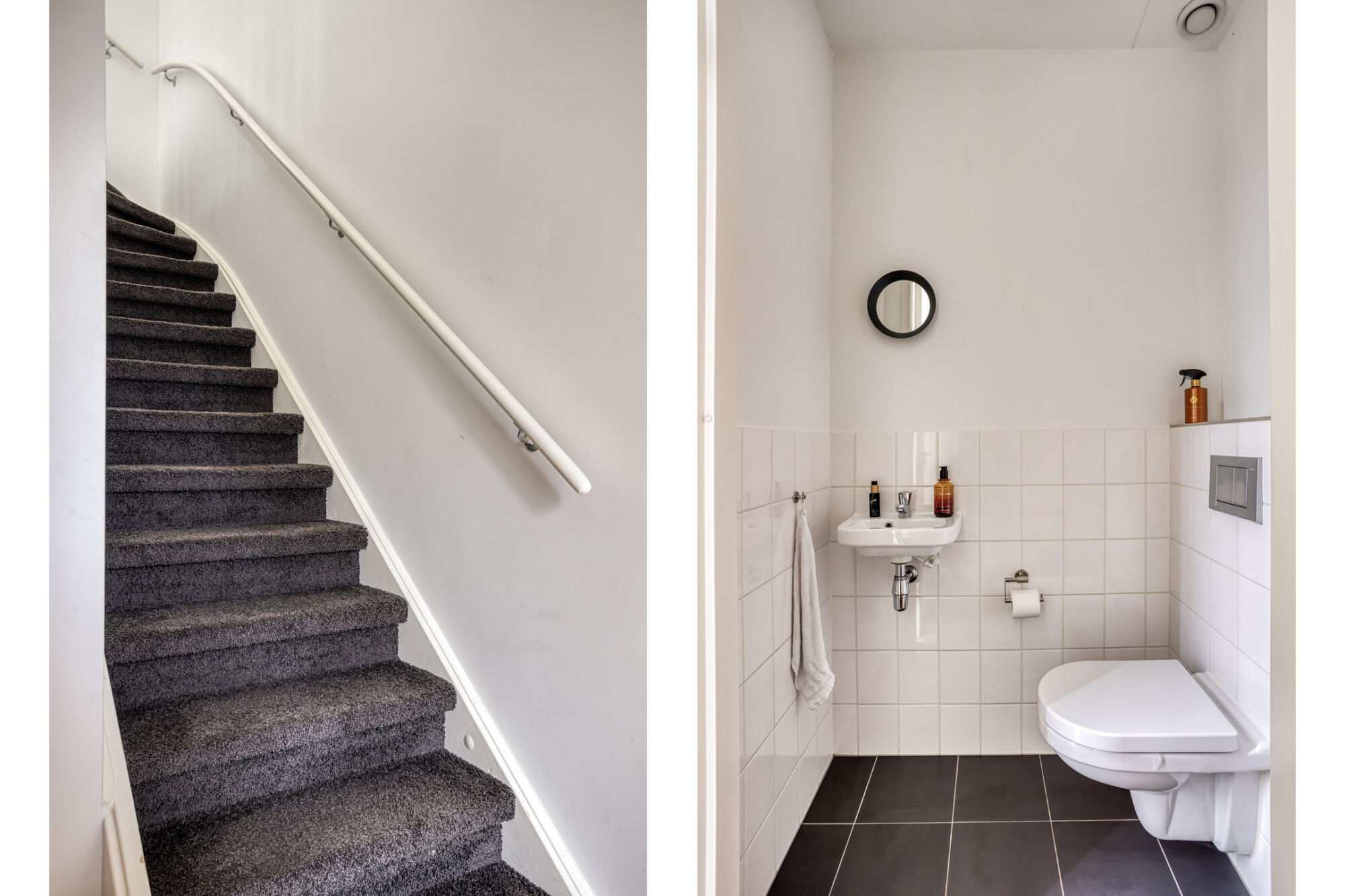 Verder treft u hier de deels betegelde toiletruimte, de meterkast en trapopgang aan.