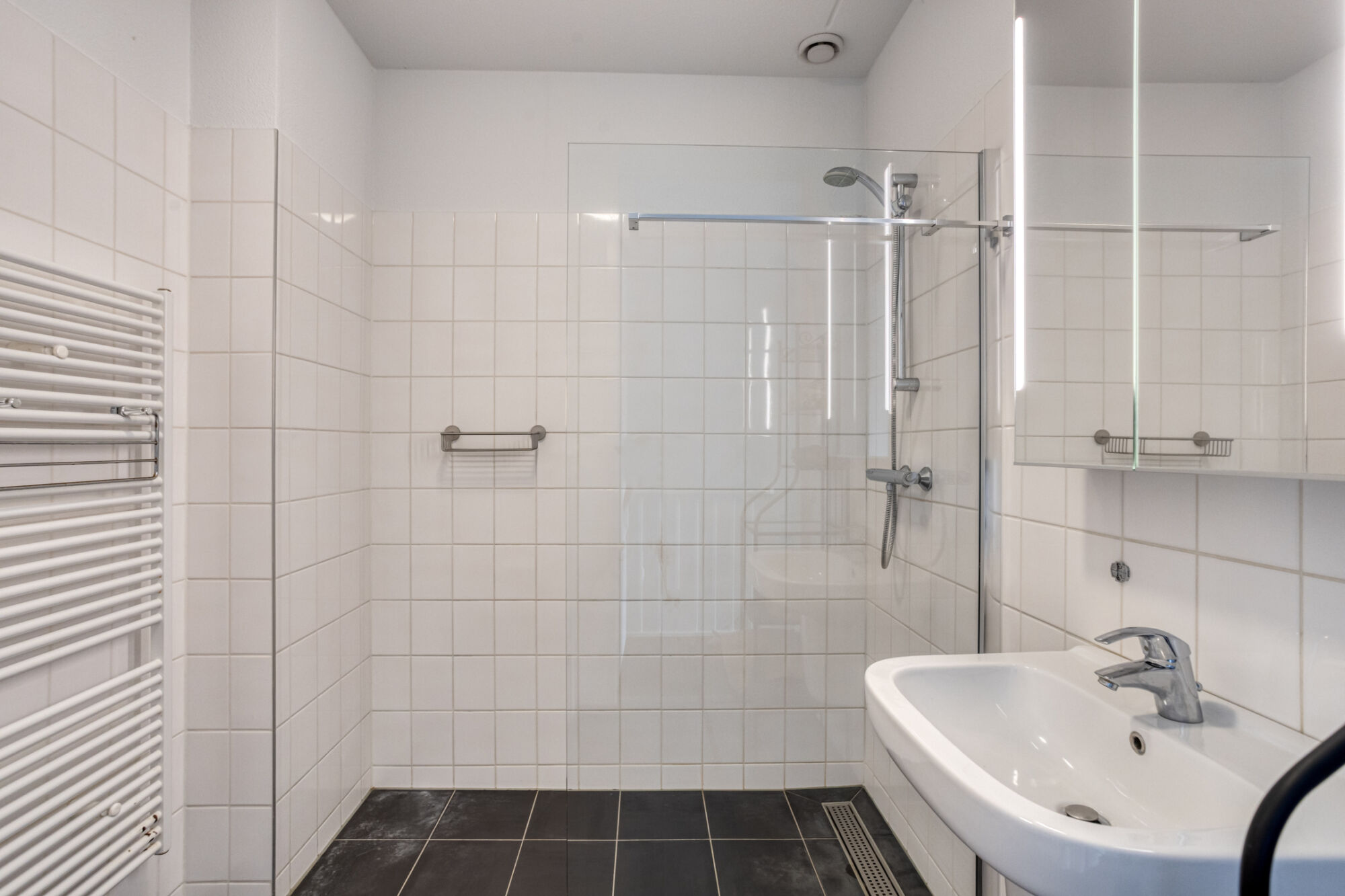 De badkamer is uitgerust met een inloopdouche, 2e toilet, wastafel en design radiator.