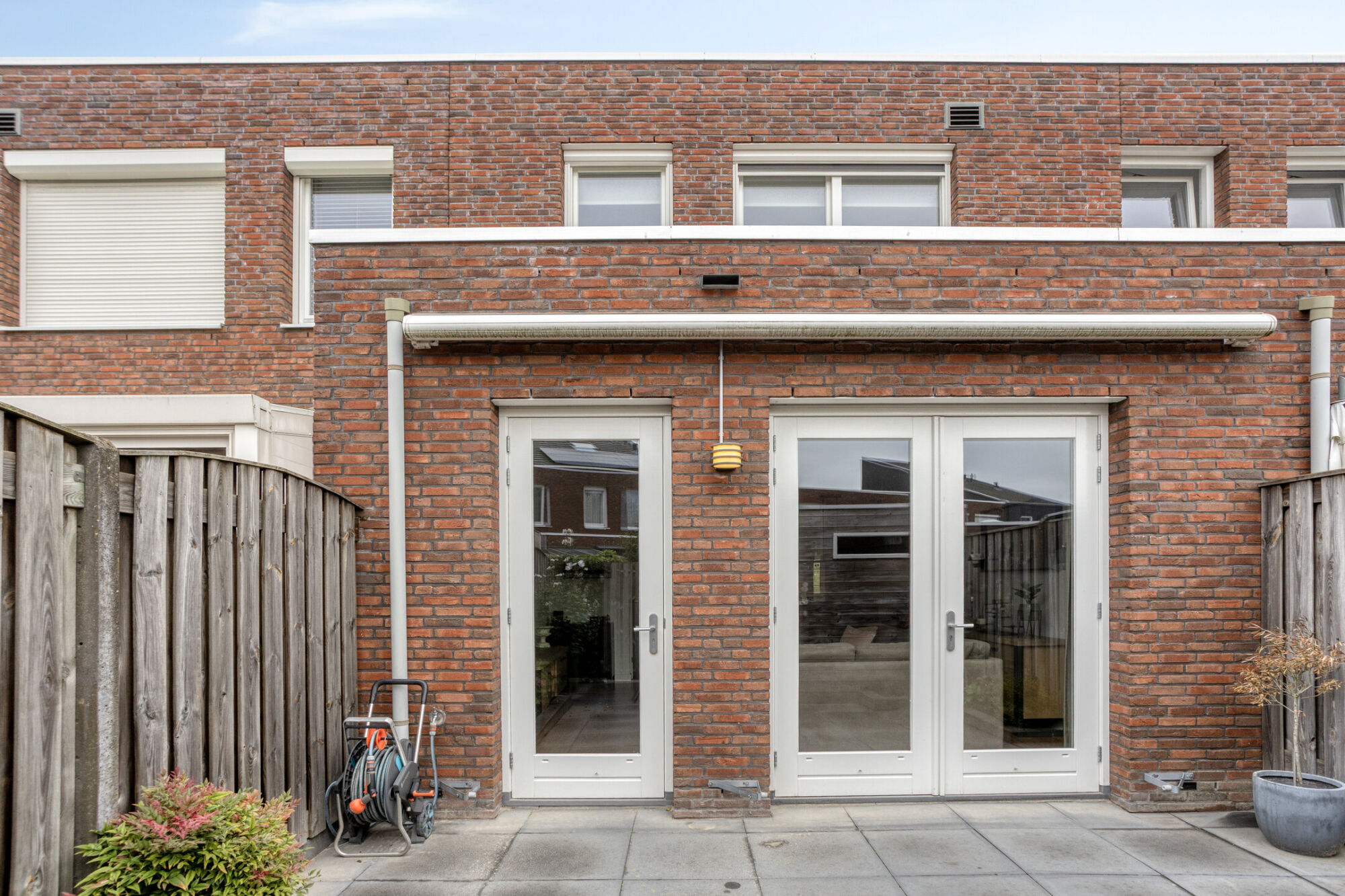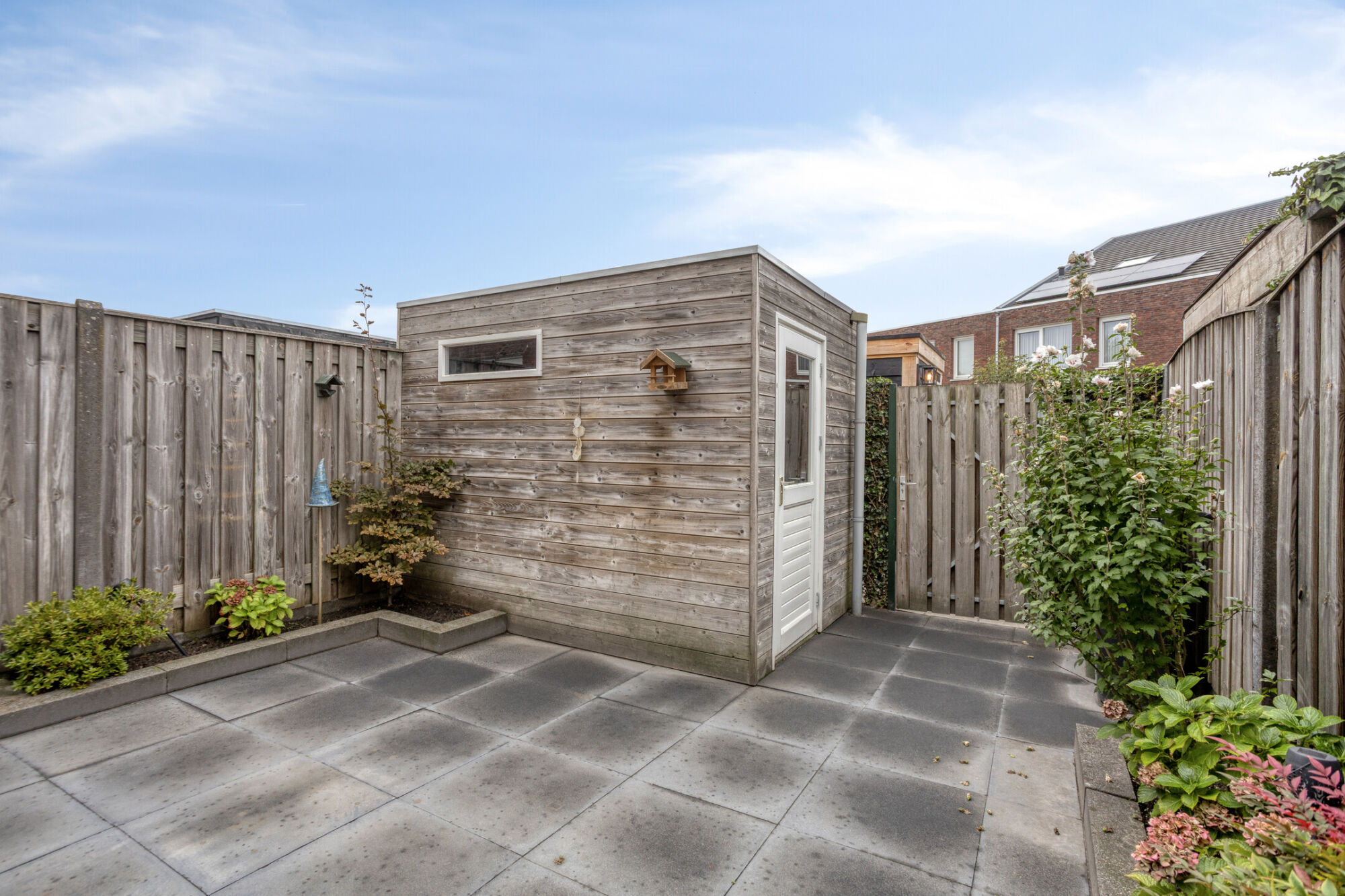 De achtertuin is gunstig gelegen op het zonnige zuiden en beschikt over een heerlijk terras, een zonneluifel, vaste beplanting en een nette erfafscheiding rondom. Daarnaast is er een houten berging aanwezig, voorzien van elektra, ideaal voor extra opslag of het stallen van fietsen.