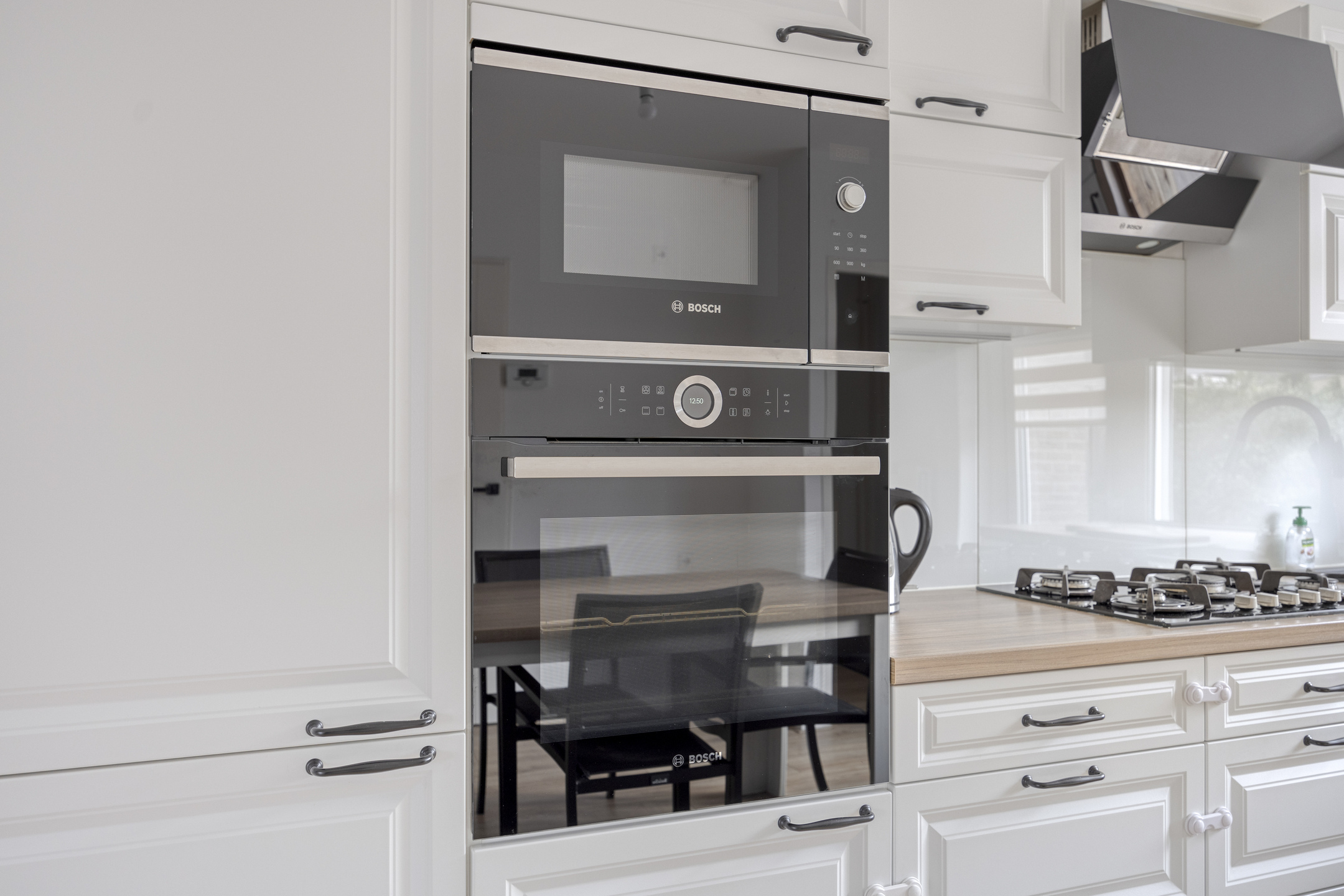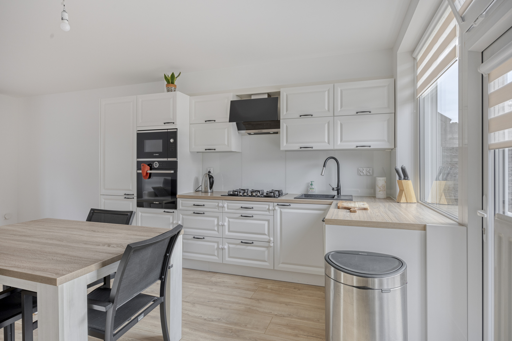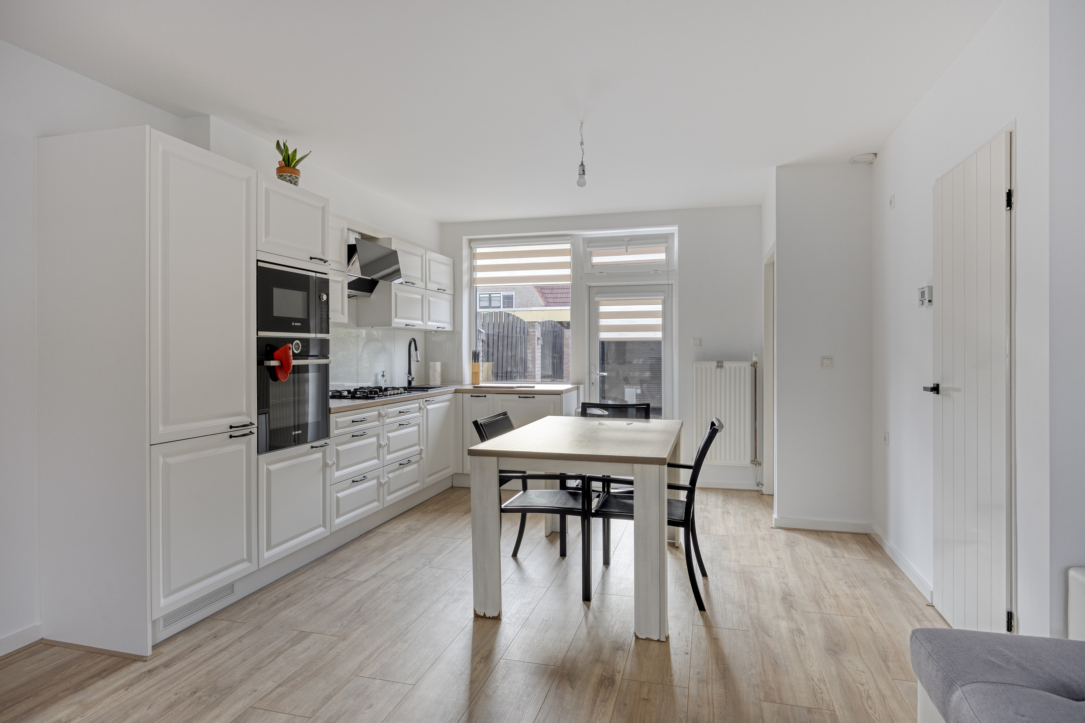 De open keuken is aan de achterzijde van de woning gelegen en staat in verbinding met de rest van de begane grond. De keuken is uitermate praktisch ingedeeld, tegen de lange wand geplaatst en voorzien van veel bergings- en werkruimte. De grote raampartijen in de achtergevel geven de ruimte haar zonnige karakter. De keuken is voorzien van inbouwapparatuur, te weten: