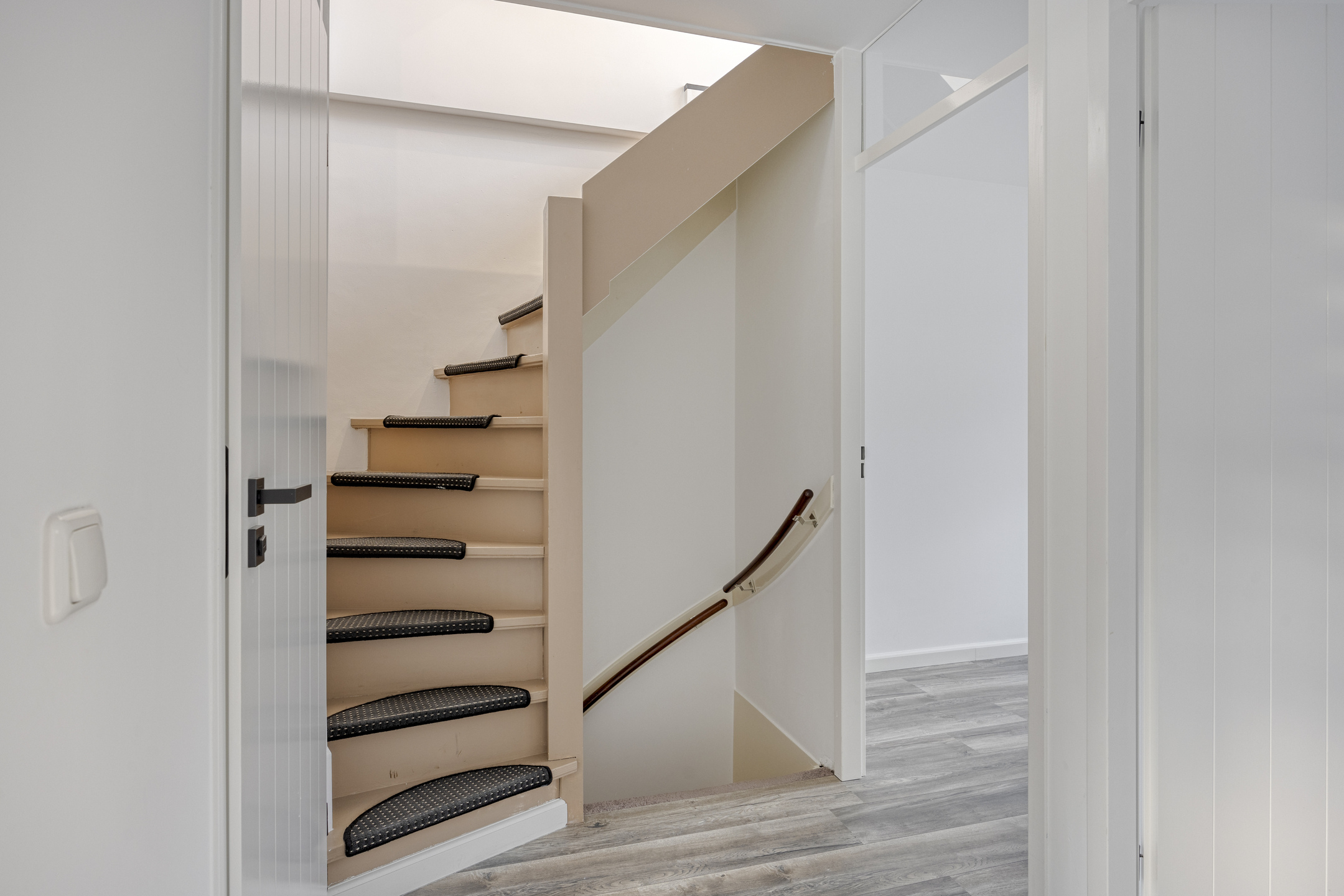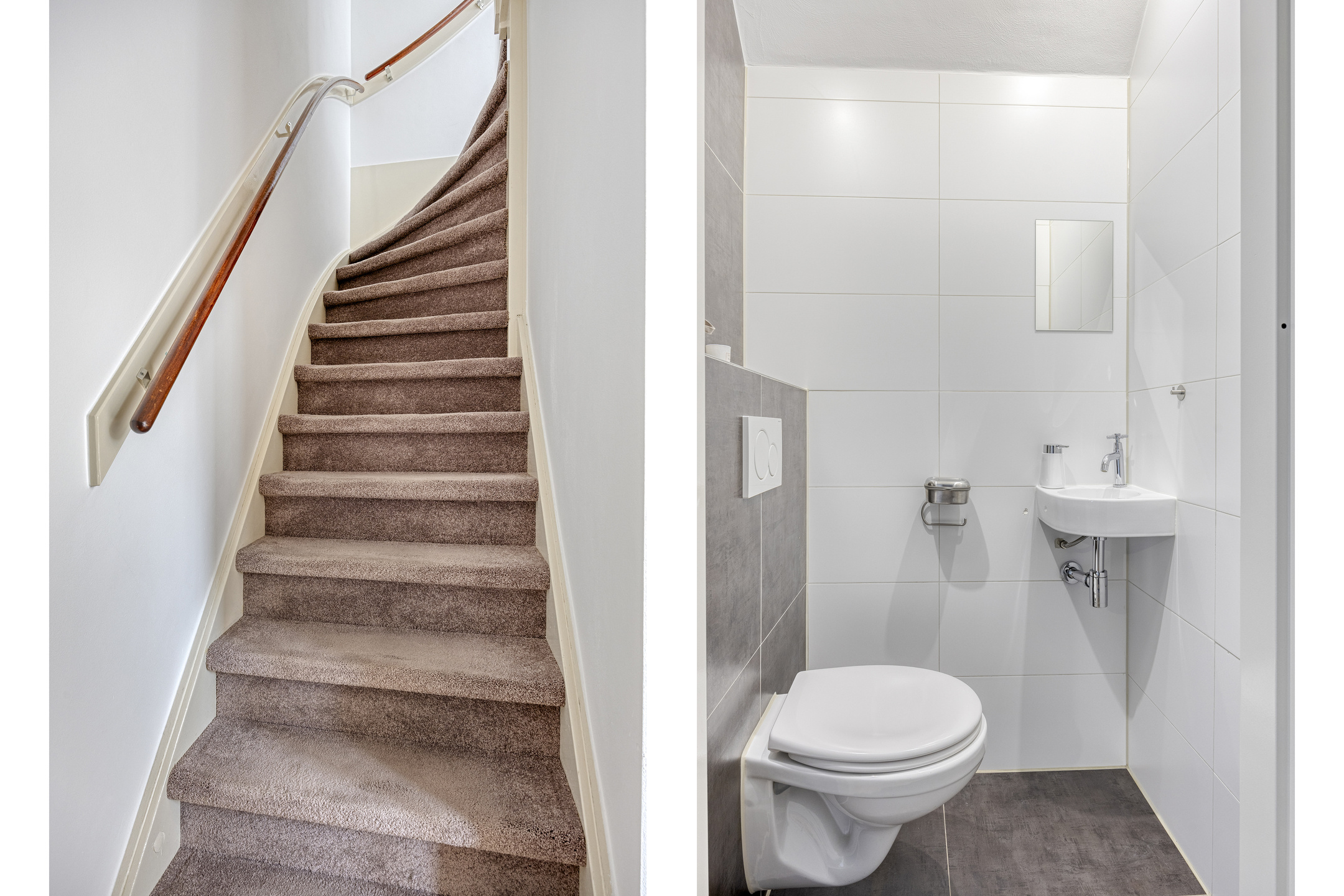Vanuit de keuken krijgen we toegang tot het portaal aan de achterzijde. Vanuit dit portaal krijgt u toegang tot de toiletruimte, geheel betegeld, voorzien van wandcloset en fonteintje en de nette, beklede trapopgang richting de overloop van de eerste verdieping.