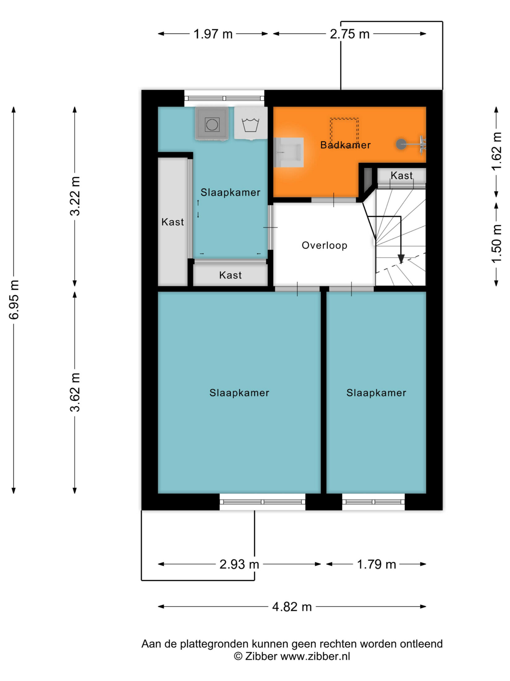 Via de trapopgang in het portaal van de begane grond komt u op de overloop waaraan een tweetal grote slaapkamers, een wasruimte (mogelijk te gebruiken als slaapkamer of thuiswerkplek) en de badkamer gelegen zijn. Via de vaste trap bereikt u de tweede verdieping van deze woning.
