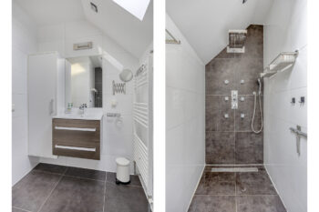 Aan de achterzijde van deze verdieping treft u de badkamer. De badkamer is geheel modern en strak betegeld en voorzien van een grote inloopdouche met regen- en handdouche en een wastafelmeubel met veel bergingsruimte. Het geheel oogt modern en is zeer goed onderhouden.