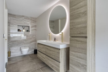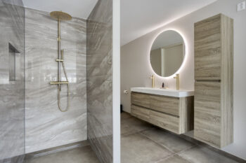 De badkamer is voorzien van een ruime inloopdouche, een vrijstaand ligbad en een fraai badmeubel met dubbele wastafel. Hoogwaardige materialen en een verzorgde afwerking geven deze badkamer een luxe uitstraling en maken het tot een heerlijke plek om te ontspannen.
