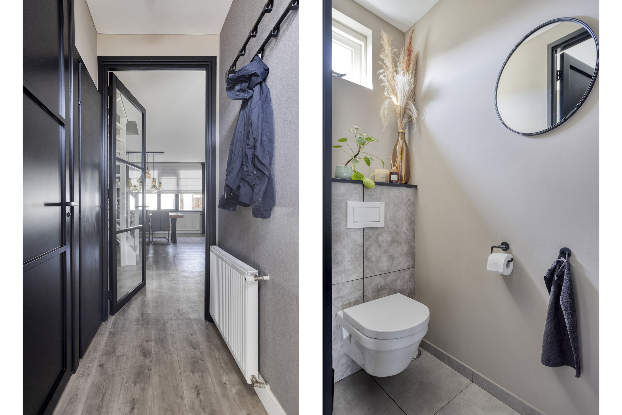 Grote eigen oprit met carport voor het plaatsen uw auto. Voorentree met toegang tot de hal. In de hal bevinden zich het moderne deels betegelde toilet met wandcloset en de meterkast met uitgebreide groepeninstallatie. Op de vloer ligt een fraaie PVC-vloer die keurig wordt doorgetrokken naar de woonkamer en de keuken. Direct bij binnenkomst valt direct op hoe verzorgd en stijlvol deze woning is afgewerkt.