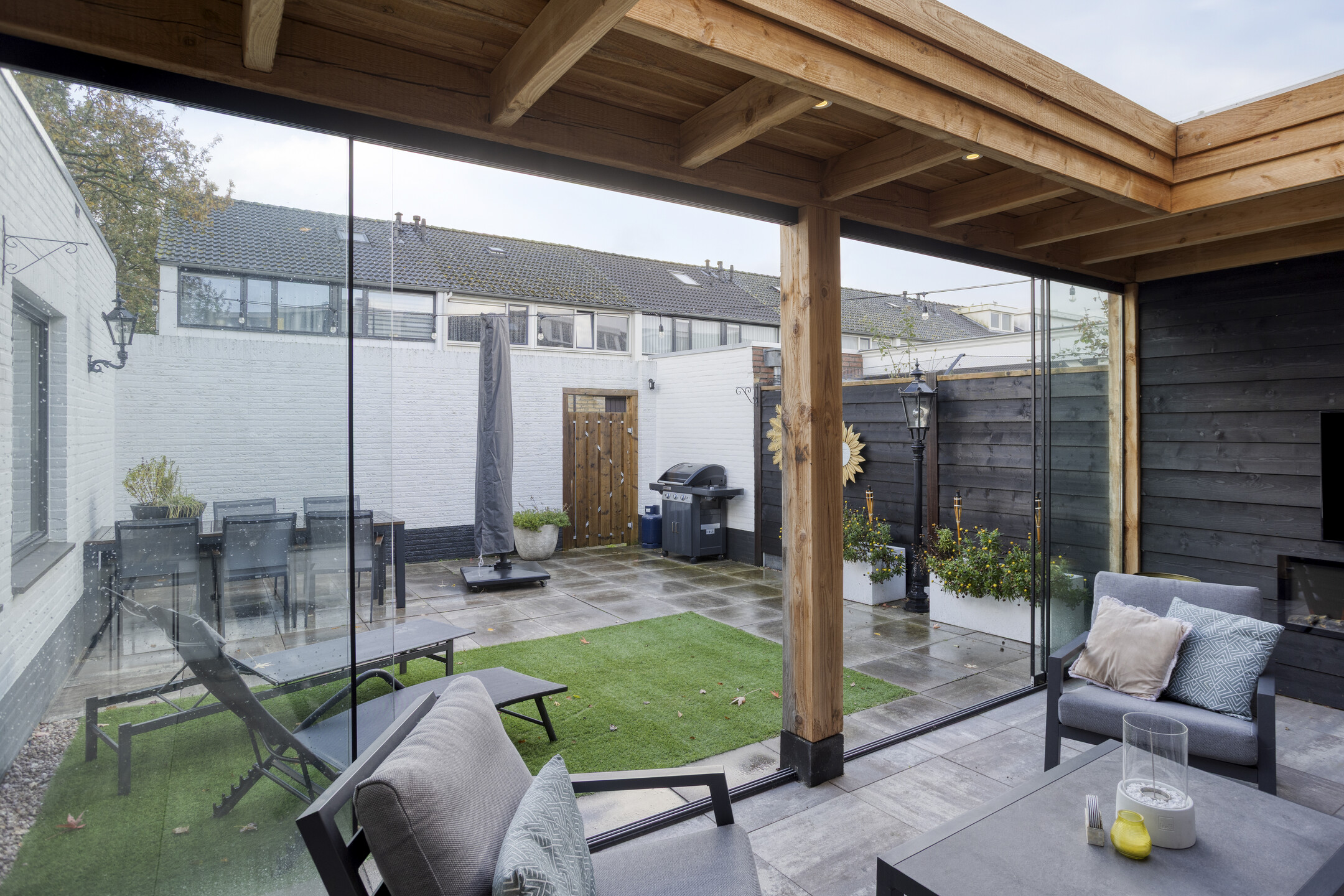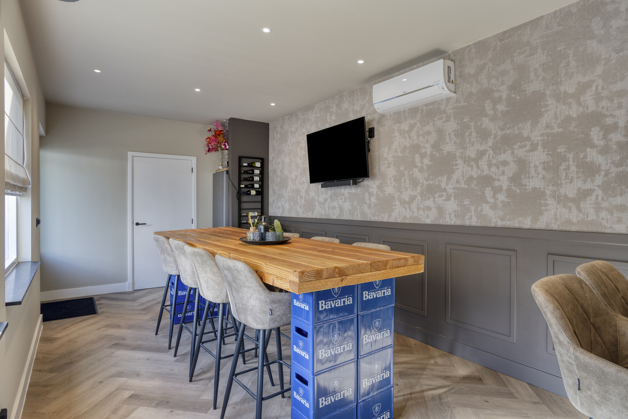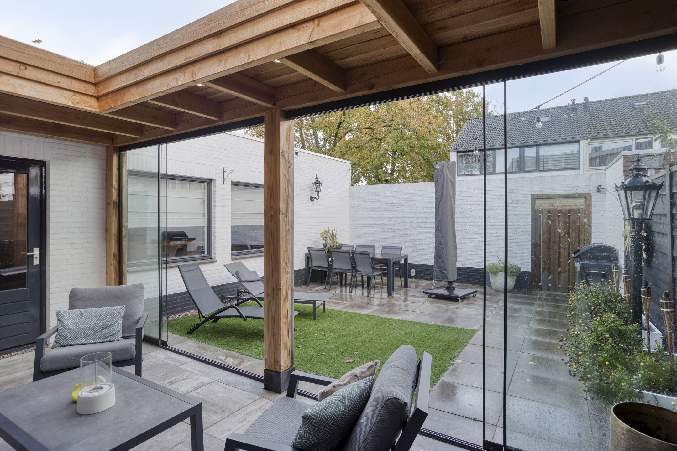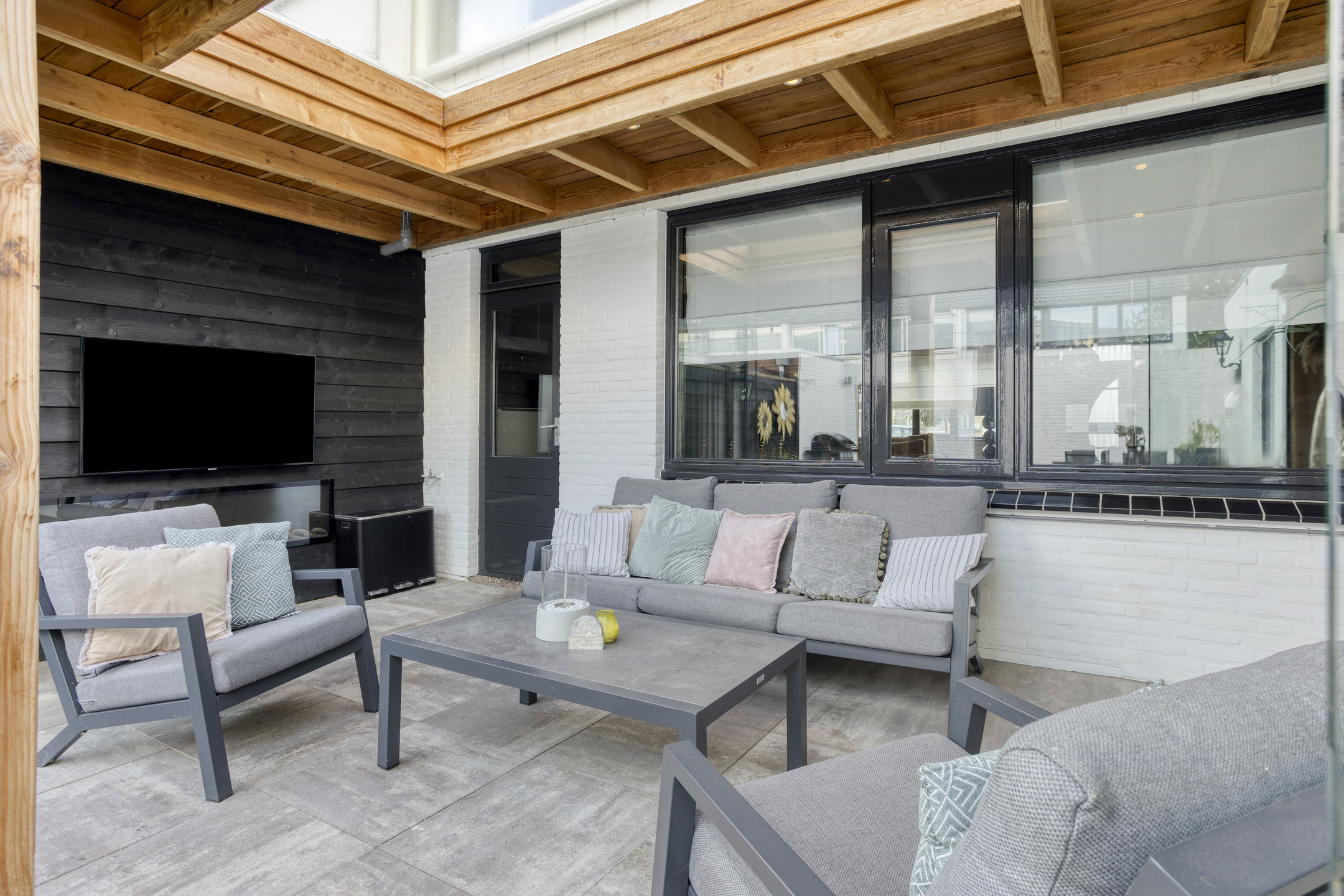 Aan de achterzijde bevindt zich een mooie tuinkamer, met een grote lichtkoepel en een glazen schuifpui – perfect om het hele jaar door te genieten van het buitenleven. Verder is de achtertuin fraai en onderhoudsvriendelijk aangelegd met mooie sierbestrating, erfafscheiding en een eigen achterom. Aangrenzend vind je de fantastische multifunctionele ruimte, die uitstekend dienst kan doen als chillruimte, kantoor, hobbykamer of speelkamer – een echte bonus voor wie flexibel wonen belangrijk vindt.