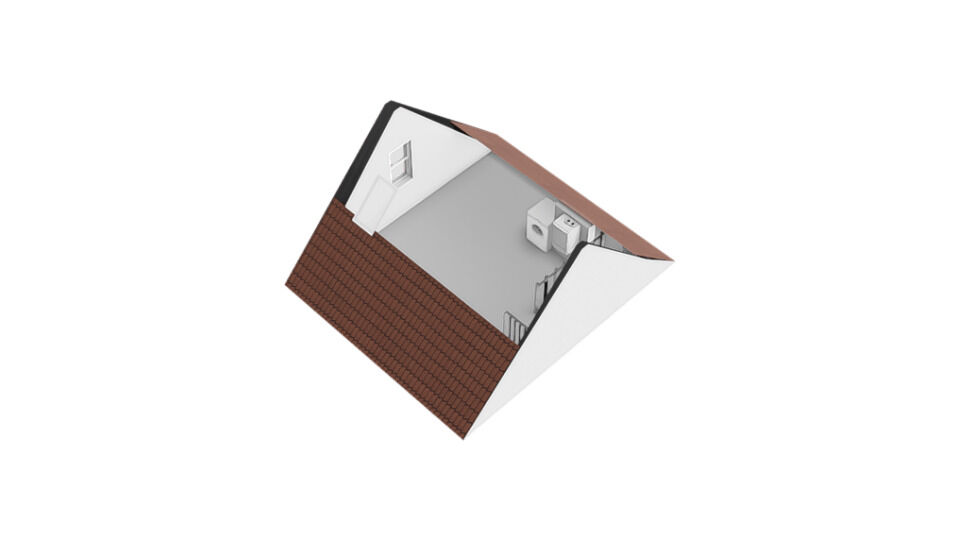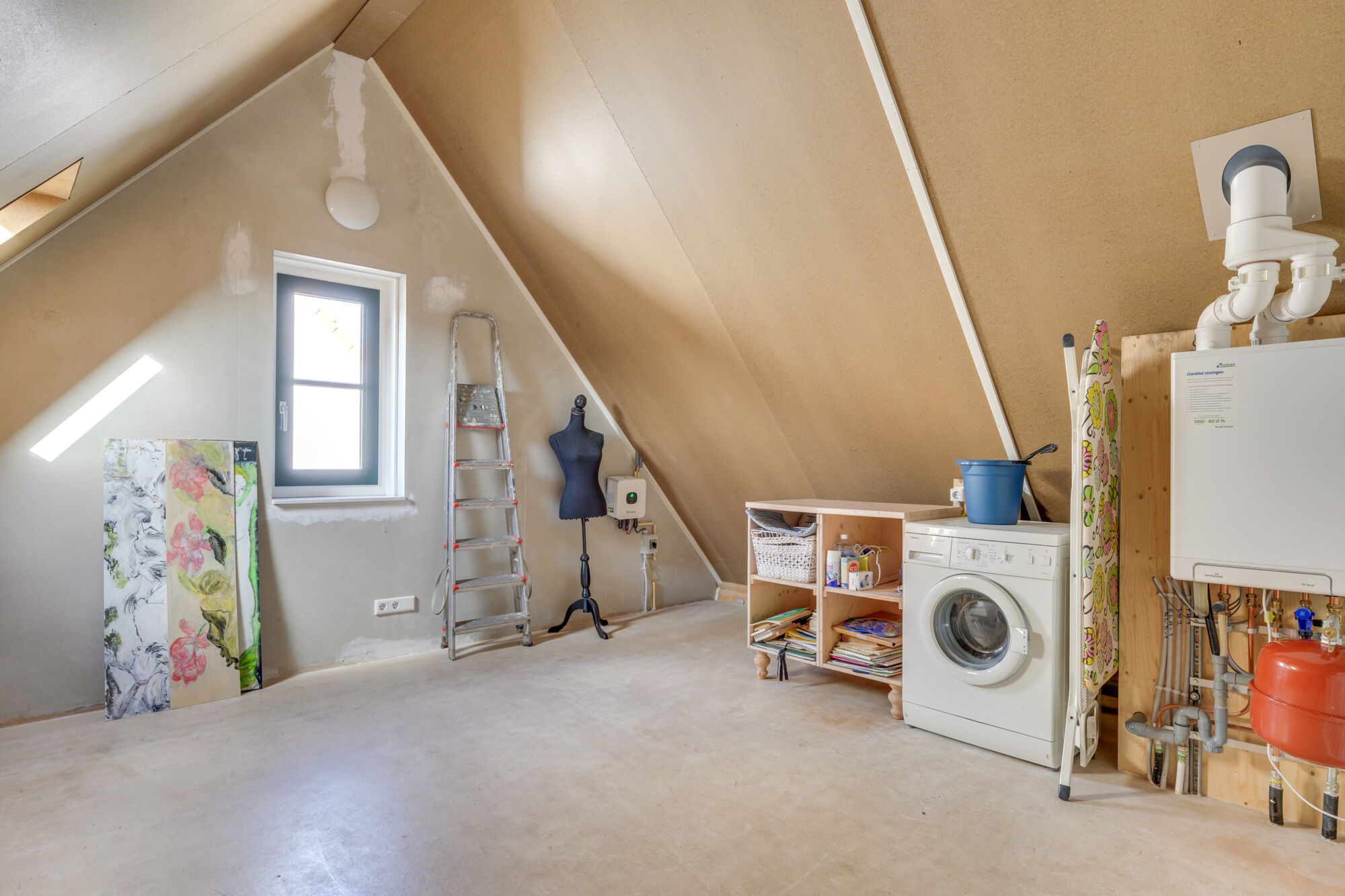 Via de vaste trap bereiken we de open zolder. Hier hangt de Intergas CV-ketel en bevinden zich de witgoedaansluitingen.
