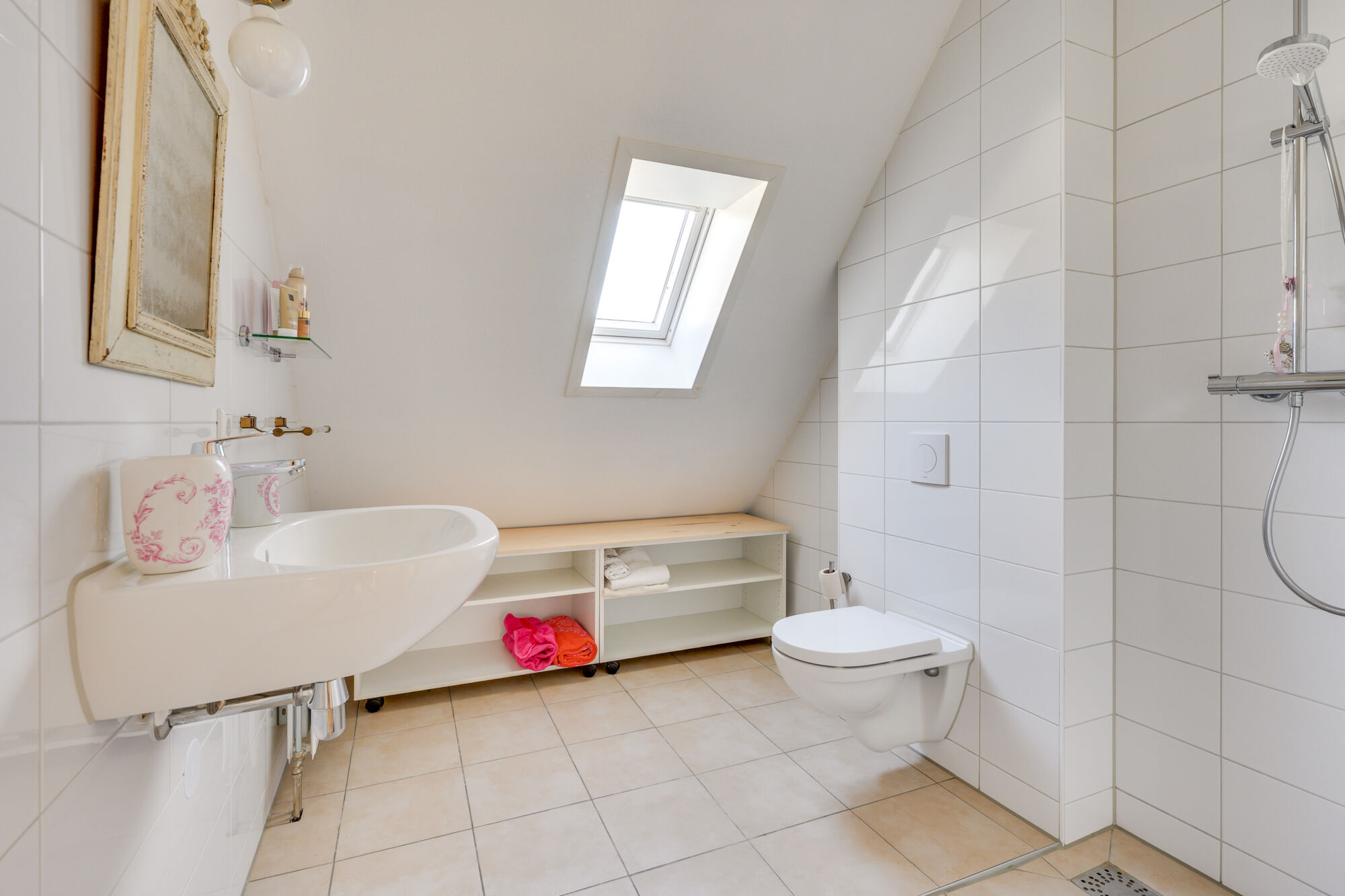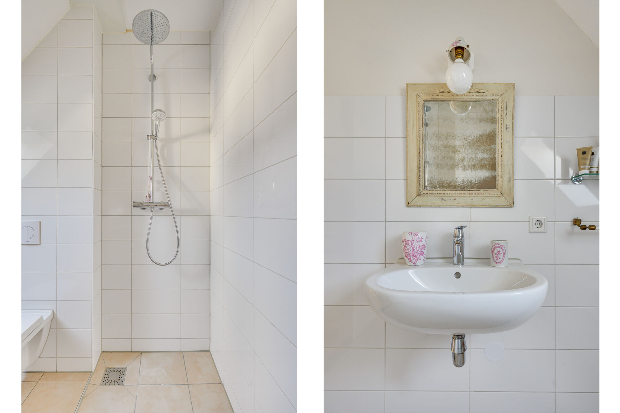 In de badkamer treffen we een inloopdouche en een tweede toilet. Ook deze ruimte is efficiënt en smaakvol ingericht.