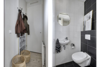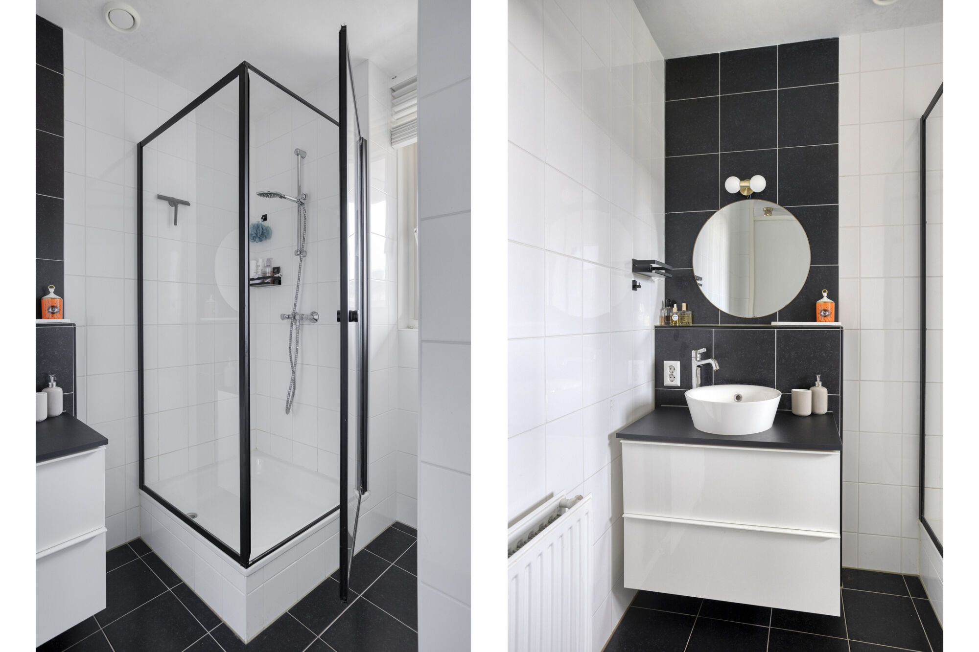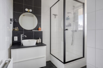 De moderne badkamer is voorzien van een douchecabine en wasmeubel met daarop een waskom. Het geheel is in neutrale tinten betegeld en daardoor tijdloos te noemen.