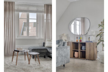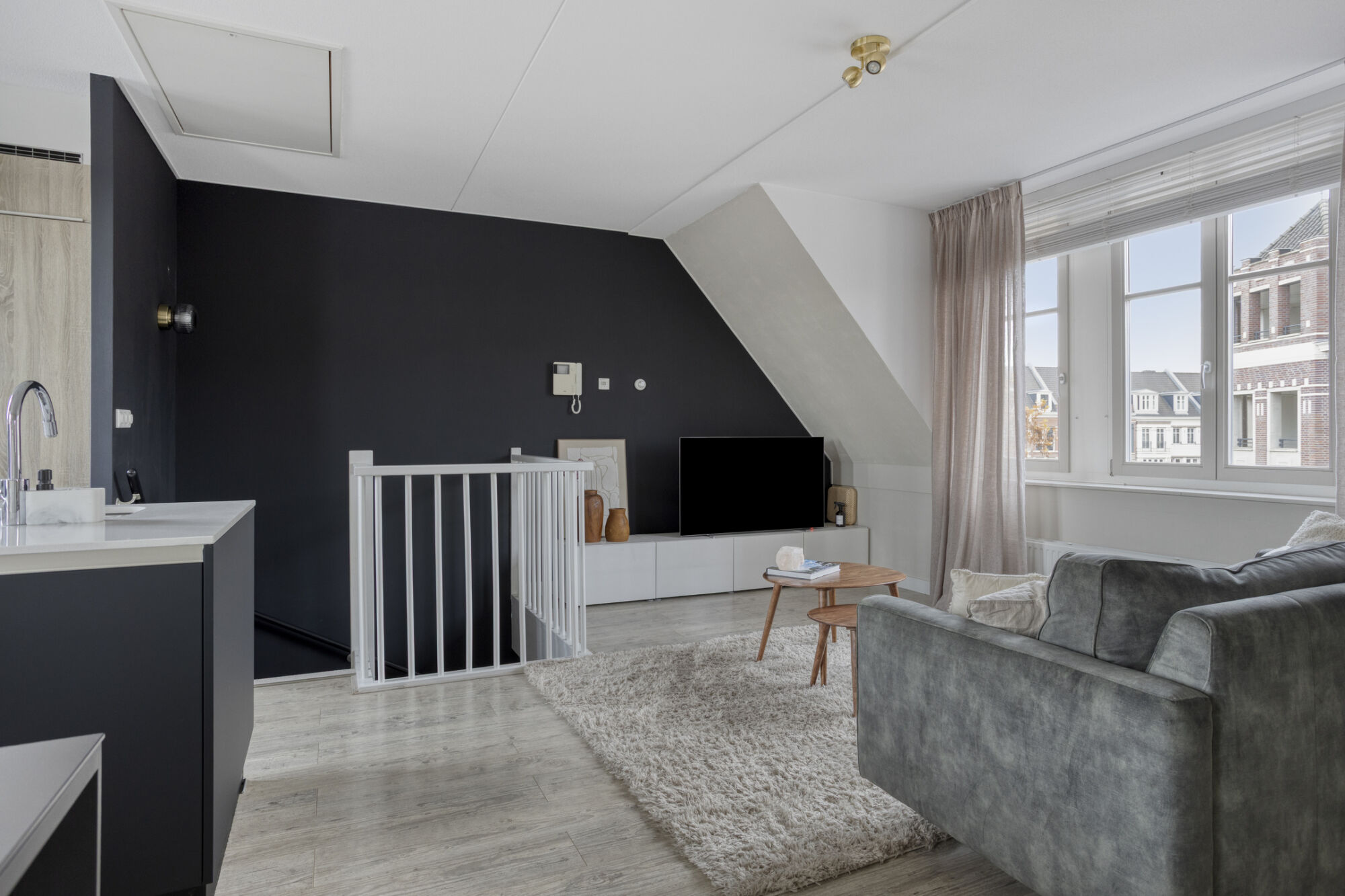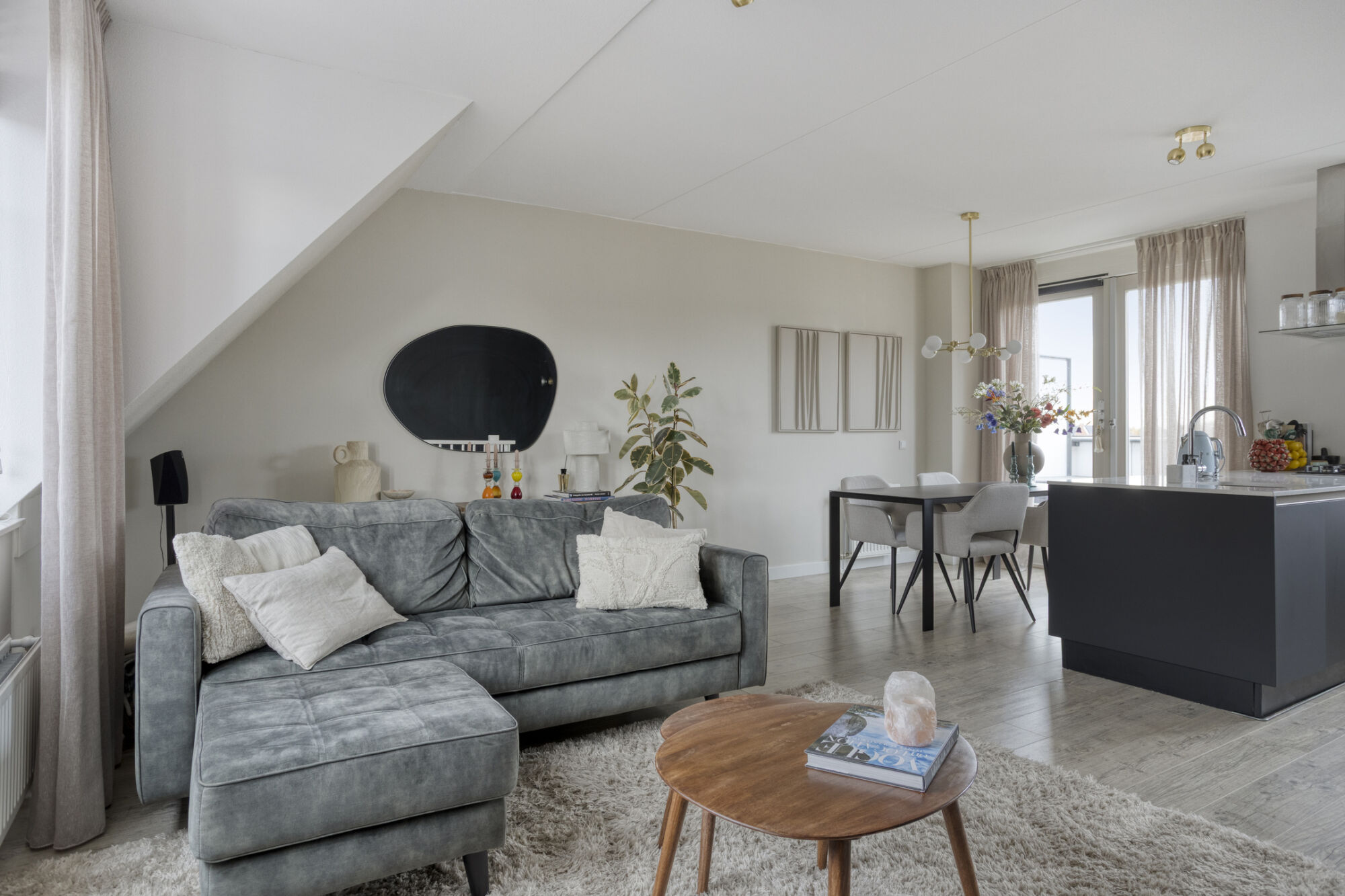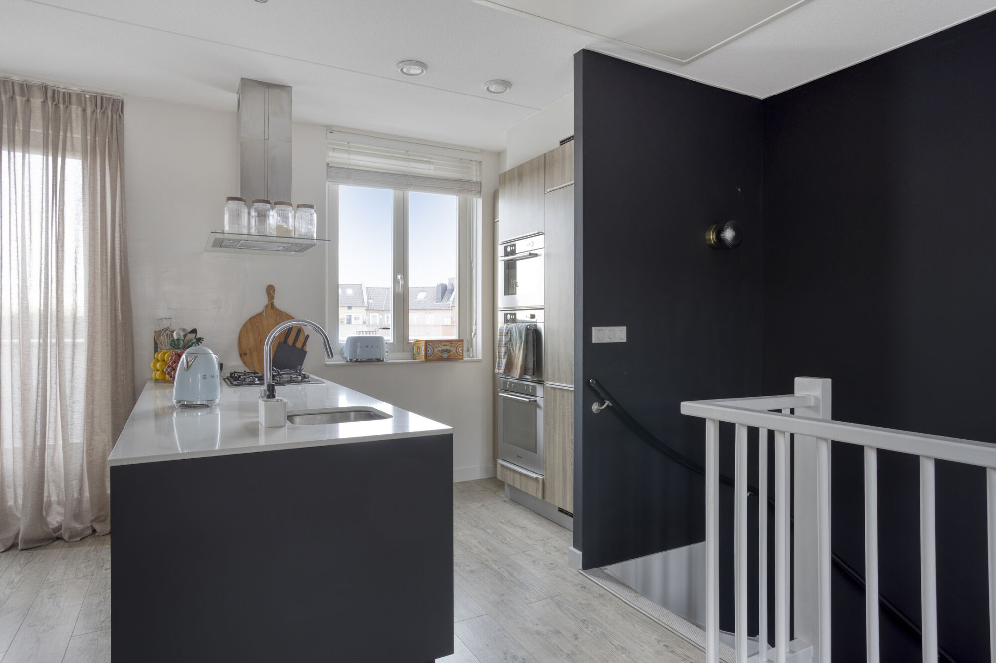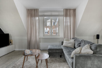 Via de trap komen we in de uiterst gezellige woonkamer, waar eveneens de mooie laminaatvloer ligt. Aan de voorzijde zorgt de grote dakkapel voor veel lichtinval, en aan de achterzijde bevindt zich het ruime terras met uitzicht op het fraaie binnenterrein met gezamenlijke daktuin. Het balkon is bereikbaar via de dubbele openslaande deuren. Hier kunt u heerlijk zitten met vrienden en familie.