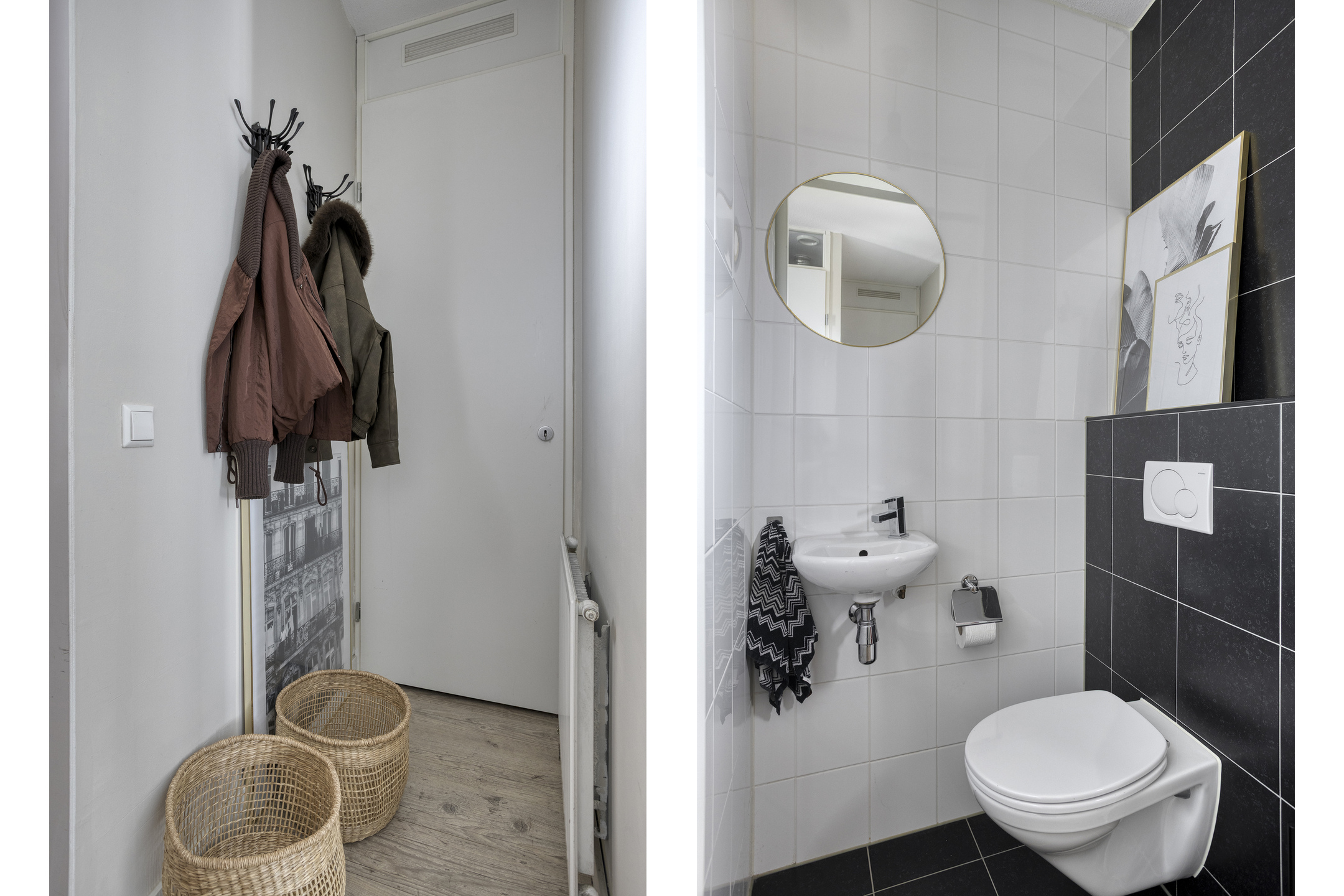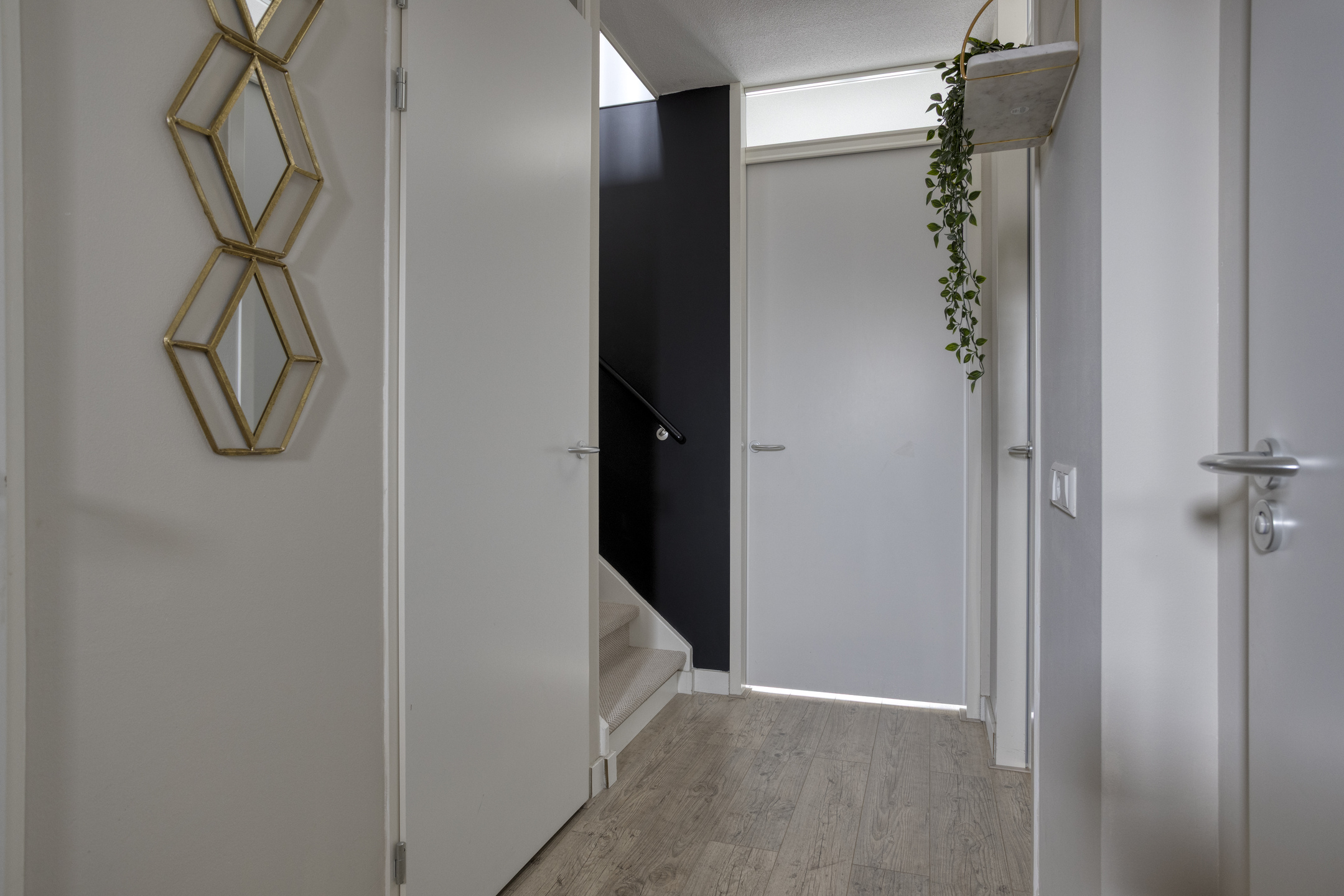 De centrale entree is voorzien van brievenbussen en een videofooninstallatie. Vanuit hier heeft u via de trap toegang tot de appartementen. Er is ook een gezamenlijke lift. Daarnaast bevindt zich op de begane grond een gemeenschappelijke fietsenberging en de privé parkeerplaats. Het appartement is gelegen op de 2e verdieping van het complex. Via de galerij bereikt u de voordeur.