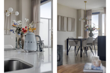 De moderne keukeninrichting is voorzien van een wit composiet werkblad en is verdeeld over een schiereiland en een vaste kastenwand. Het eiland is voorzien van een 4 pits gaskookplaat met afzuig, vaatwasser en spoelbak met kraan. De kastenwand is uitgerust met een aparte oven, magnetron, stoomoven, koelkast en diepvries. Kortom, als u van koken houdt dan kunt u hier uw gang gaan. Door de opstelling van de keuken heeft u altijd leuk contact met uw gasten aan de eettafel of de woonkamer.