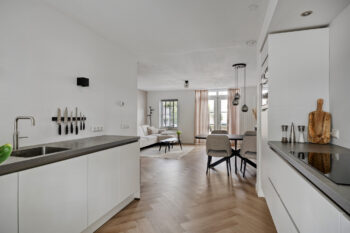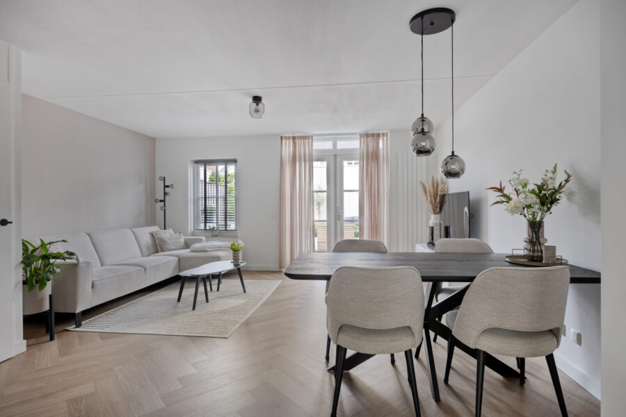 Het stijlvolle karakter van de hal wordt feilloos doorgetrokken in de open woonkamer. Vanuit de hal wordt de woonkamer bereikt via een grote glazen deur in een houten frame. De grote, open ruimte is verdeeld in een drie delen: de open keuken, een eetgedeelte en aan de achterzijde de lounge. De ruimte is zowel aan de voor- als achterzijde voorzien van grote raampartijen die samen met de frisse afwerking zorgen voor het luchtige karakter van de woning. Er is een trapkast aanwezig in de woonkamer.