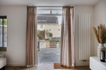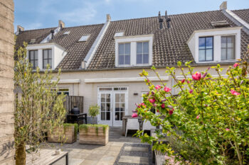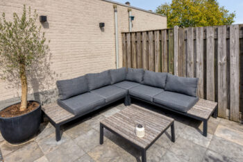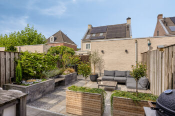 Via de dubbel openslaande tuindeuren aan de achterzijde van de woonkamer kom je in de bijzonder gezellige en praktisch ingerichte achtertuin. Er zijn twee terrasmogelijkheden gecreëerd: een voor een grote tuintafel en een voor een heerlijke loungeset.