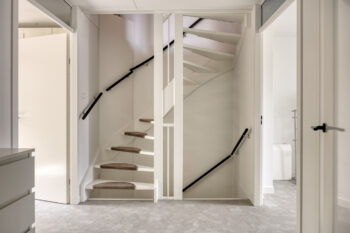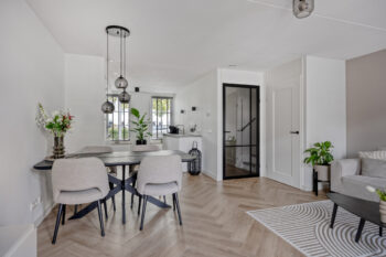 Je komt binnen in een ruime hal, waar meteen de toon voor de rest van de woning gezet wordt. Een prachtige, lichte visgraat PVC-vloer komt hier samen met hoogwaardig stucwerk op de wanden en het plafond. De hal geeft toegang tot de moderne meterkast, een stijlvolle toiletruimte, de trapopgang naar de eerste verdieping en natuurlijk de woonkamer. De toiletruimte is voorzien van een hangtoilet en een fonteintje met matzwart kraan- en leidingwerk, wat perfect past bij de combinatie van het stucwerk en de grote grijskleurige wand- en vloertegels.