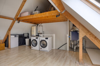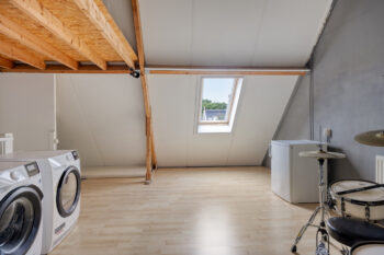Via de vaste trap bereiken we de grote, open zolder. Door zijn formaat en lichtinval is deze ruimte makkelijk te gebruiken als sportvertrek, hobbyruimte, muziekstudio of als bergruimte. Er is een entresolvloer aanwezig die als steekzolder gebruikt kan worden. Deze ruime zolderkamer is voorzien van een lichte laminaatvloer. Hier zijn ook de aansluitingen voor wasmachine en -droger te vinden, evenals de C.V.-ketel (Intergas, 2018) en de WTW-unit.