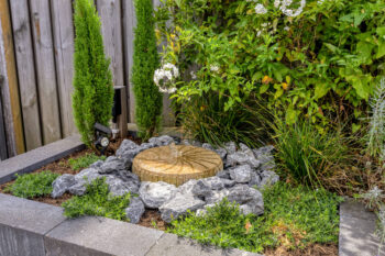 Er is een zonneluifel tegen de achtergevel gemonteerd. Hierdoor is een overdekte zit mogelijk. Via een grindpad met looptegels loop je verder de tuin in, waar ruimte vrijgemaakt is voor een lounge set. Aan de zijkant van het pad zijn plantenbakken gemaakt die de tuin haar groene en rustgevende uitstraling geven. Achterin de tuin is een houten berging te vinden, met daarnaast een poort naar het achtergelegen pad waarmee de straat te bereiken is.