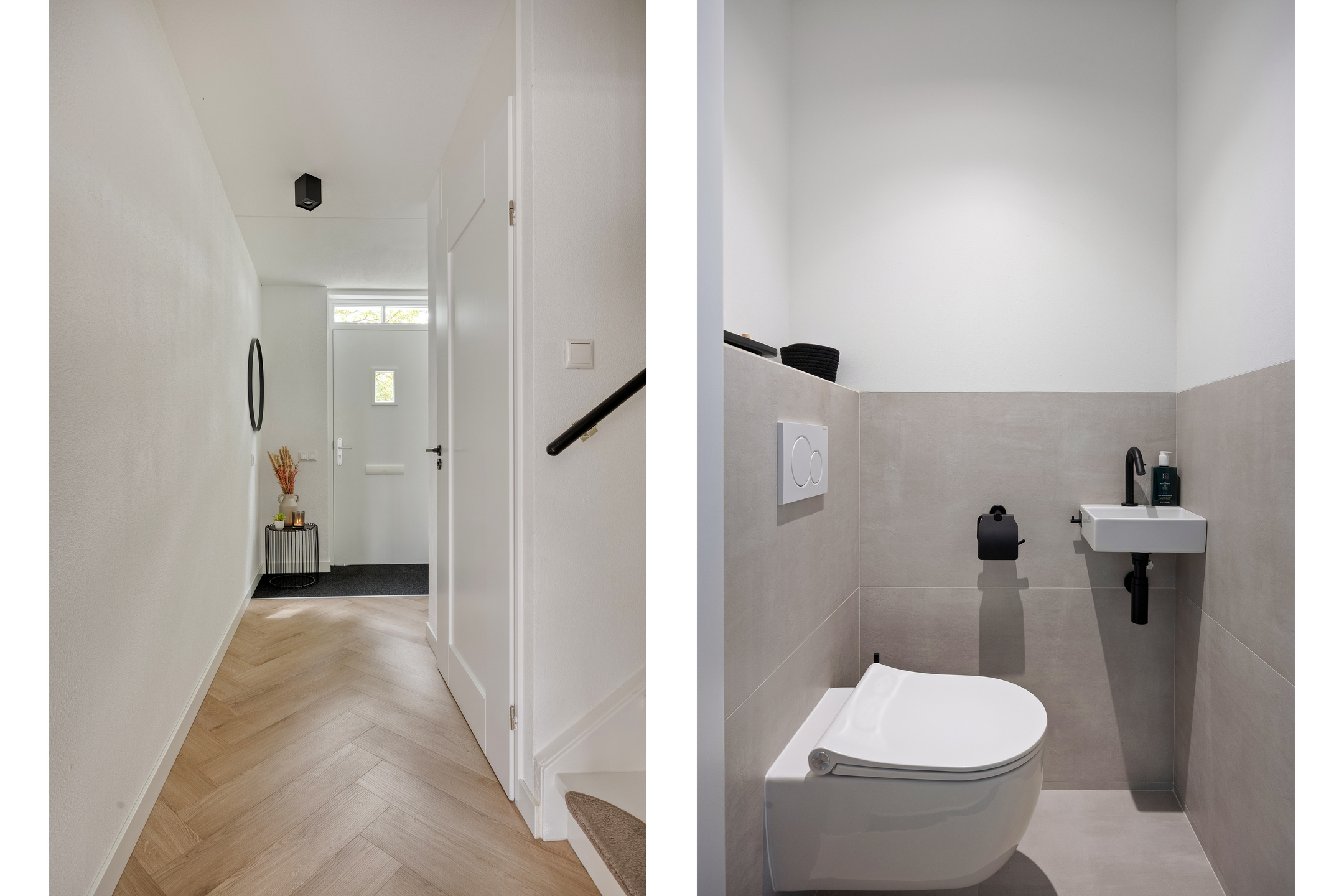 Je komt binnen in een ruime hal, waar meteen de toon voor de rest van de woning gezet wordt. Een prachtige, lichte visgraat PVC-vloer komt hier samen met hoogwaardig stucwerk op de wanden en het plafond. De hal geeft toegang tot de moderne meterkast, een stijlvolle toiletruimte, de trapopgang naar de eerste verdieping en natuurlijk de woonkamer. De toiletruimte is voorzien van een hangtoilet en een fonteintje met matzwart kraan- en leidingwerk, wat perfect past bij de combinatie van het stucwerk en de grote grijskleurige wand- en vloertegels.