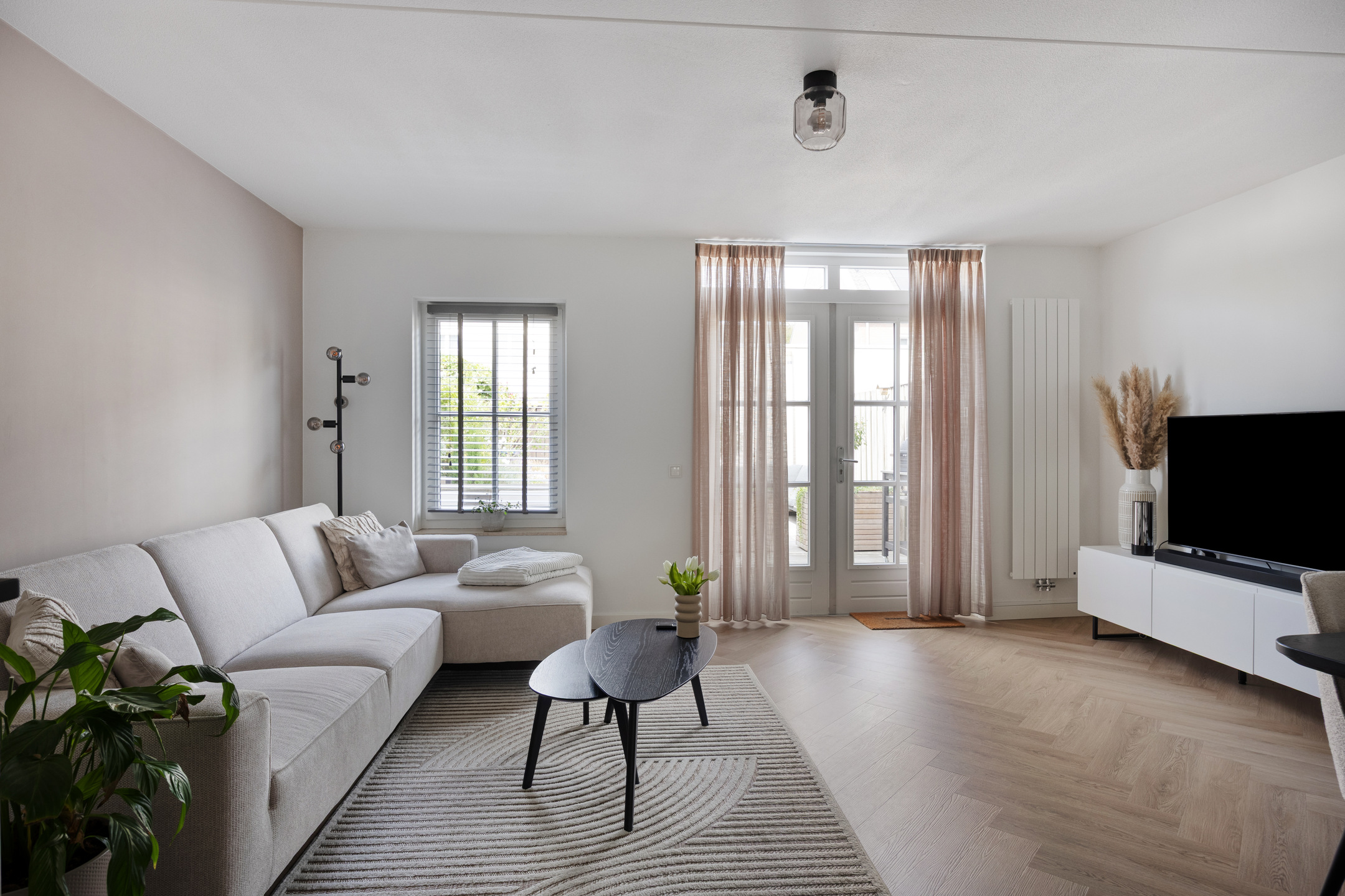 Het stijlvolle karakter van de hal wordt feilloos doorgetrokken in de open woonkamer. Vanuit de hal wordt de woonkamer bereikt via een grote glazen deur in een houten frame. De grote, open ruimte is verdeeld in een drie delen: de open keuken, een eetgedeelte en aan de achterzijde de lounge. De ruimte is zowel aan de voor- als achterzijde voorzien van grote raampartijen die samen met de frisse afwerking zorgen voor het luchtige karakter van de woning. Er is een trapkast aanwezig in de woonkamer.