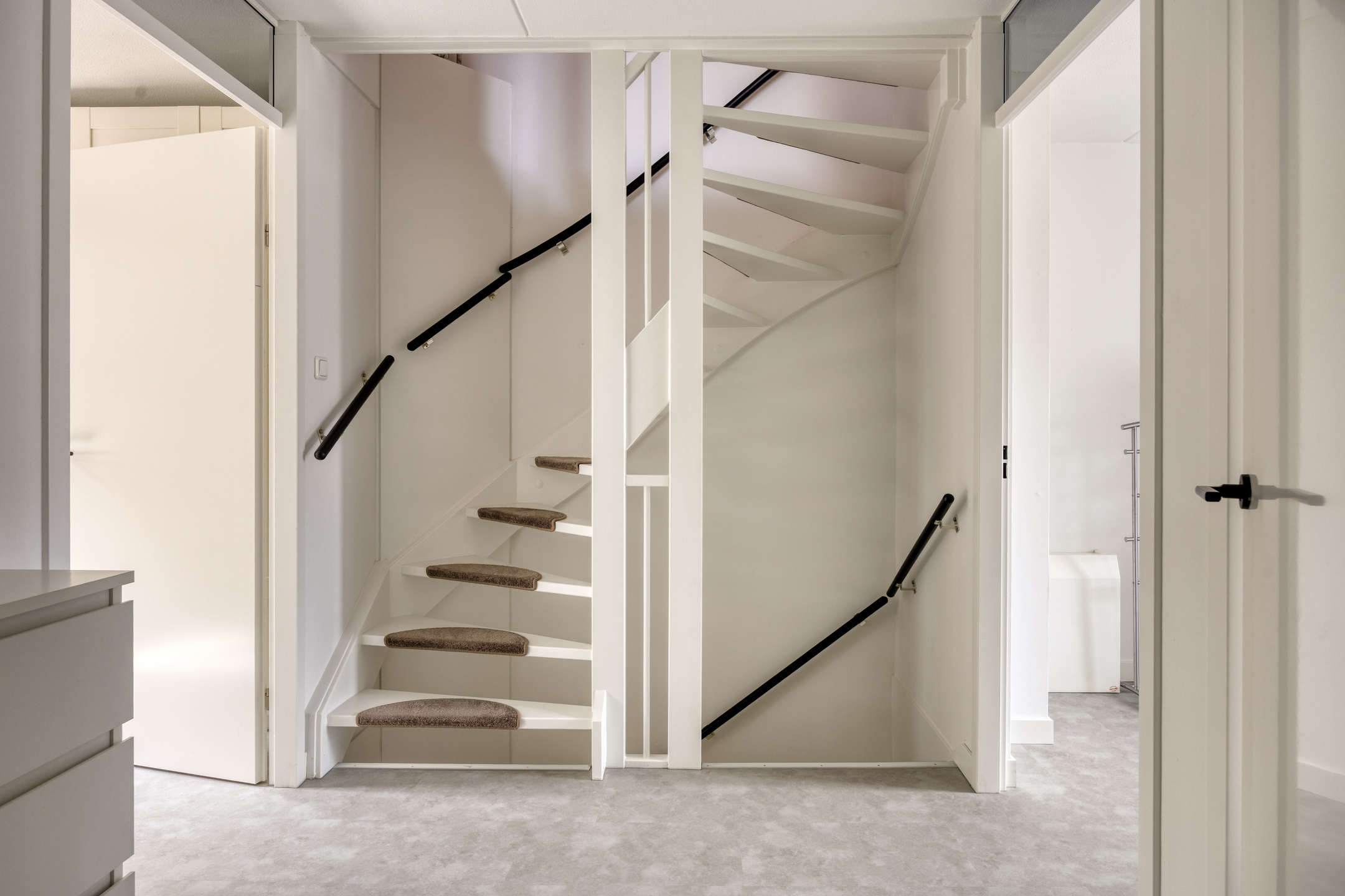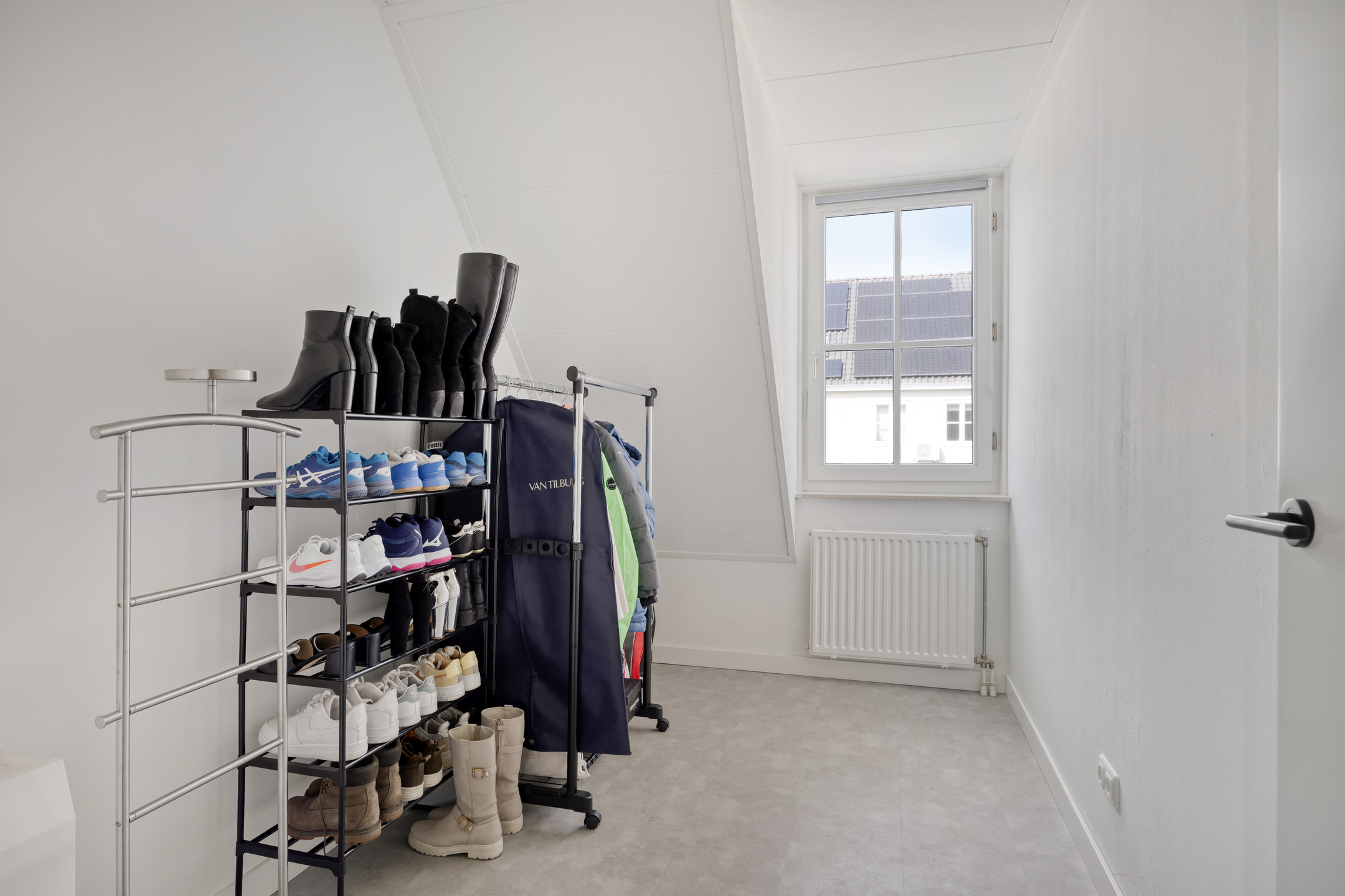 Via de vaste trap bereiken we de grote, open zolder. Door zijn formaat en lichtinval is deze ruimte makkelijk te gebruiken als sportvertrek, hobbyruimte, muziekstudio of als bergruimte. Er is een entresolvloer aanwezig die als steekzolder gebruikt kan worden. Deze ruime zolderkamer is voorzien van een lichte laminaatvloer. Hier zijn ook de aansluitingen voor wasmachine en -droger te vinden, evenals de C.V.-ketel (Intergas, 2018) en de WTW-unit.