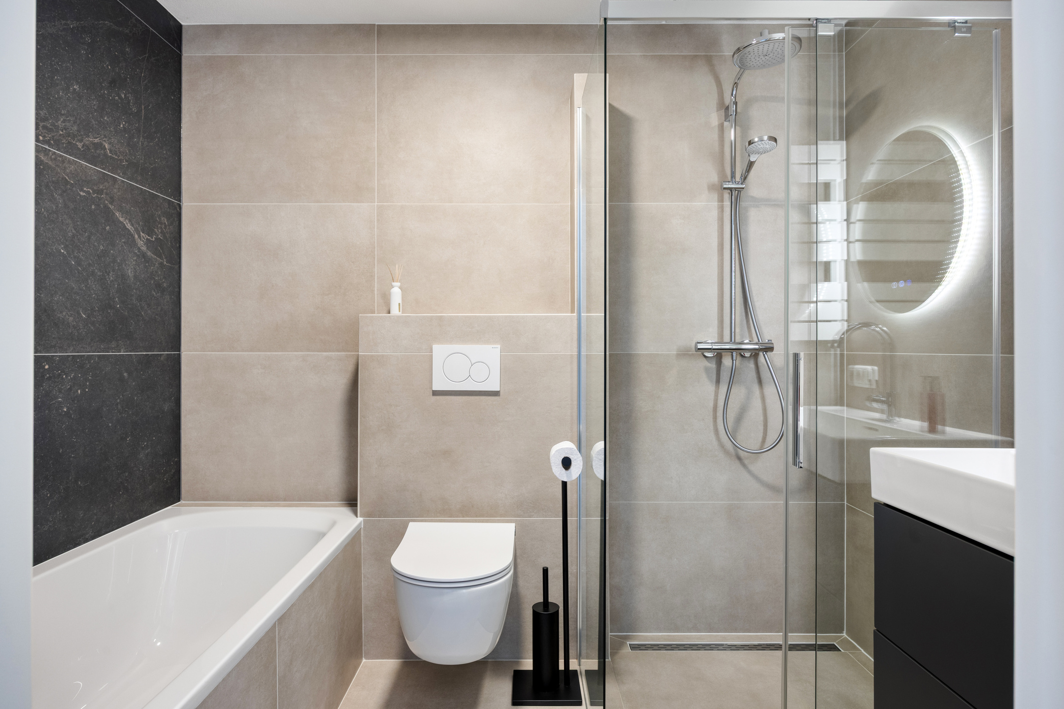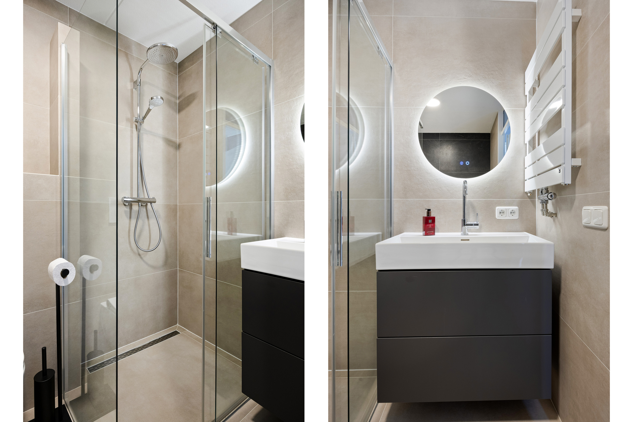 In 2024 is de badkamer vernieuwd, en wat een resultaat! Grote wand- en vloertegels in aardse kleuren combineren prachtig met het donkergekleurde wastafelmeubel en het geheel wordt afgemaakt door de spiegel met LED-verlichting. In de badkamer zijn een inloopdouche met regenfunctie, een ligbad, een toilet, een wastafelmeubel en een handdoekradiator te vinden. Tevens is er mechanische ventilatie aanwezig.