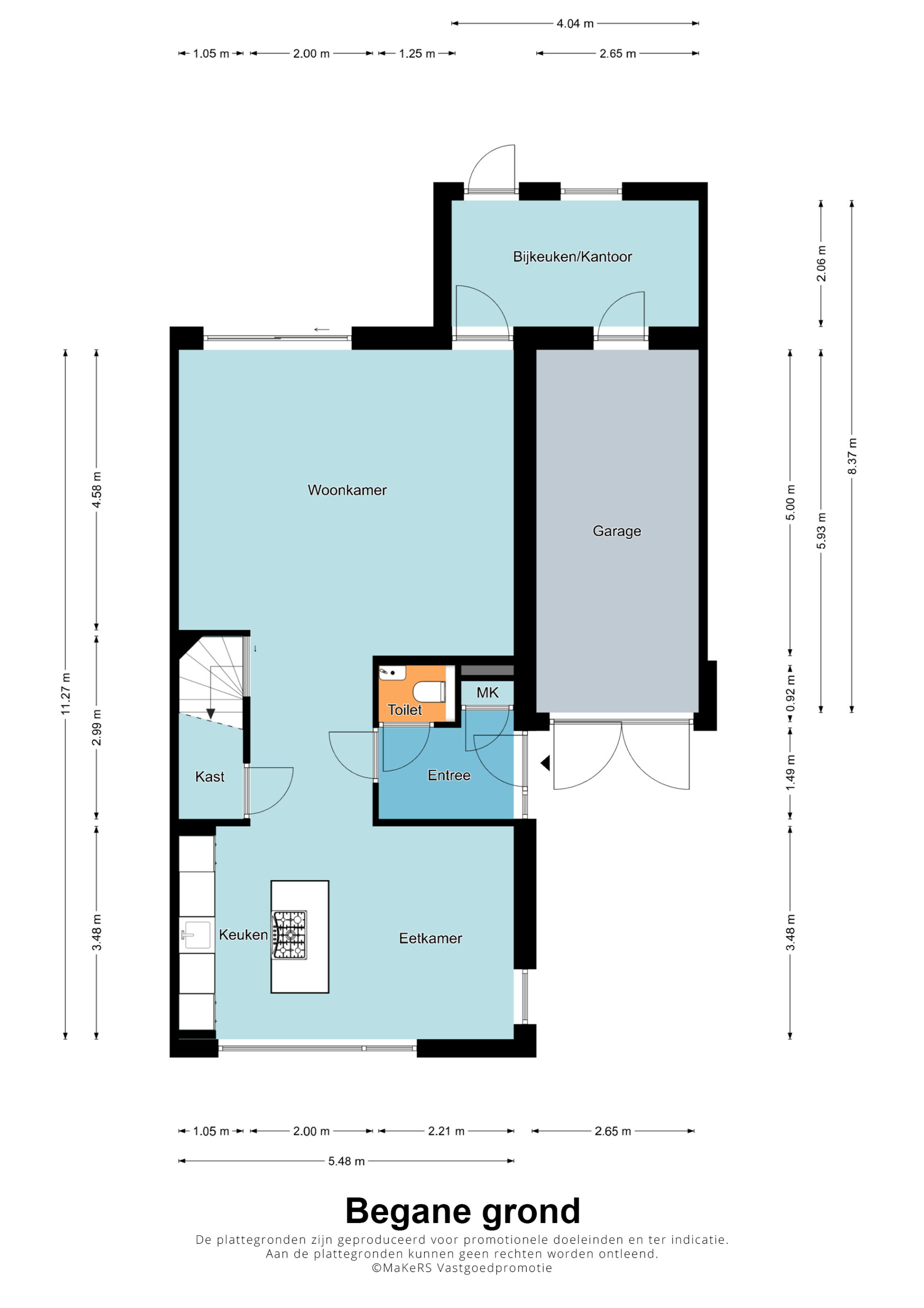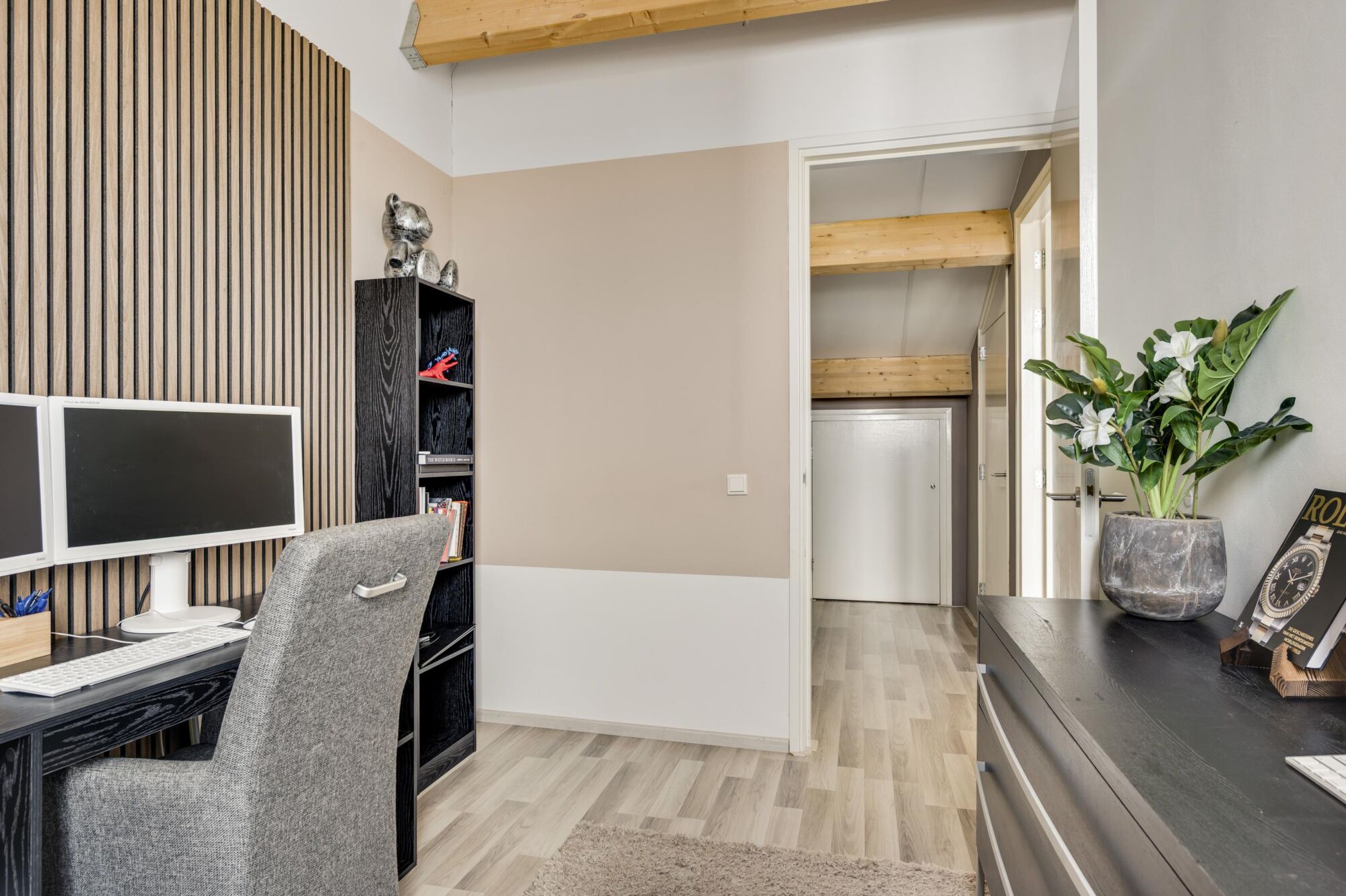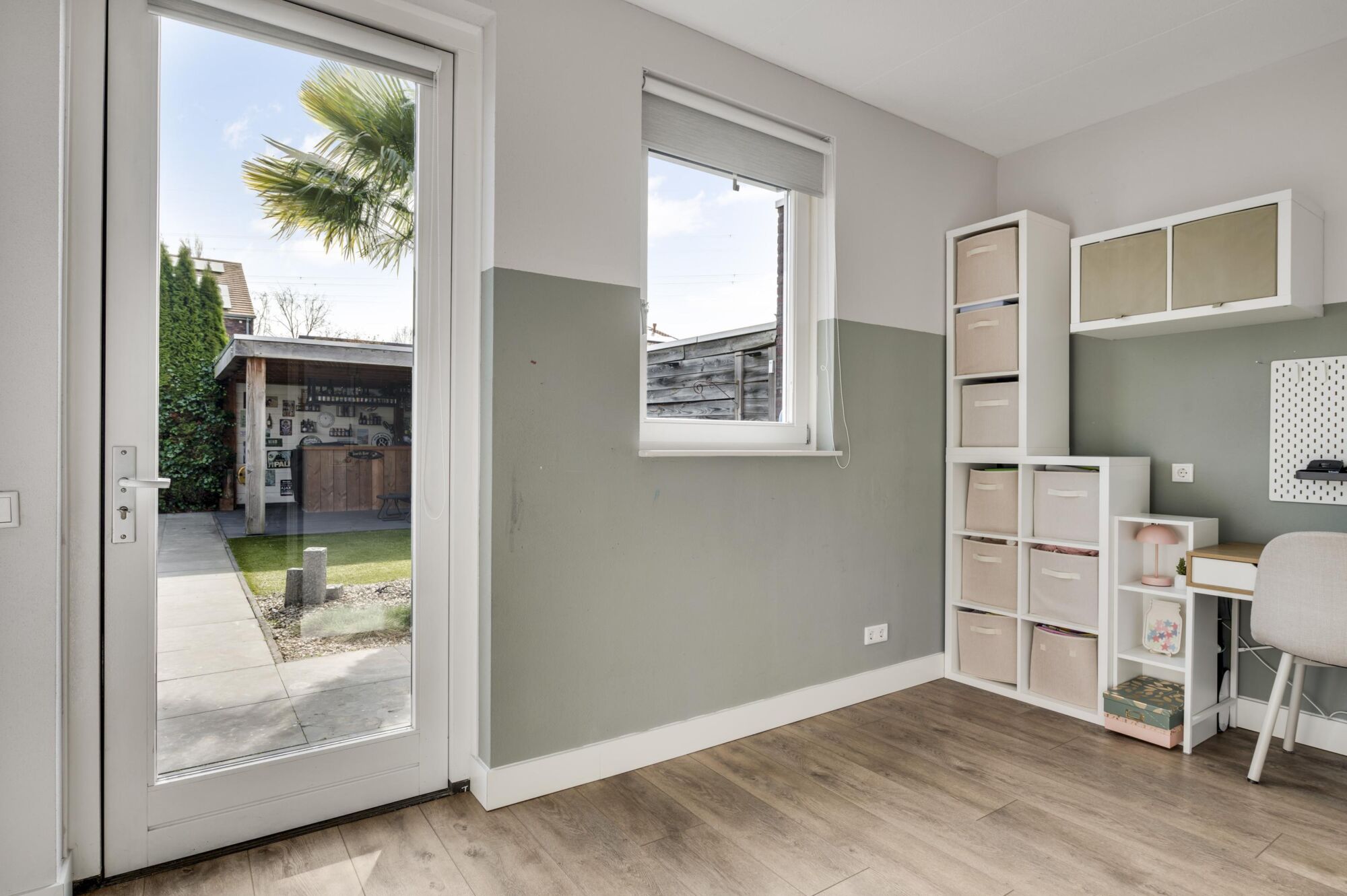 Vanuit de living ga je naar de opvallend ruime voormalige bijkeuken welke ideaal dienst doet als speel- of werkkamer door zijn grootte. De vloer is hier ook weer belegd met de fraaie pvc vloer maar hier niet voorzien van vloerverwarming maar is een airco aanwezig voor zowel verwarming als verkoeling. Vanuit deze ruimte bereik je de achtertuin en de inpandige garage.