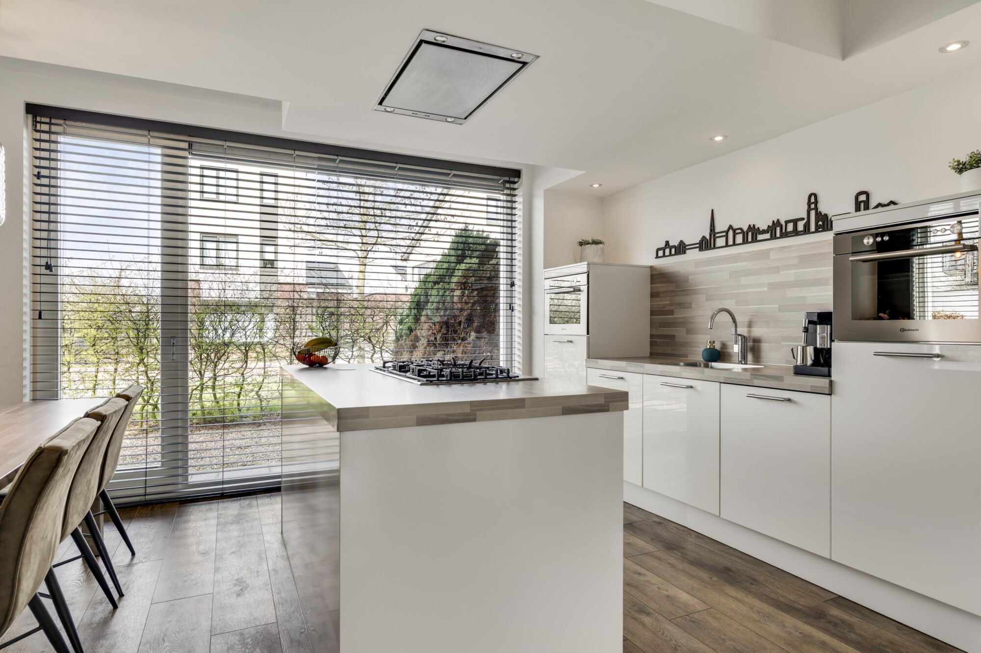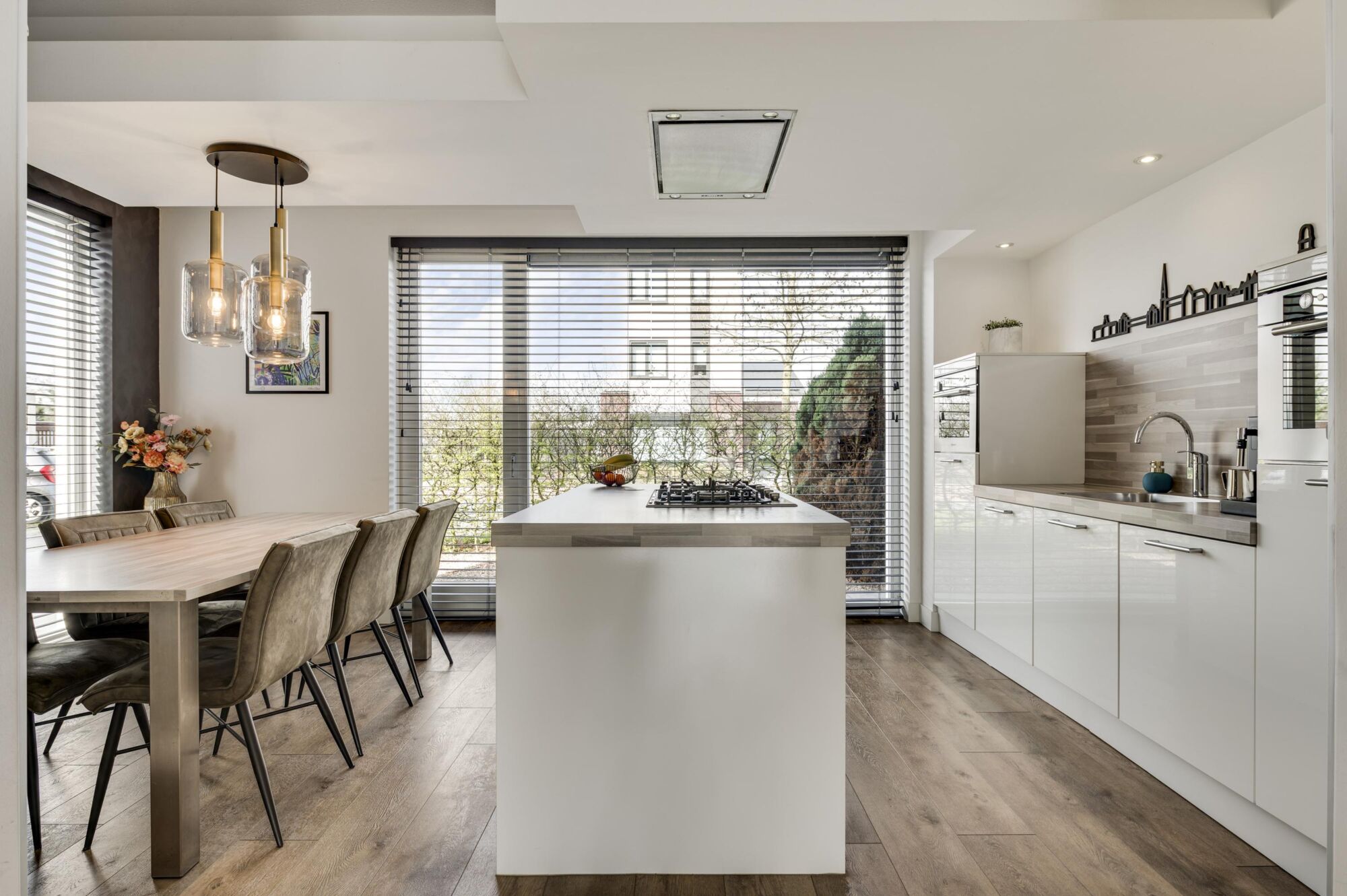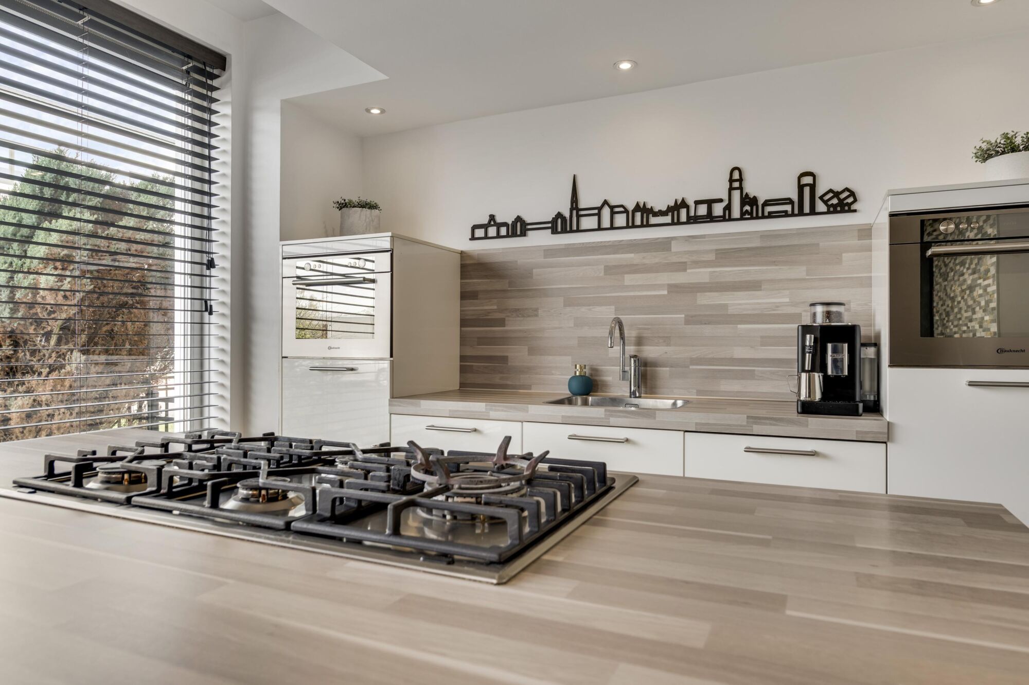 Aan de voorzijde bevindt zich de royale open keuken. Naast dat je hier een ruime eettafel kunt plaatsen, valt ook de grote hoeveelheid lichtinval op, wat overigens voor de rest van de woning eveneens geldt. De prachtige keuken met kookeiland en wandopstelling is van alle gemakken voorzien, zoals twee koelkasten (waarvan één met vriesvak), twee combimagnetrons, een 5-pits kooktoestel met wokbrander en een in het plafond geïntegreerde afzuigkap. Het geheel is zeer modern en strak afgewerkt.