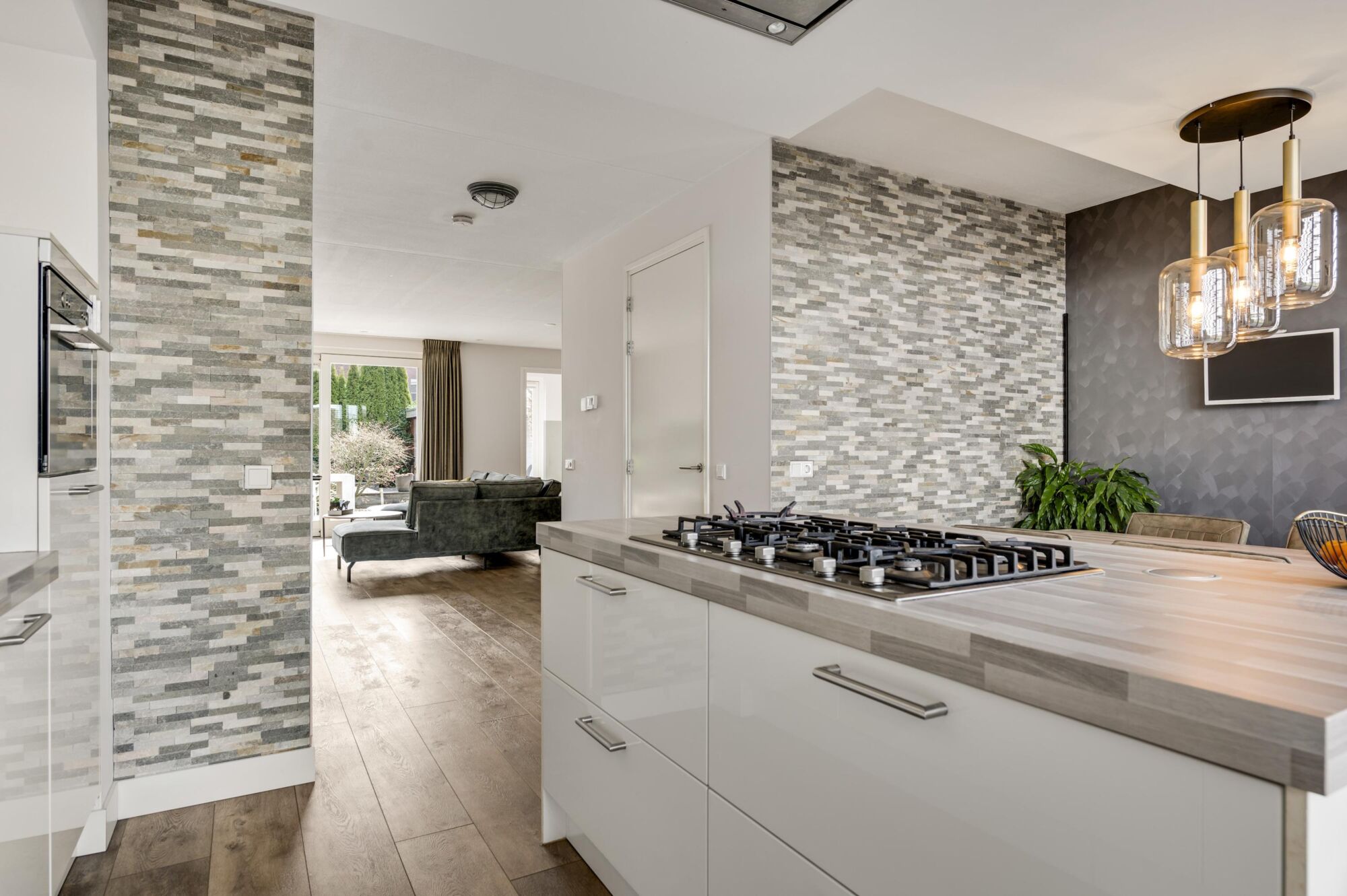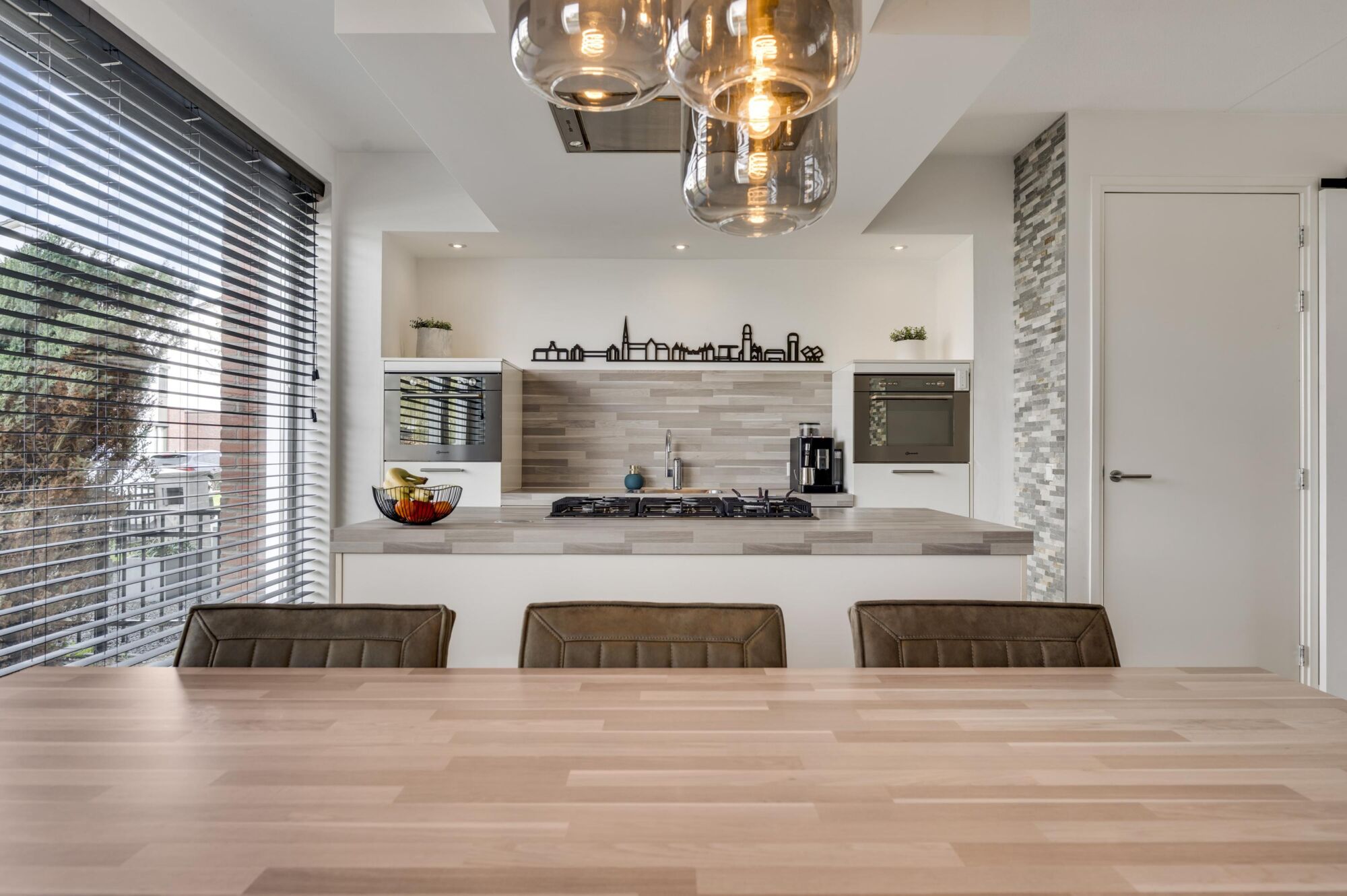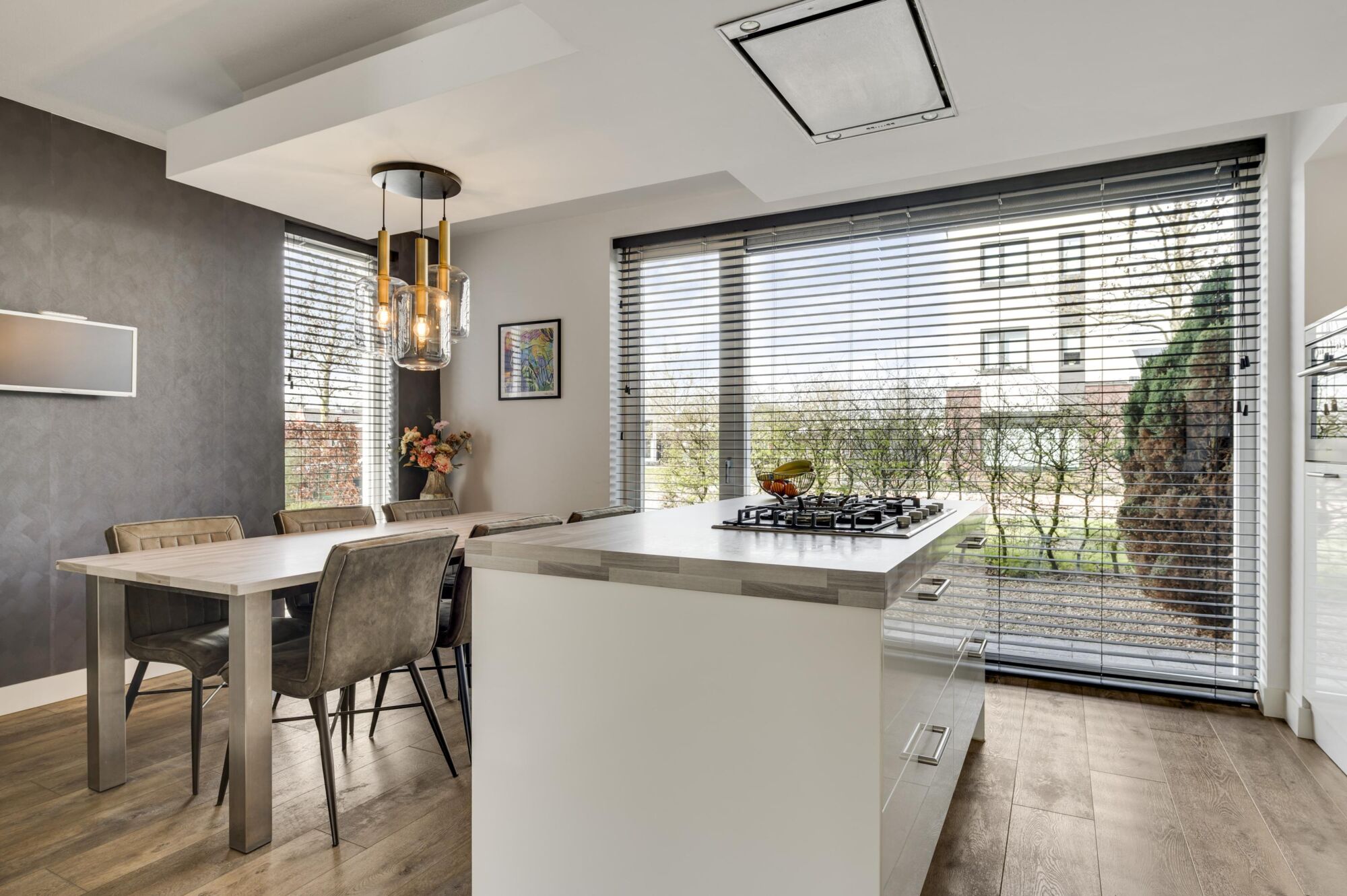 Aan de voorzijde bevindt zich de royale open keuken. Naast dat je hier een ruime eettafel kunt plaatsen, valt ook de grote hoeveelheid lichtinval op, wat overigens voor de rest van de woning eveneens geldt. De prachtige keuken met kookeiland en wandopstelling is van alle gemakken voorzien, zoals twee koelkasten (waarvan één met vriesvak), twee combimagnetrons, een 5-pits kooktoestel met wokbrander en een in het plafond geïntegreerde afzuigkap. Het geheel is zeer modern en strak afgewerkt.