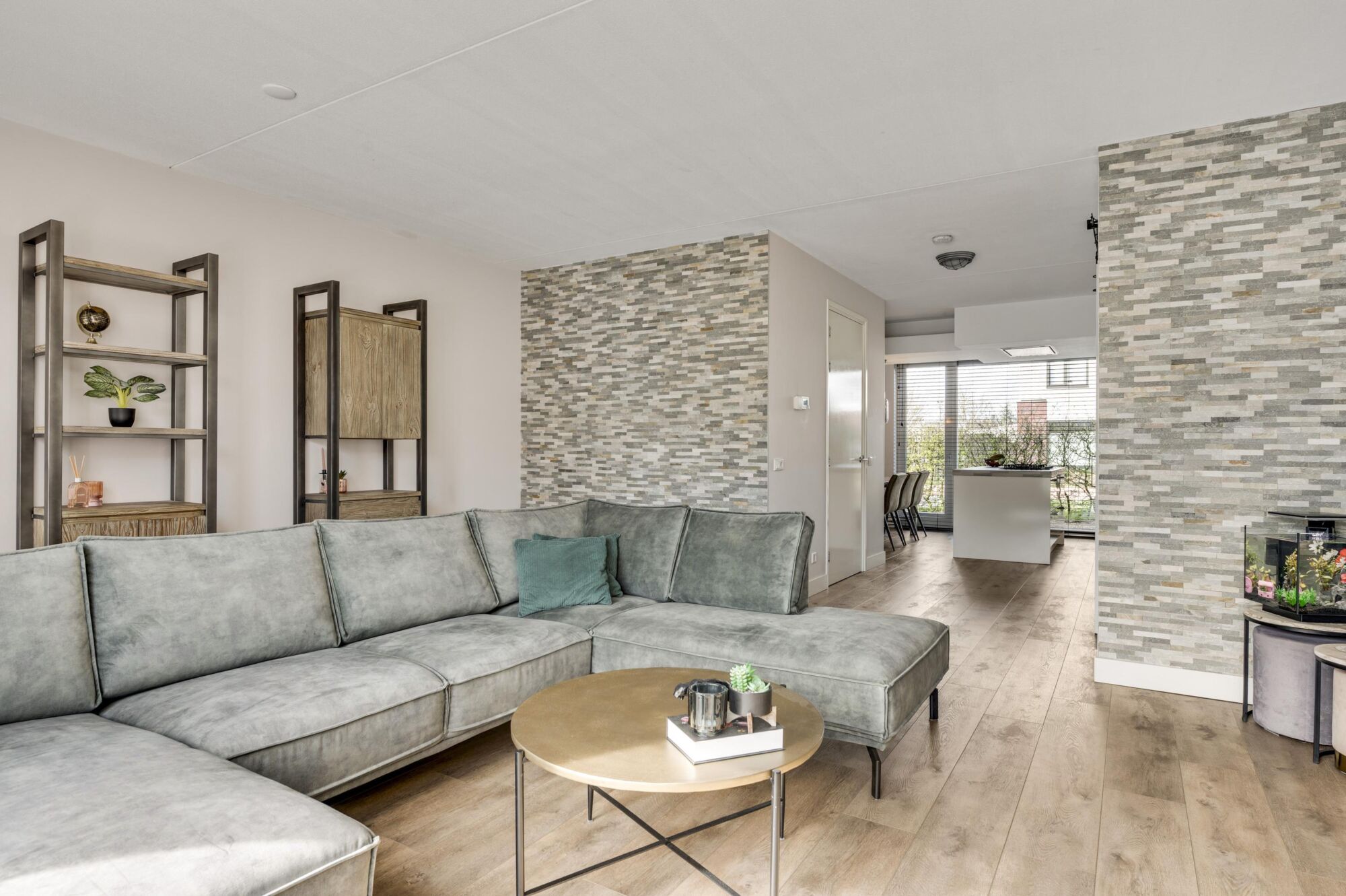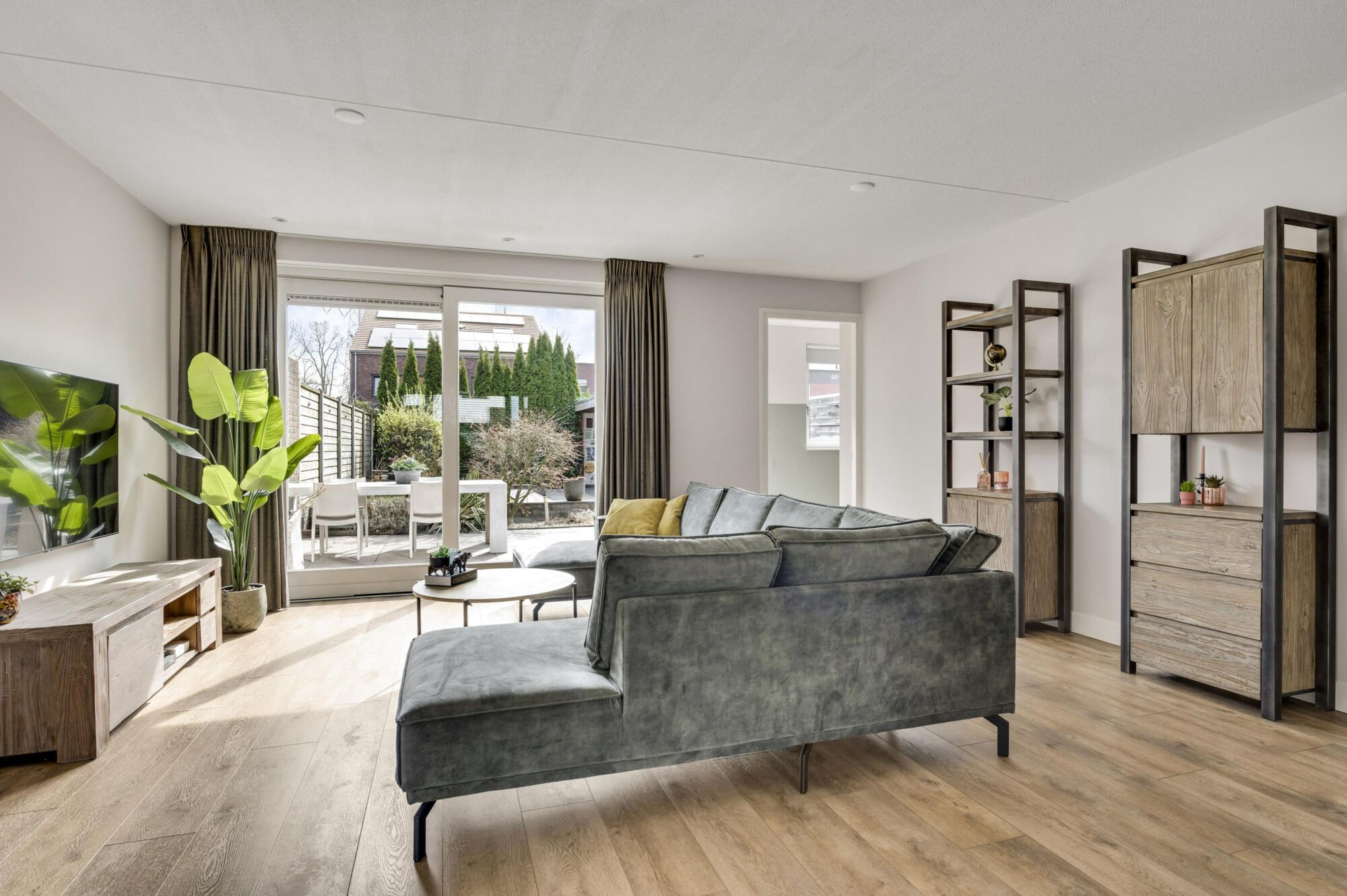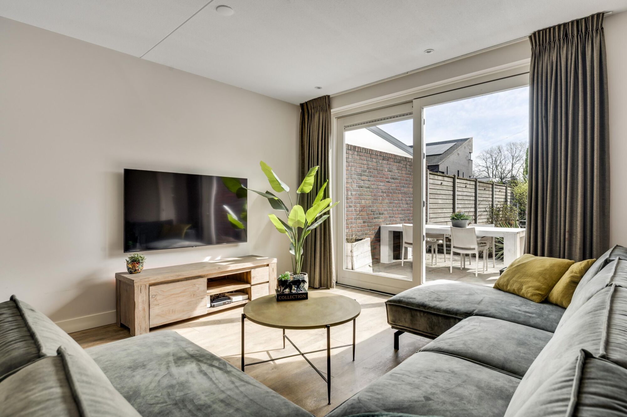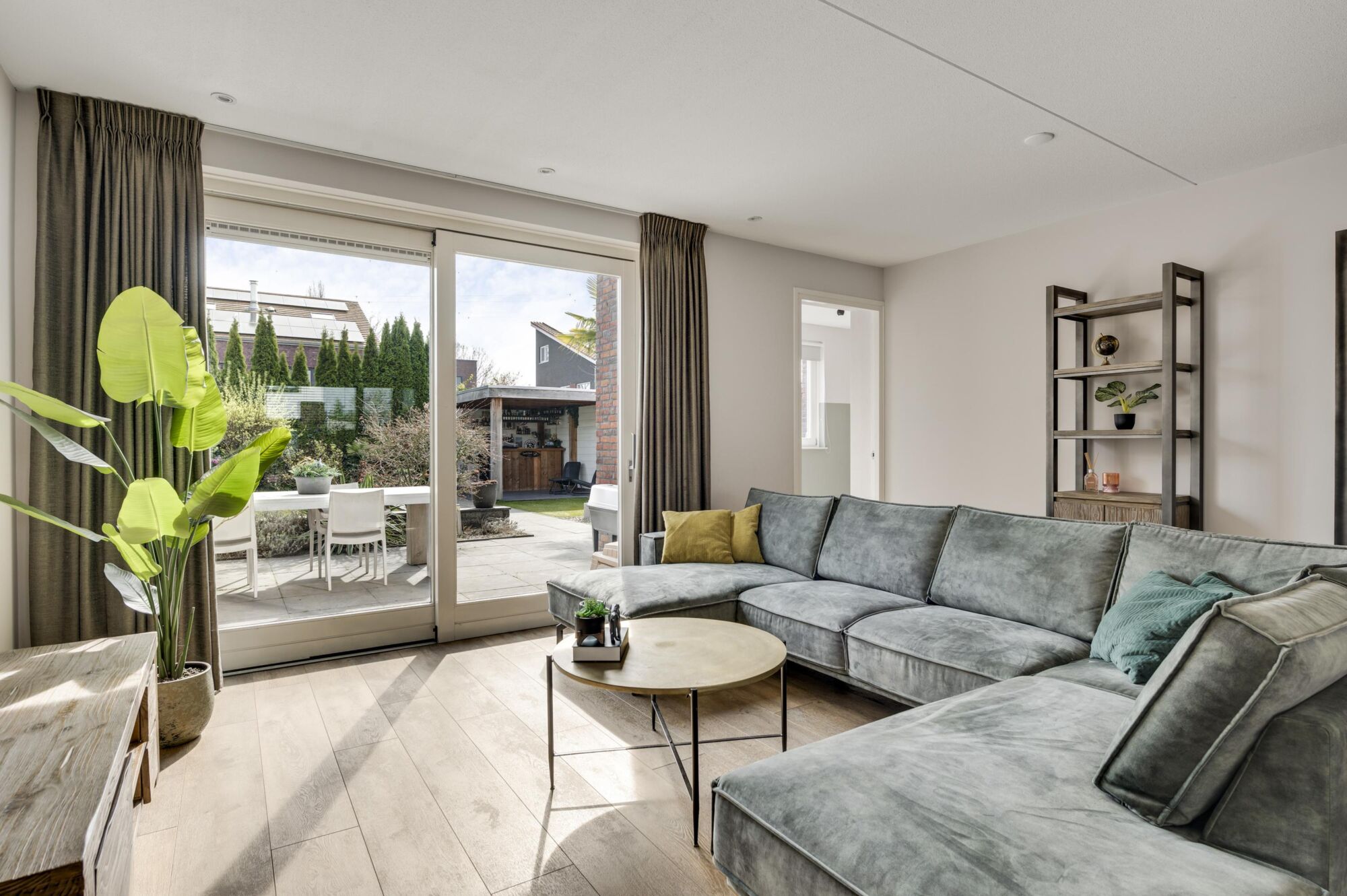 Aan de achterzijde bevindt zich de royale living. Ook hier valt de verrassend goede lichtinval op. De brede schuifpui geeft toegang tot het terras en de tuin.