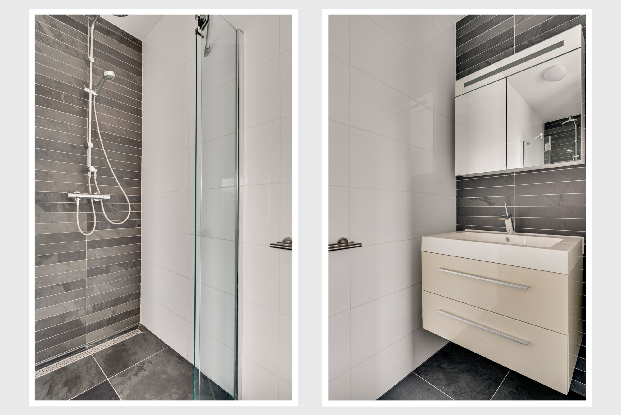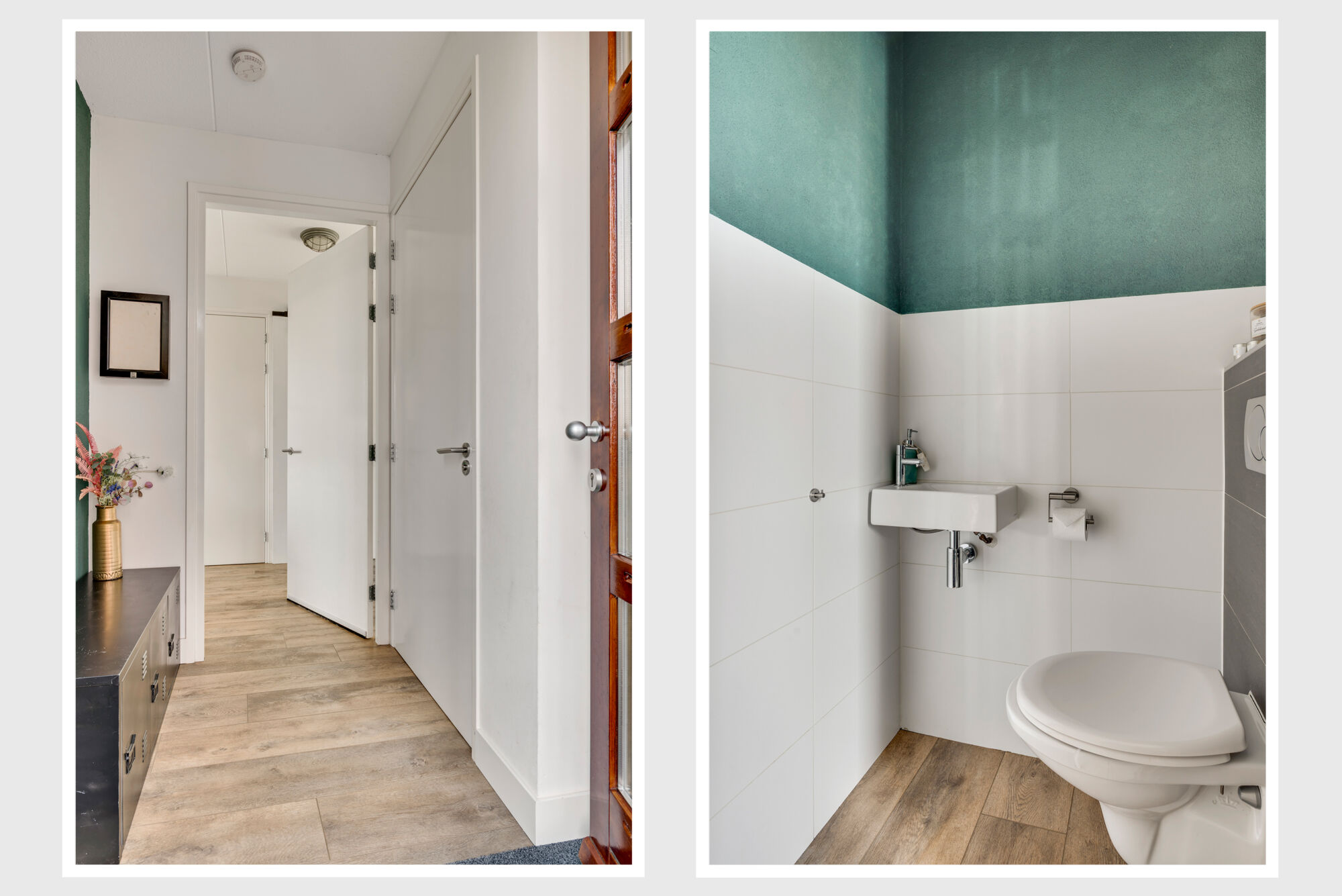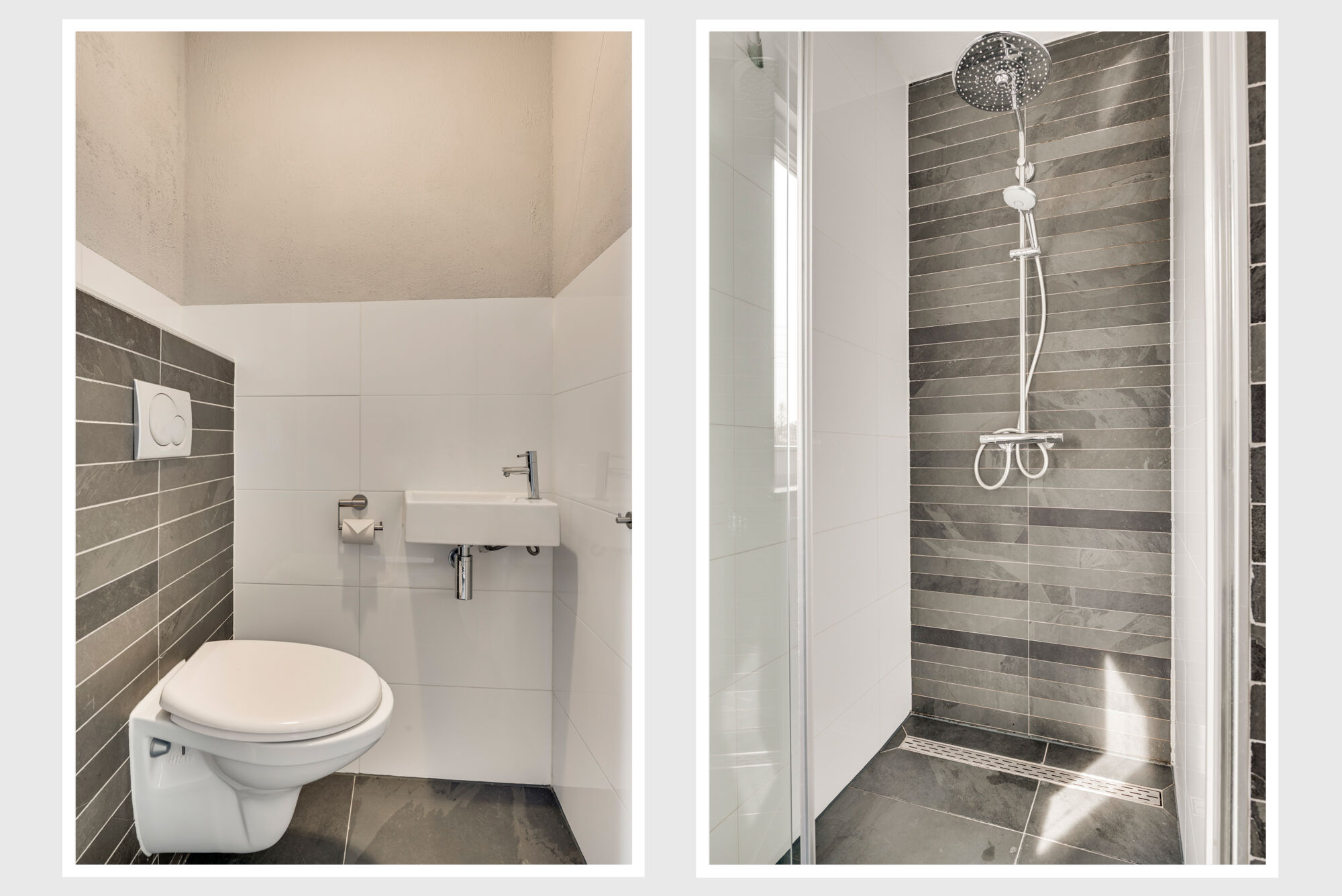 Daarnaast is er vanaf de overloop een moderne, aparte toiletruimte bereikbaar, uitgerust met een wandcloset en een fonteintje.