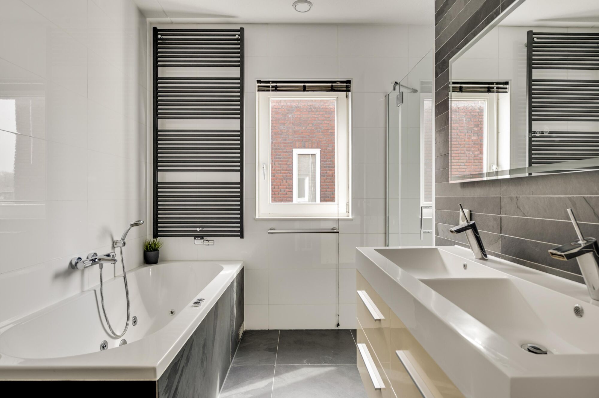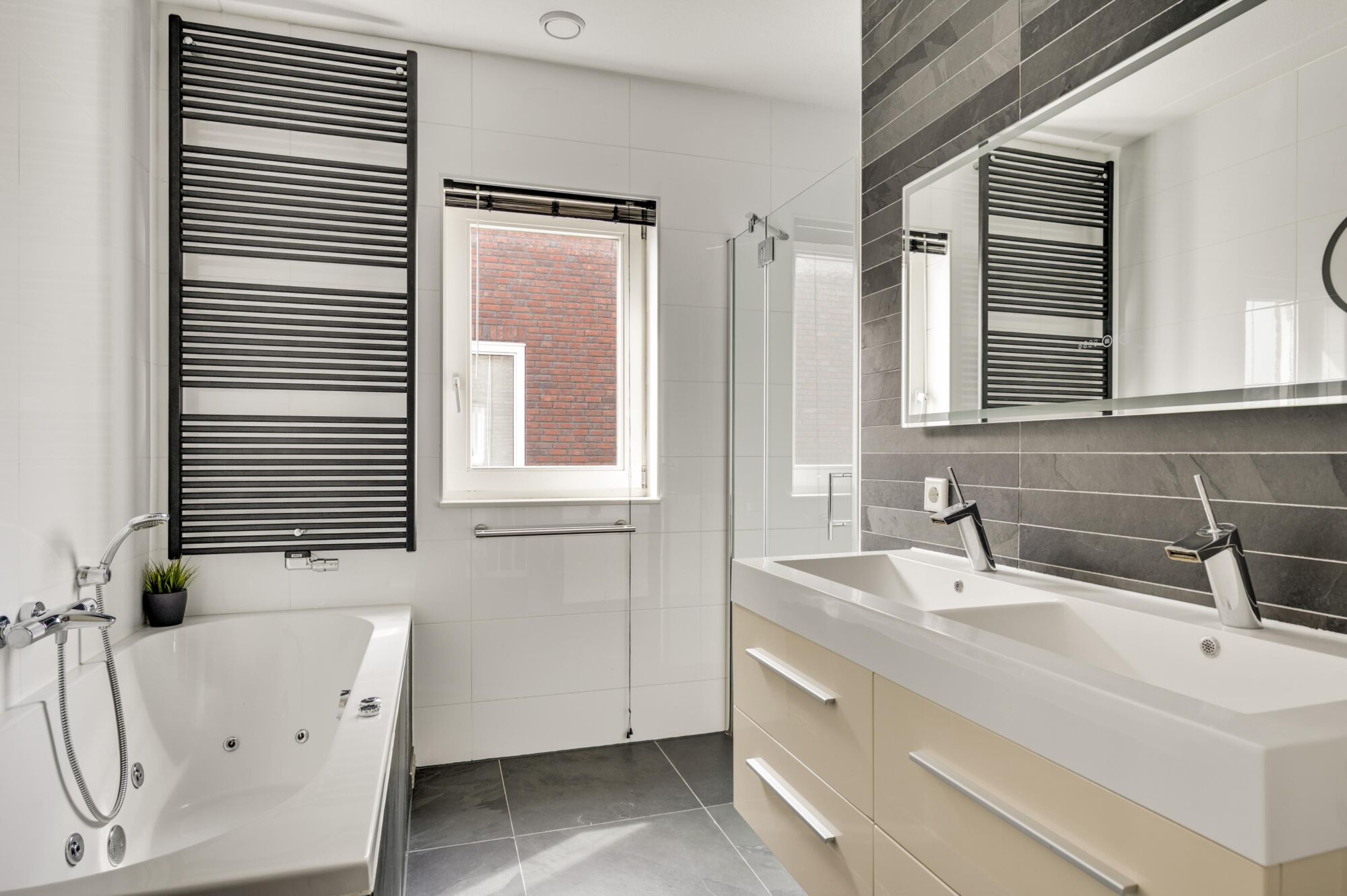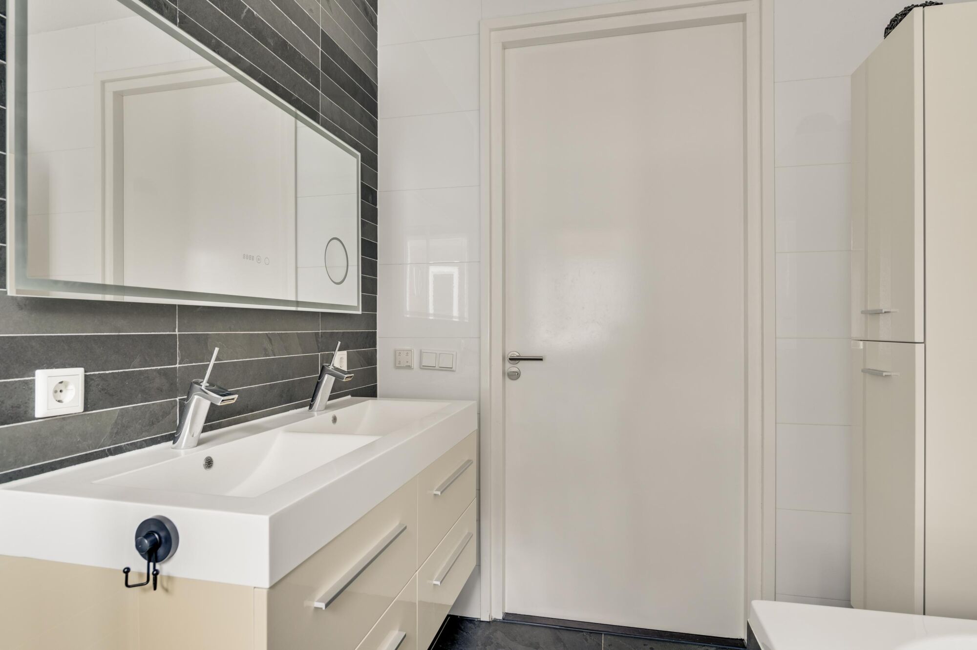 De eerste verdieping beschikt over een luxe badkamer en een aparte toiletruimte. De fraaie hoofdbadkamer is van alle gemakken voorzien, met een whirlpool, een inloopdouche met glazen scherm en een badmeubel met twee wastafels en een grote, brede spiegel. Het grote raam aan de zijkant zorgt voor veel natuurlijke lichtinval en extra ventilatie, terwijl de mechanische ventilatie het comfort compleet maakt.