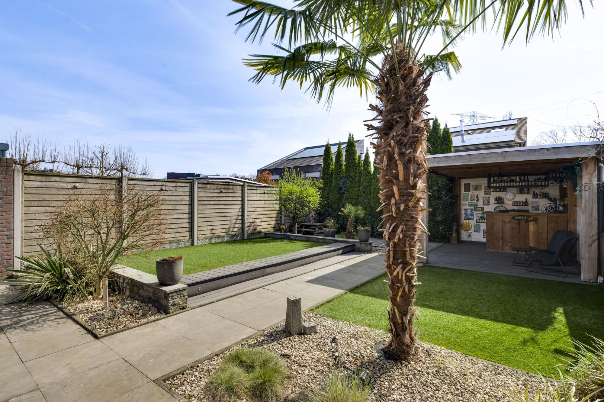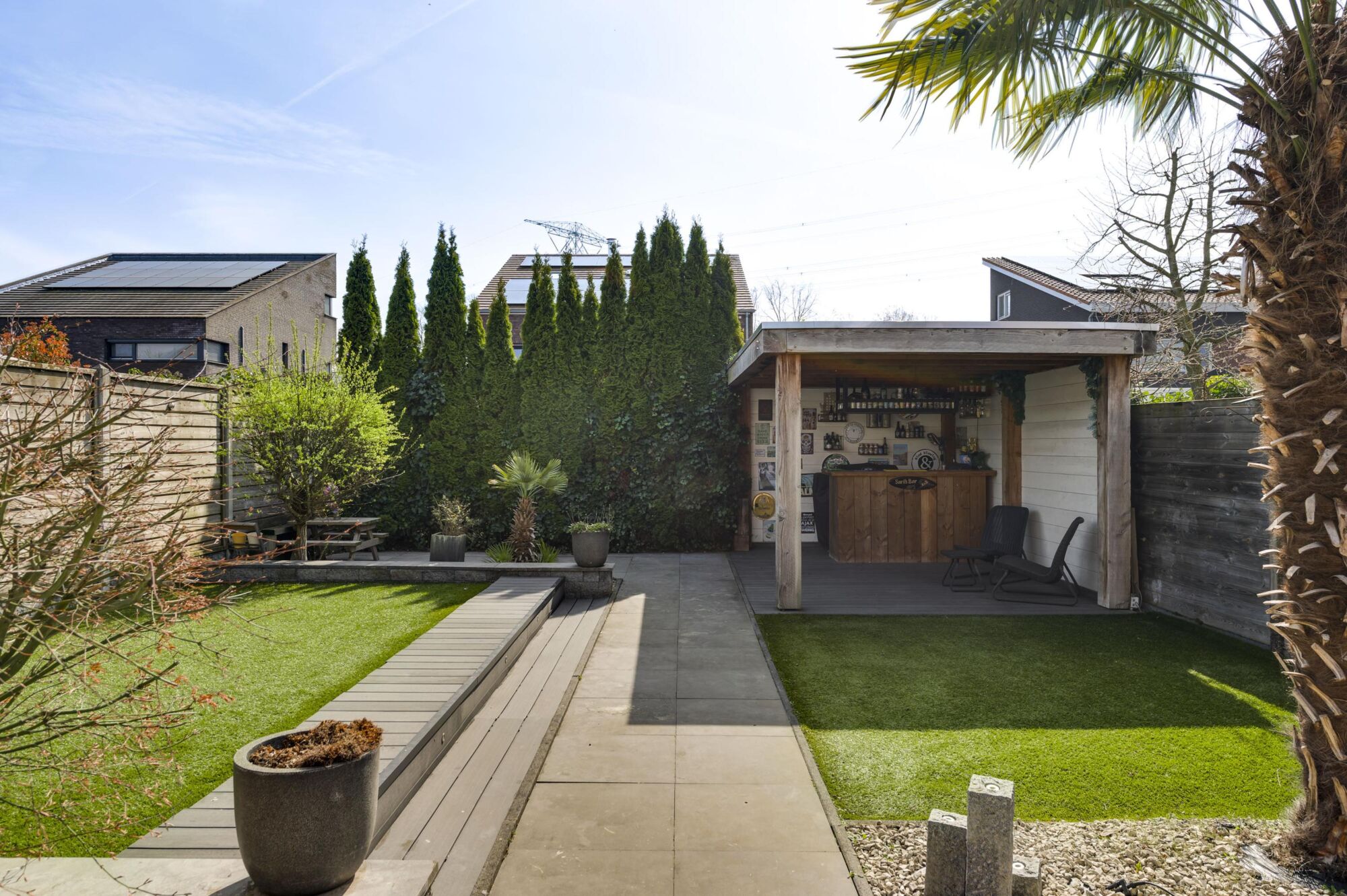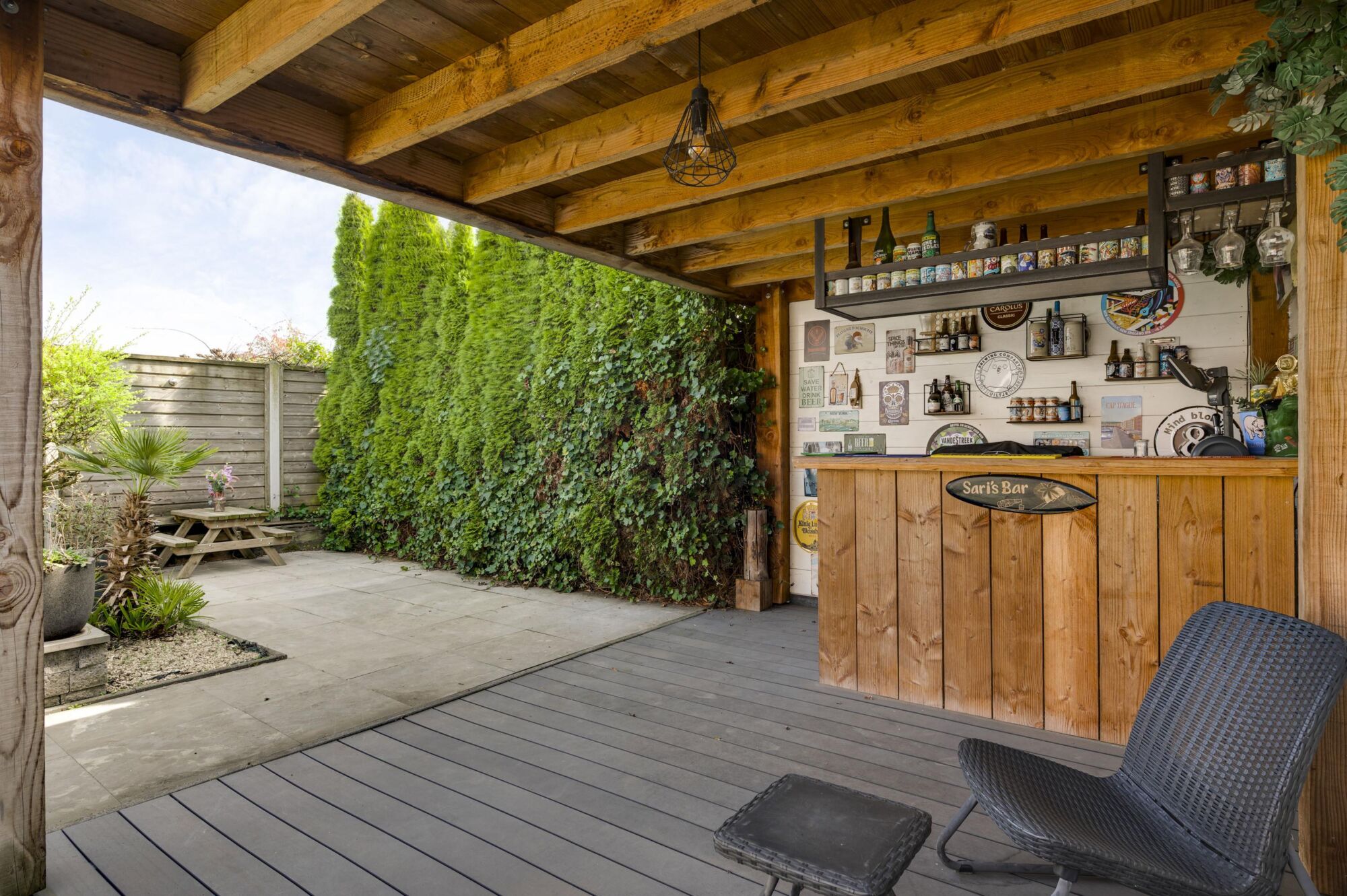 De prachtig aangelegde tuin is bovendien zonnig gelegen op het zuiden. De geheel omheinde achtertuin van circa 13 meter diep en 9 meter breed biedt niet alleen veel ruimte, maar ook veel privacy. Direct bij de achtergevel van het huis bevindt zich een groot terras, en achterin de tuin staat een fraaie overkapping met terras en bar.