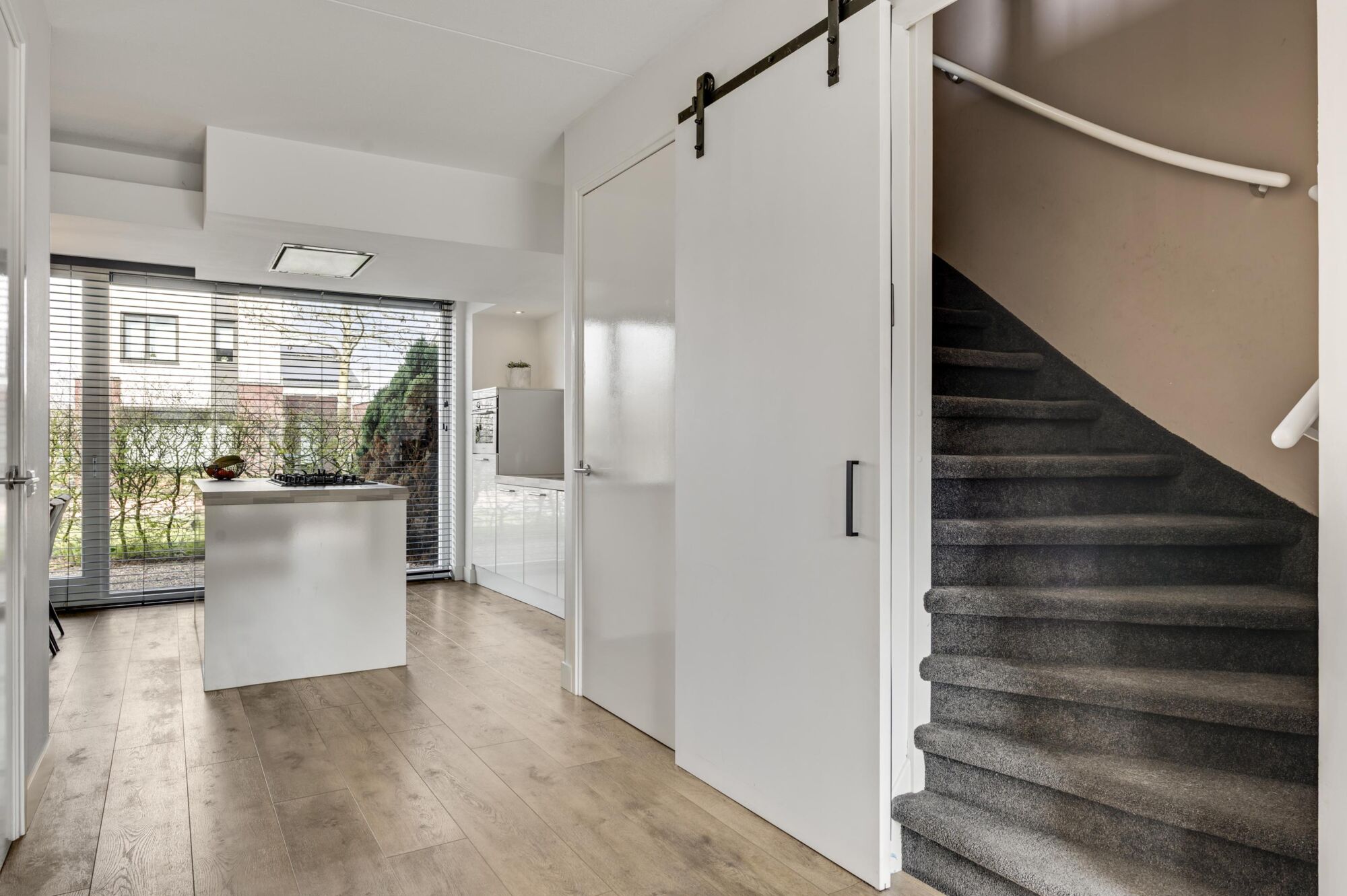 Via een schuifdeur in de living bereik je de trap naar de eerste verdieping. Aan de achterzijde bevindt zich de royale