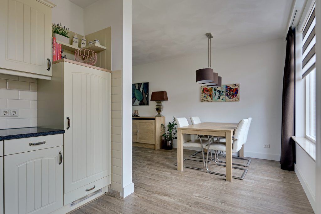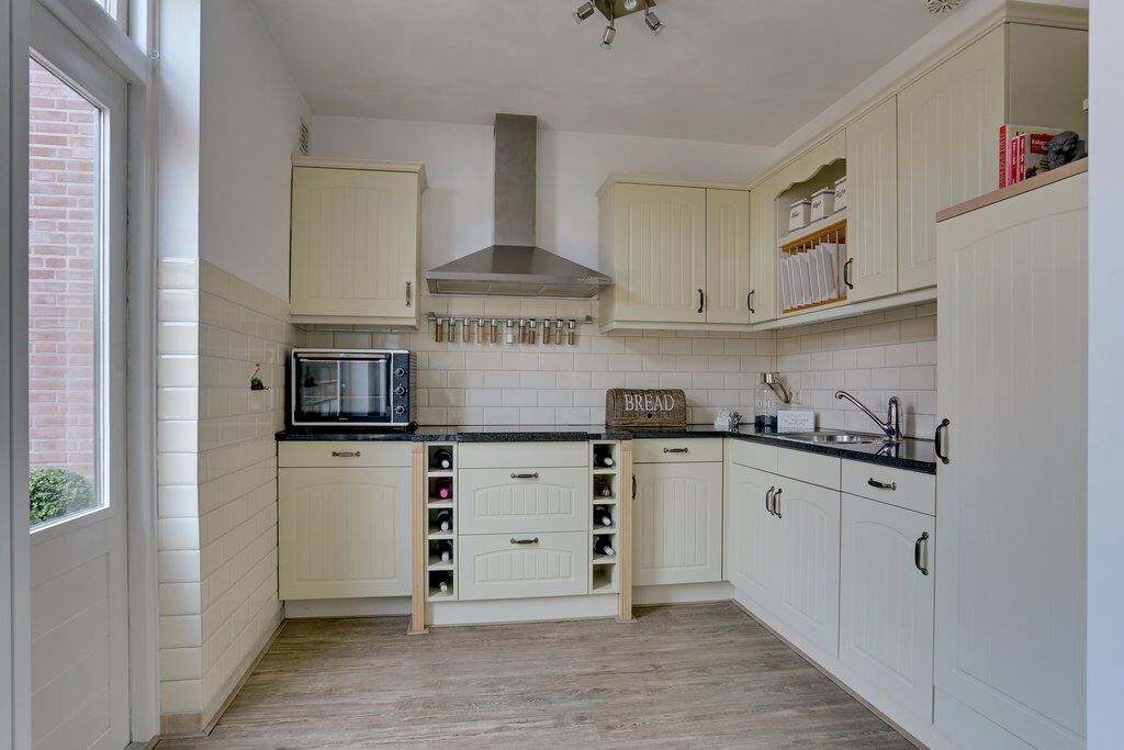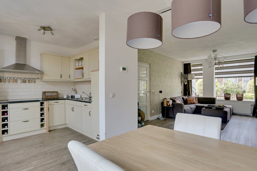 Aan de achterzijde van de woning bevindt zich de moderne keuken in hoekopstelling. De keuken biedt veel kastruimte en is voorzien van inbouwapparatuur, waaronder een vaatwasser, koelkast, keramische kookplaat en een rvs-afzuigkap.