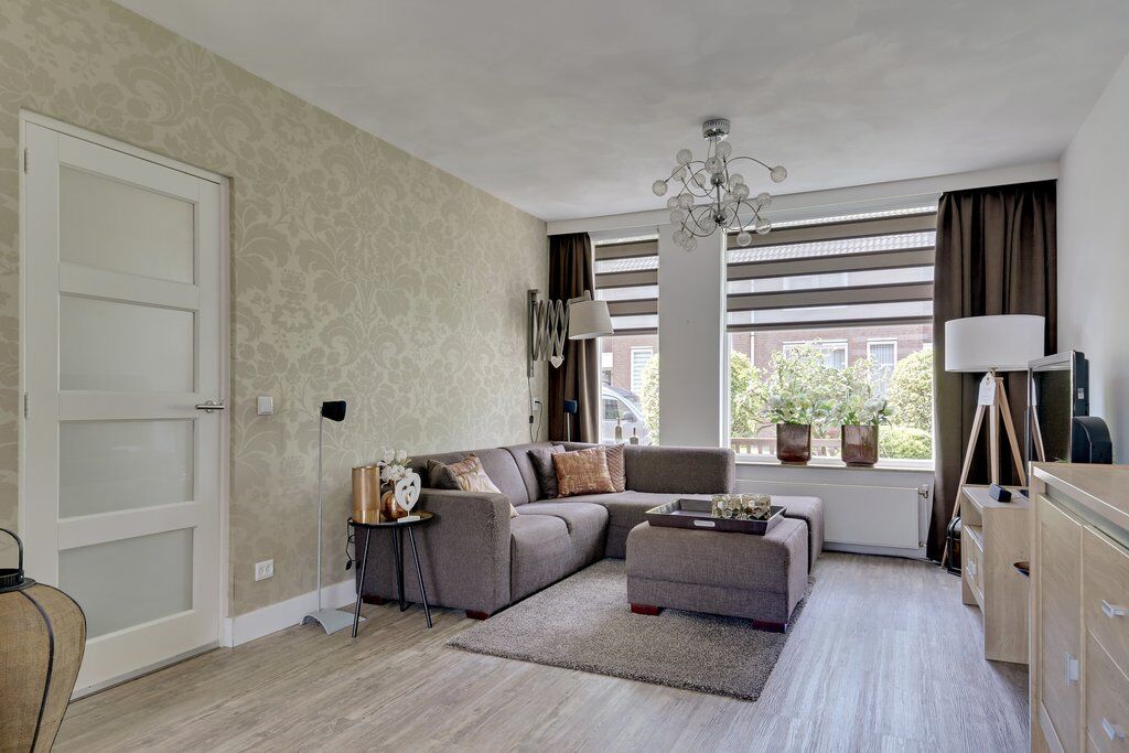 De woonkamer is bereikbaar via een stijlvolle paneeldeur en valt direct op door de ruimte en neutrale afwerking. Aan de voorzijde is plaats voor een comfortabele zithoek, terwijl aan de achterzijde moeiteloos een eettafel kan worden geplaatst. Het strak gestucte plafond en de prettige lichtinval dragen bij aan de prettige en huiselijke sfeer.