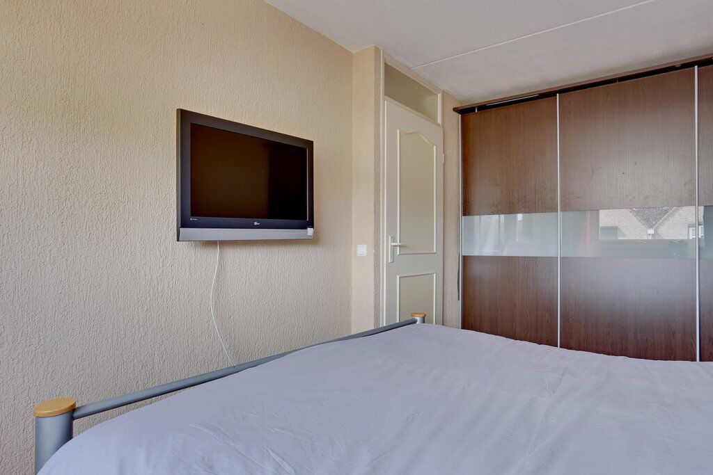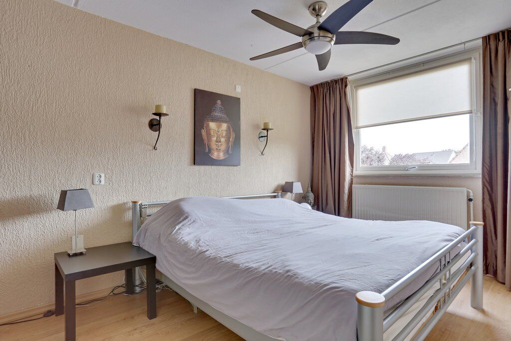 De hoofdslaapkamer, gelegen aan de rustige achterzijde van de woning, biedt ruimschoots plaats aan een groot tweepersoonsbed met bijpassende nachtkastjes. De aanwezige ingebouwde kast zorgt voor extra ruimte voor bijvoorbeeld al uw kleding en schoenen.