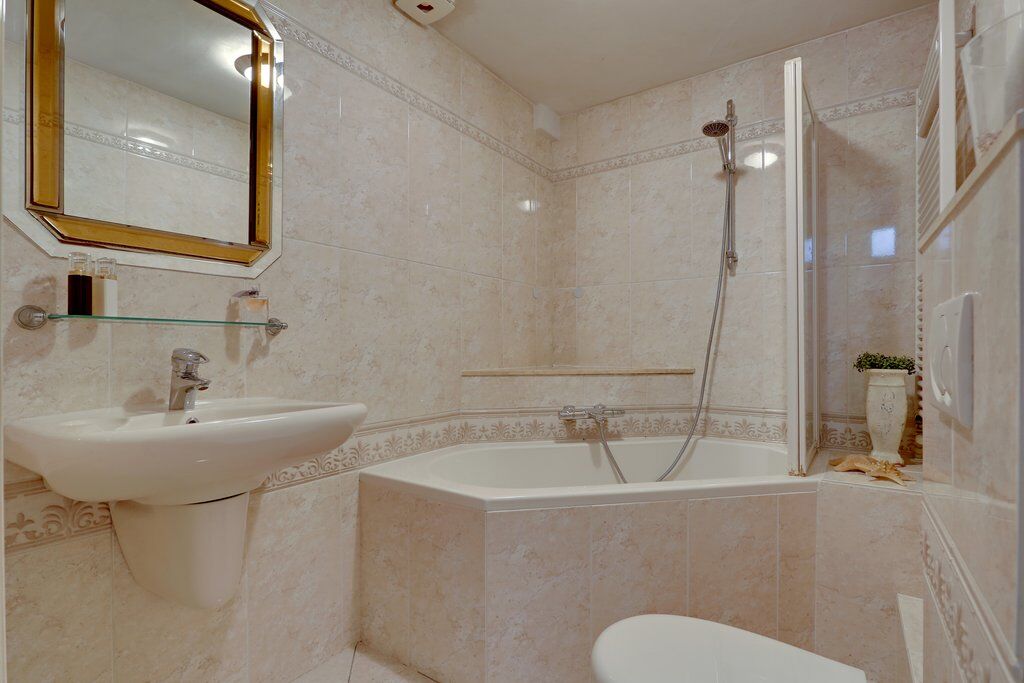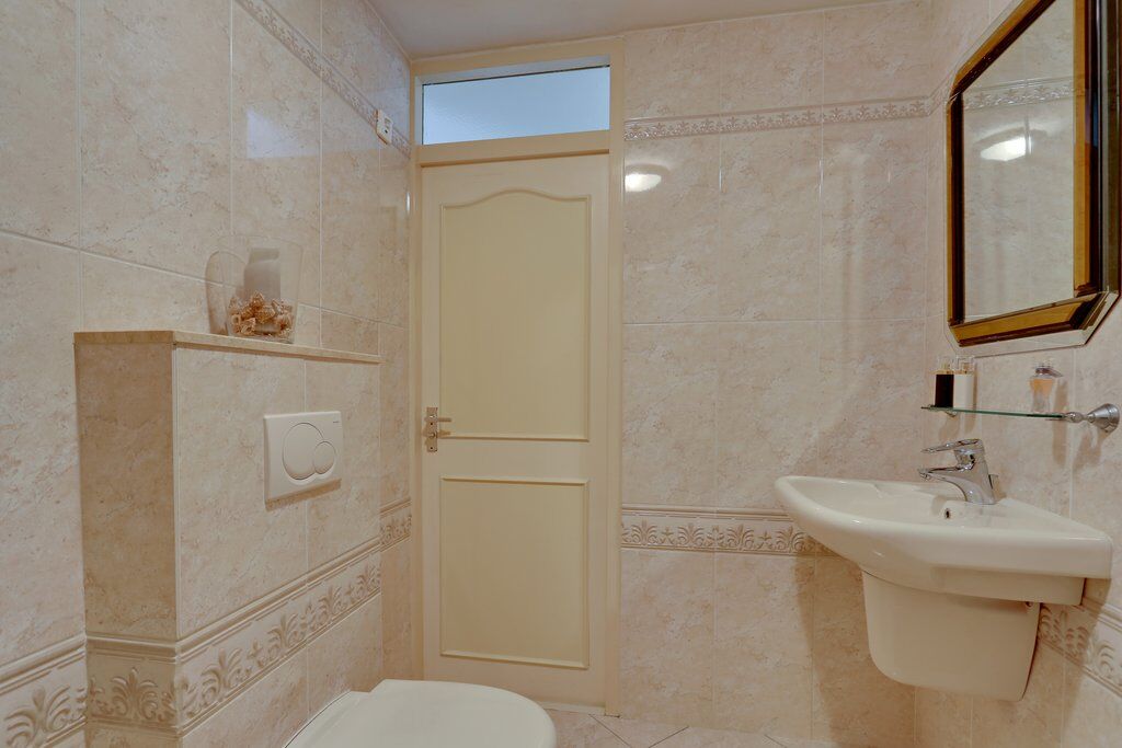 De luxe, geheel betegelde badkamer is compleet uitgevoerd met een hoekligbad voorzien van douchewand, een wandcloset en een vaste wastafel. Een comfortabele en nette ruimte om de dag ontspannen te beginnen of af te sluiten.