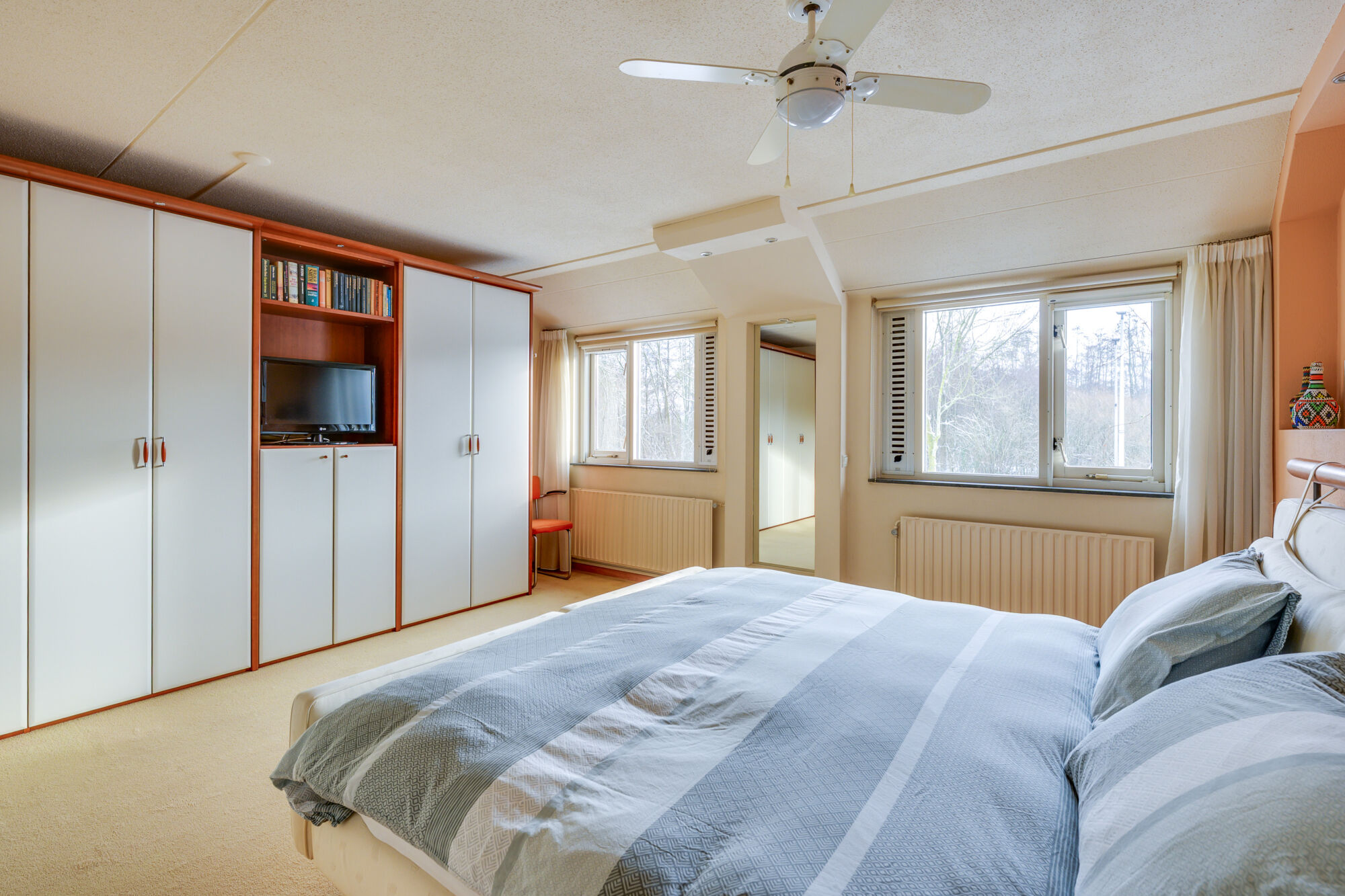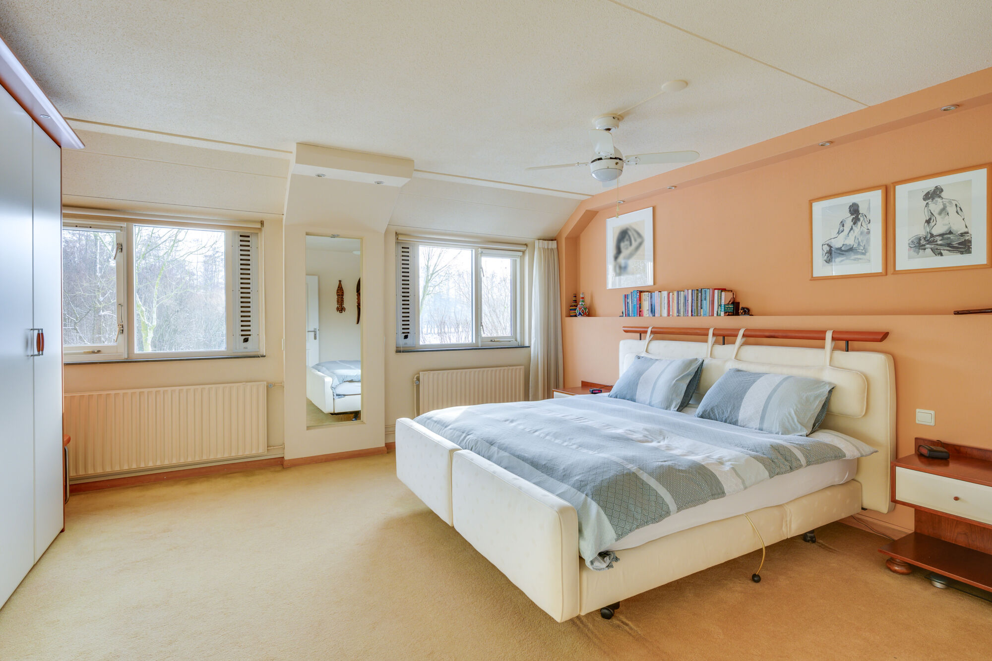 De zeer royale hoofdslaapkamer is gelegen aan de voorzijde van de woning en biedt een prachtig vrij uitzicht over het bosrijke gebied “het Goor”. Dankzij deze open ligging is de kamer heerlijk licht en is er volop ruimte voor een groot tweepersoonsbed met nachtkastjes, een royale kledingkast en eventueel aanvullende meubelstukken.