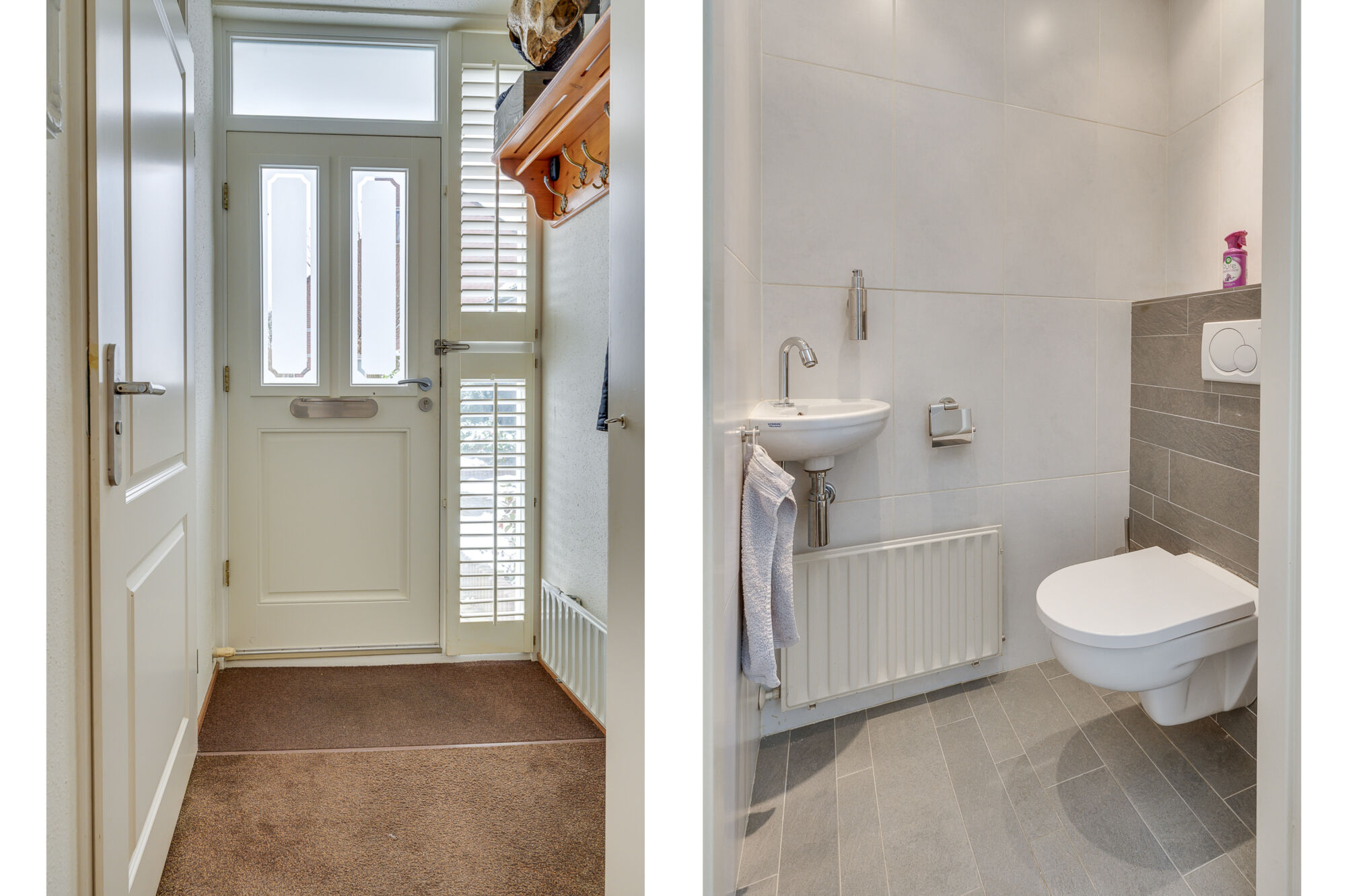 De typische hoofdingang van deze woning is aan de zijkant van de woning gesitueerd. Bij binnenkomst betreden we de hal, welke ons toegang geeft tot een modern toilet met fonteintje en de meterkast.
