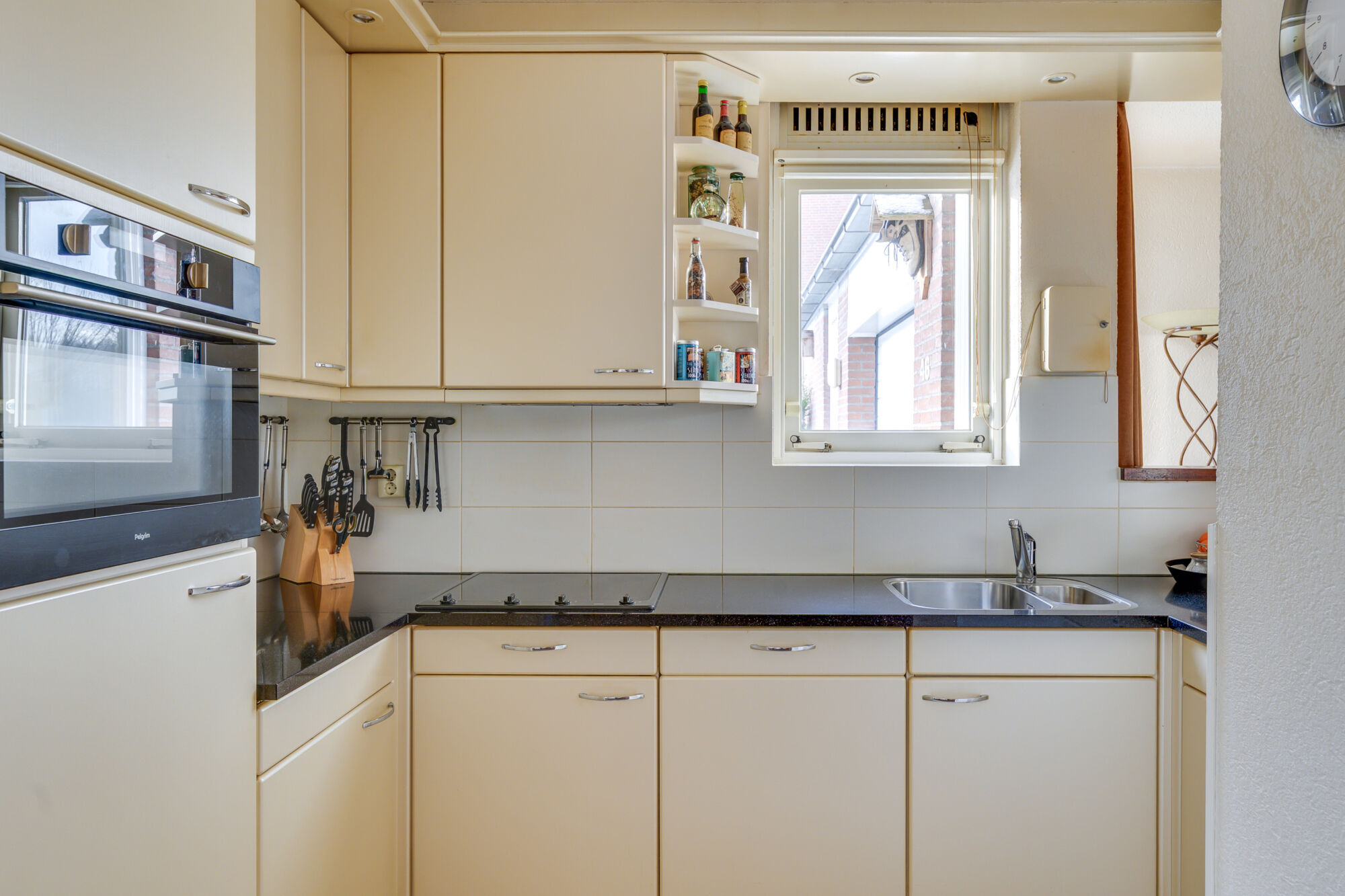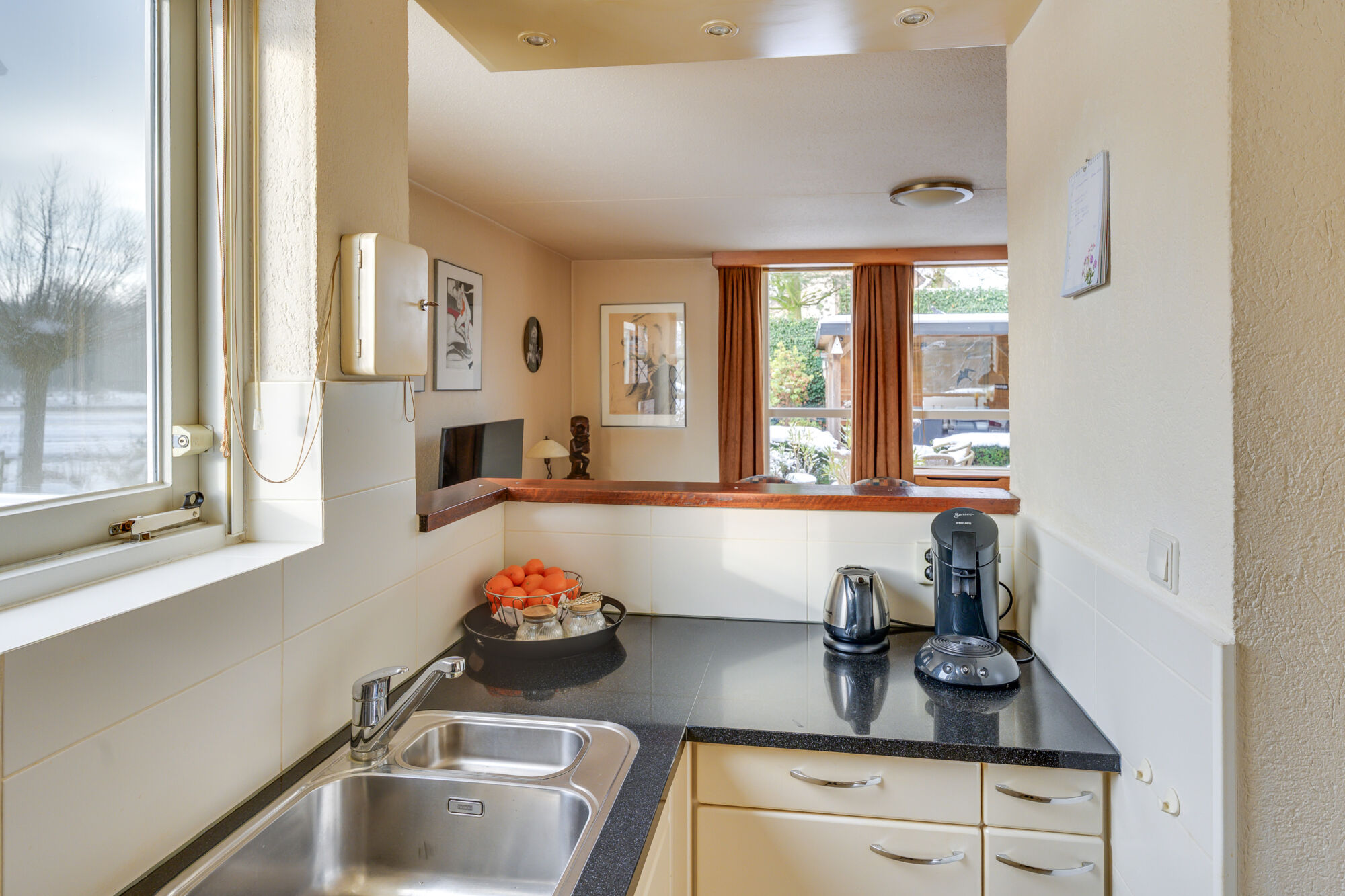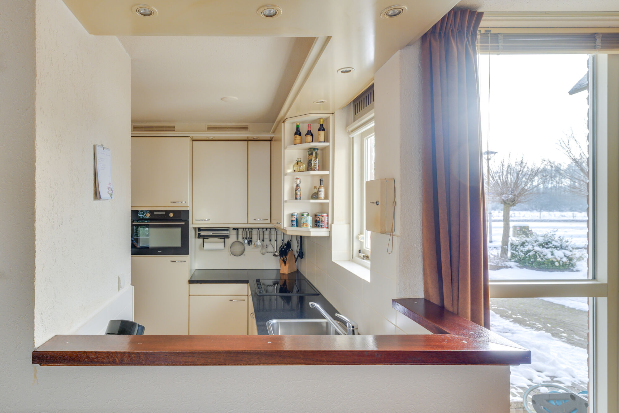 De keuken bevindt zich centraal tussen de eet- en zitkamer en vormt daarmee een prettige verbinding tussen beide ruimtes. De keuken is uitgevoerd in een praktische hoekopstelling en voorzien van diverse inbouwapparatuur.
