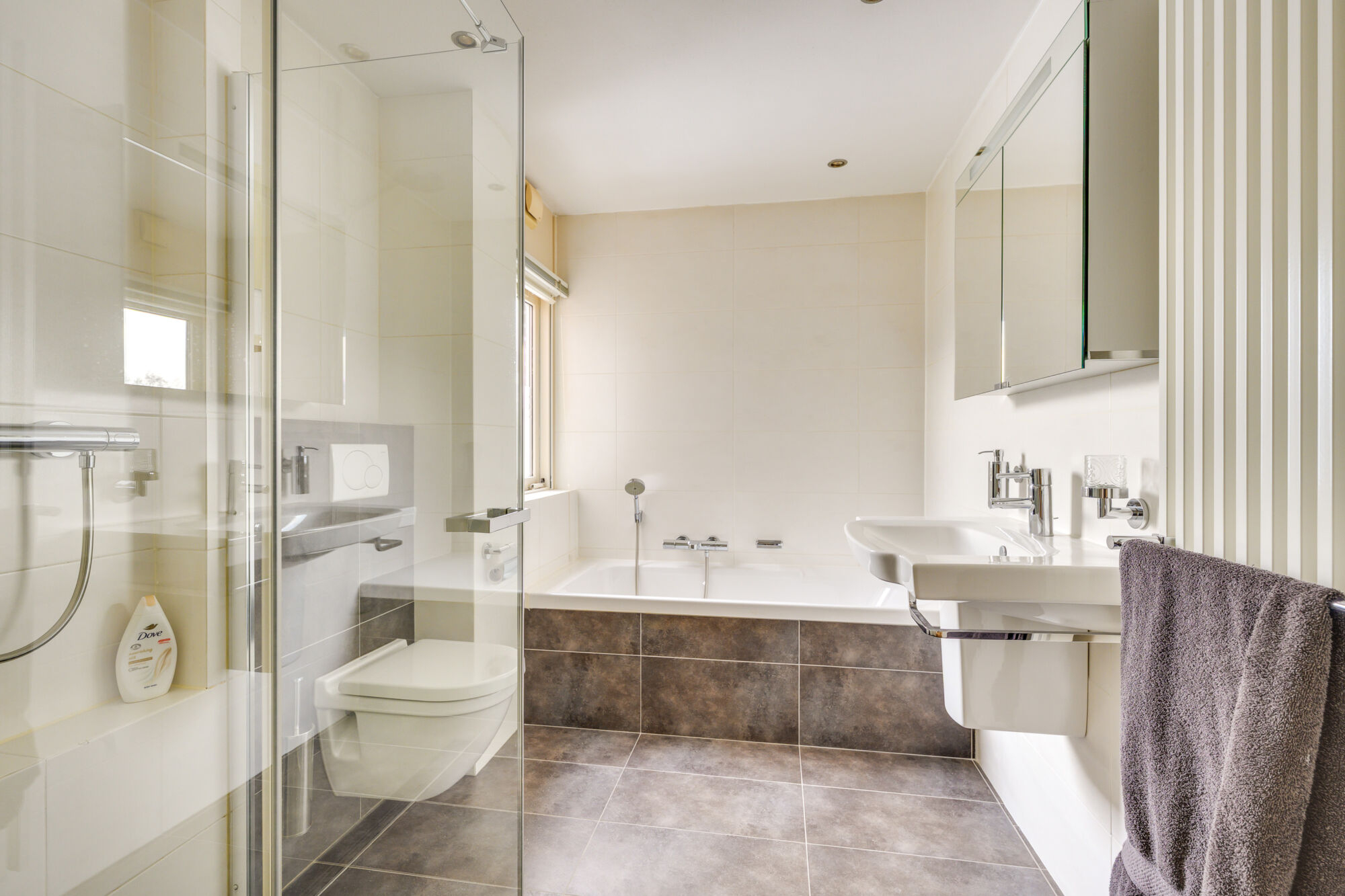 De ruimte is compleet uitgerust met een royale inloopdouche met glazen wanden, een ligbad met douchefunctie, een wastafel, toilet en een handdoekradiator. Zowel mechanische ventilatie als natuurlijke ventilatie via een te openen raam zijn aanwezig, wat zorgt voor een aangenaam binnenklimaat en bovendien voor een prettige lichtinval.