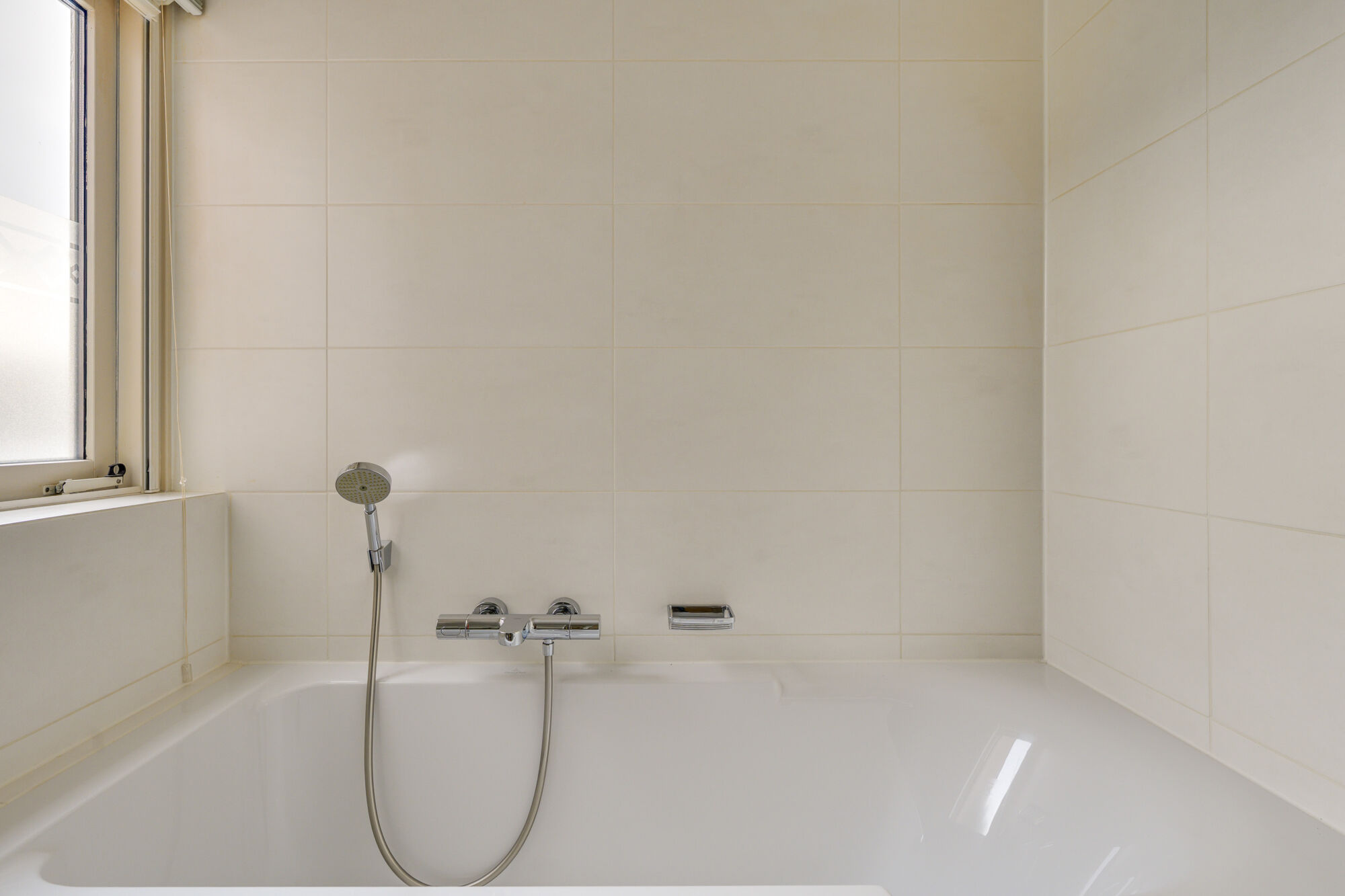 De badkamer is uitgevoerd met moderne betegeling en biedt alle comfort voor optimaal ontspannen na een lange werkdag of in het weekend.