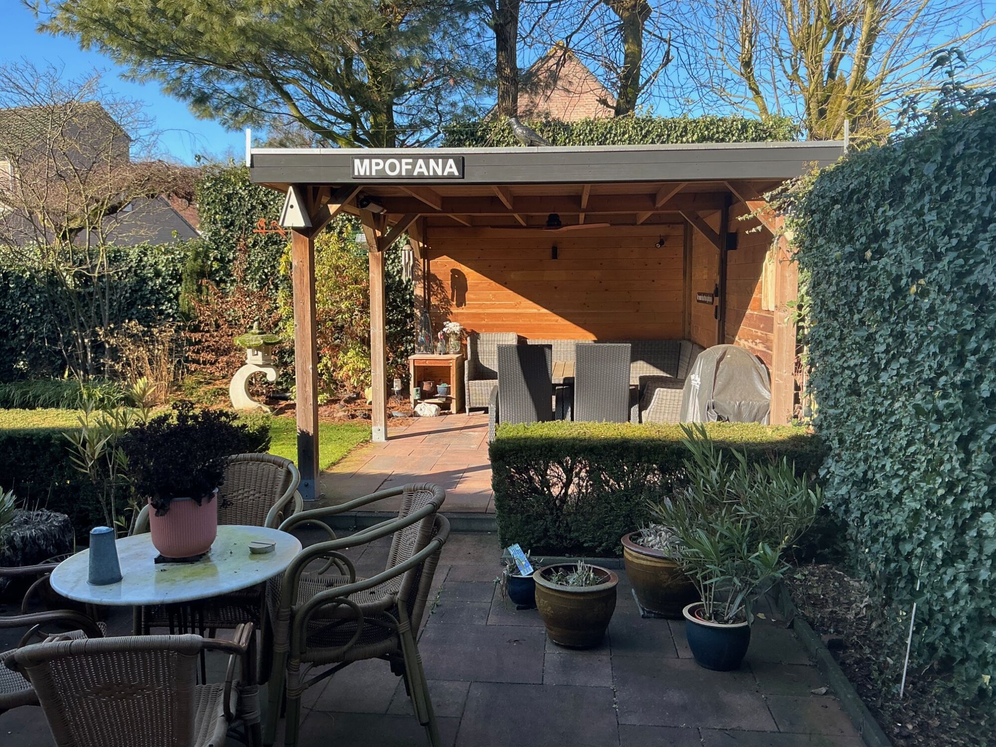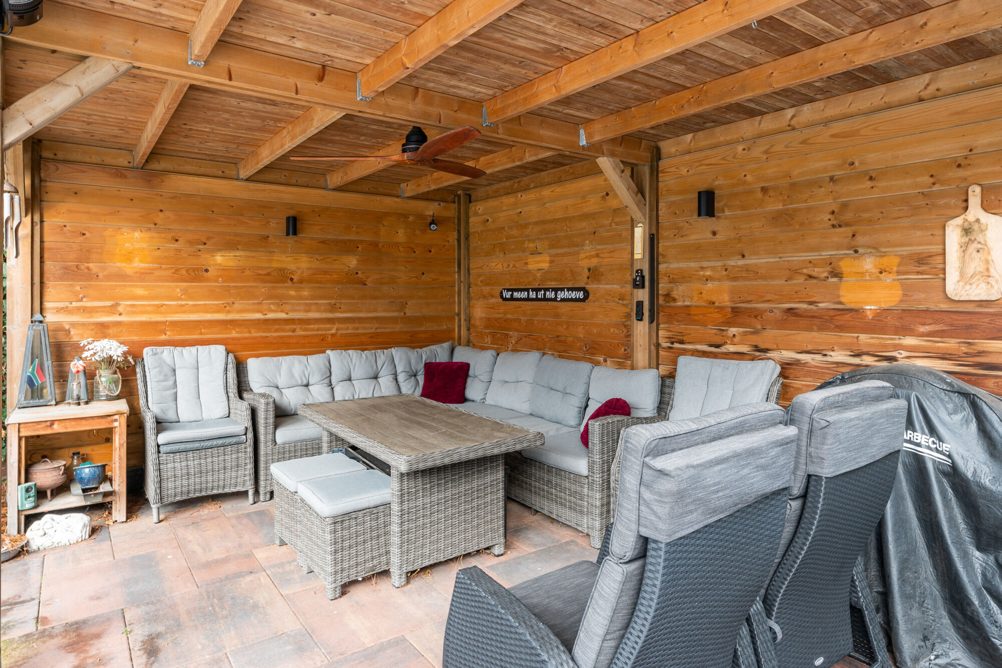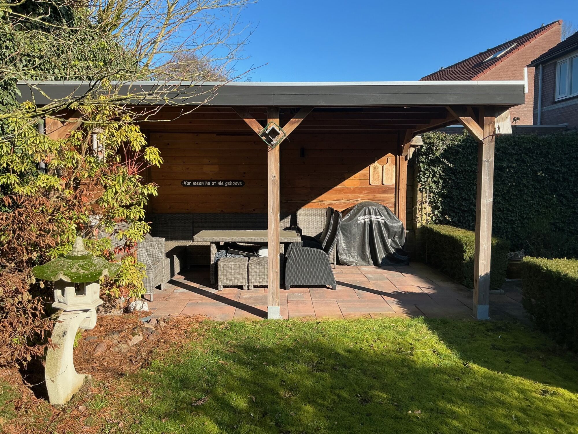 – Sfeervolle houten overkapping met elektra;