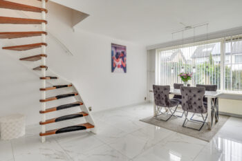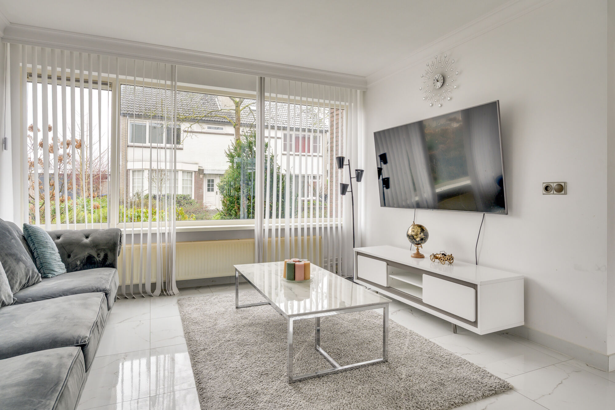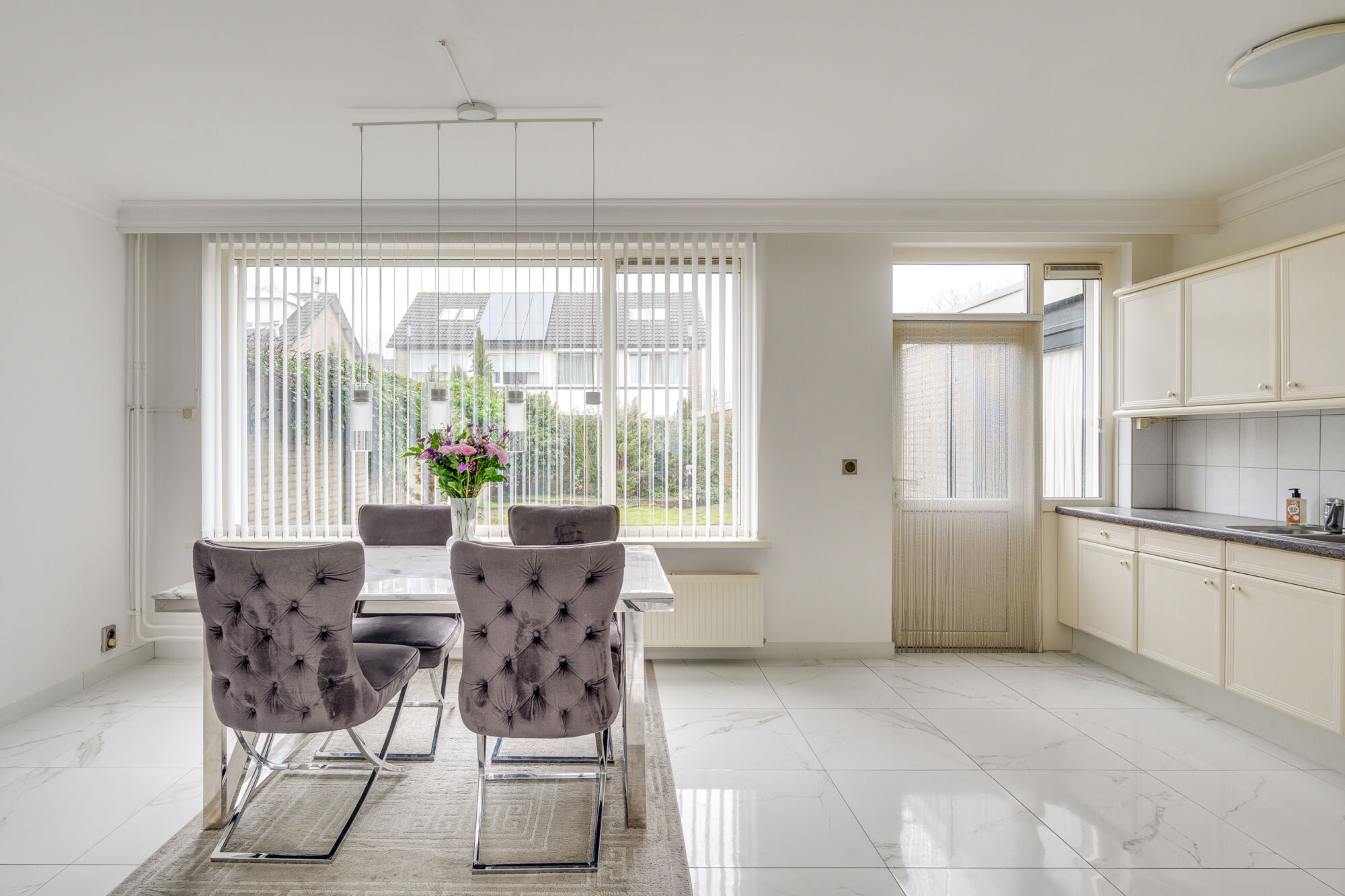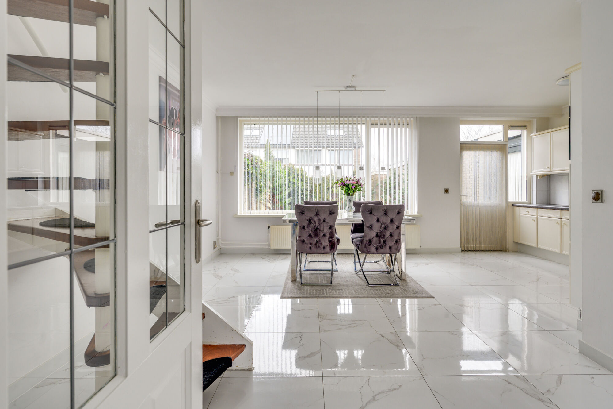 De Z-vormige living heeft een ruim zitgedeelte aan de voorzijde. De eethoek is gesitueerd aan de achterzijde en heeft zicht op de achtertuin. Door de grote raampartijen aan zowel de voor- zij als achterzijde van de living is er zeer veel lichtinval en geeft het geheel een ruim en open karakter. Op de vloer ligt een fraaie tegel.