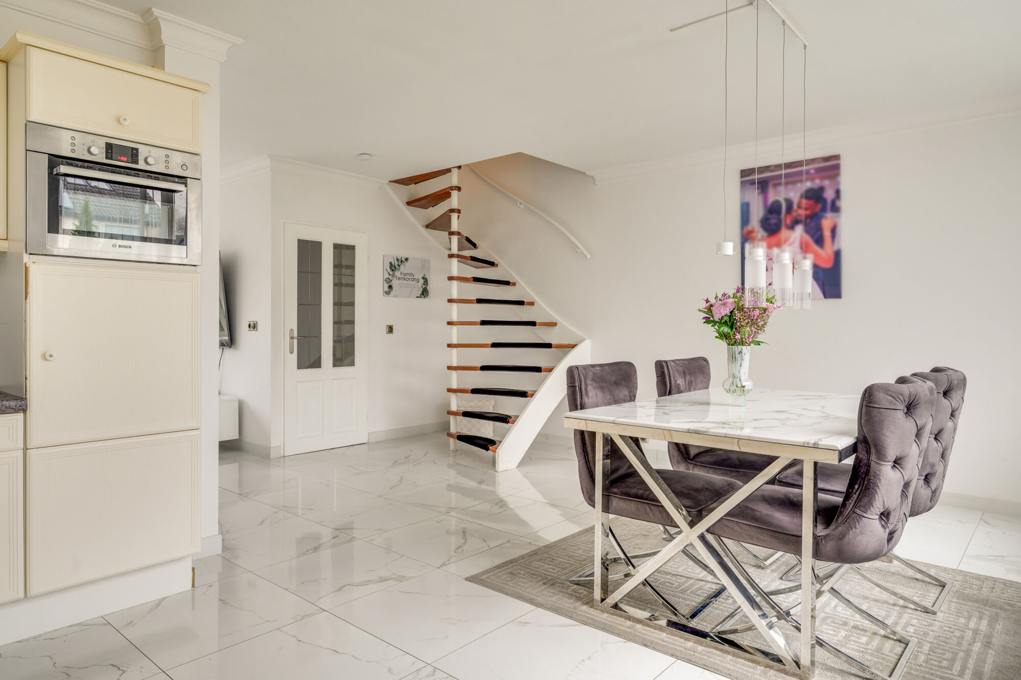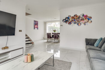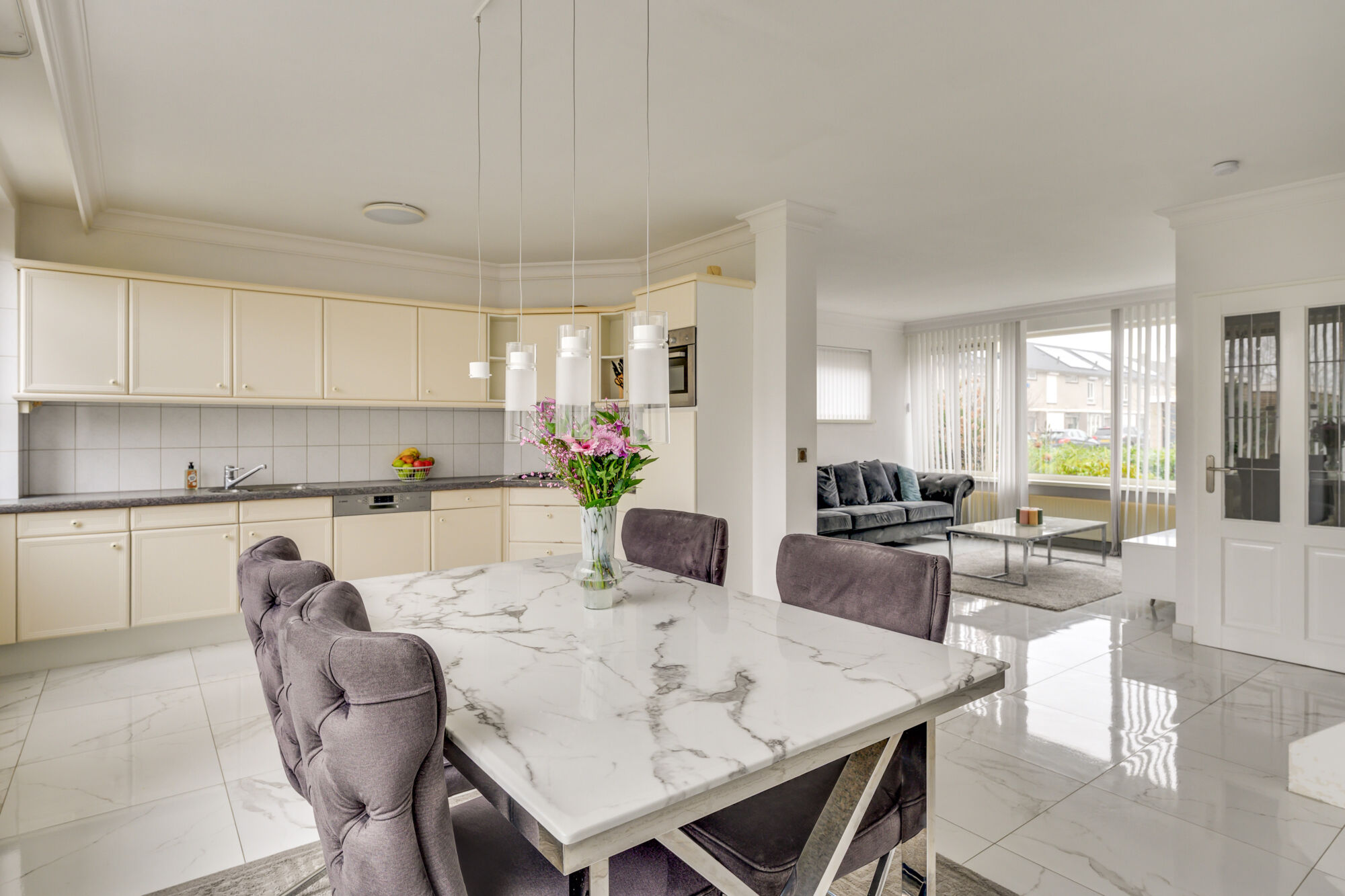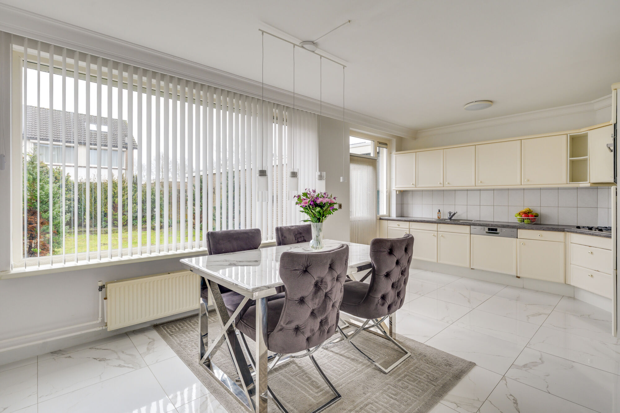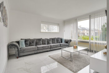 De Z-vormige living heeft een ruim zitgedeelte aan de voorzijde. De eethoek is gesitueerd aan de achterzijde en heeft zicht op de achtertuin. Door de grote raampartijen aan zowel de voor- zij als achterzijde van de living is er zeer veel lichtinval en geeft het geheel een ruim en open karakter. Op de vloer ligt een fraaie tegel.