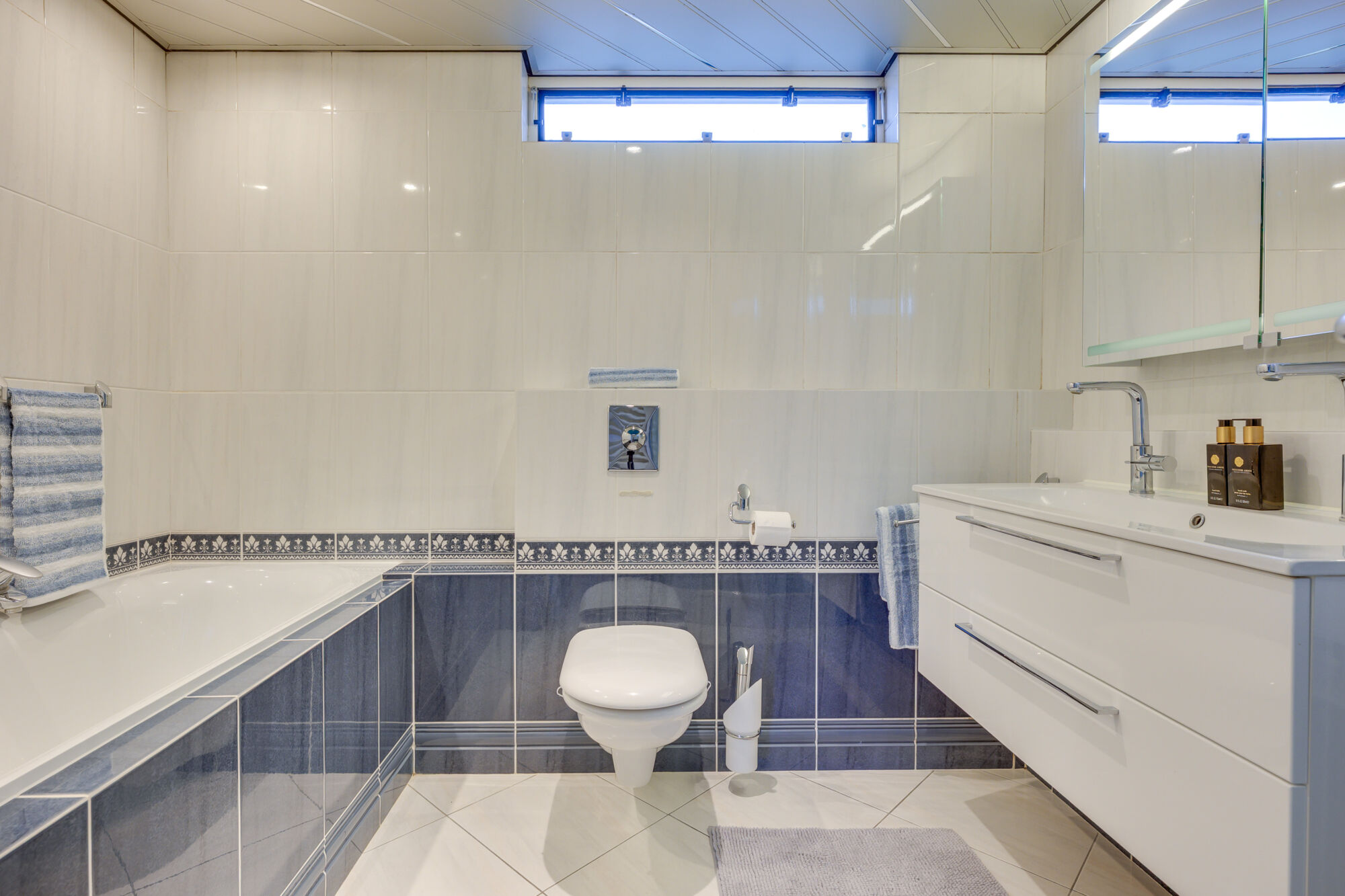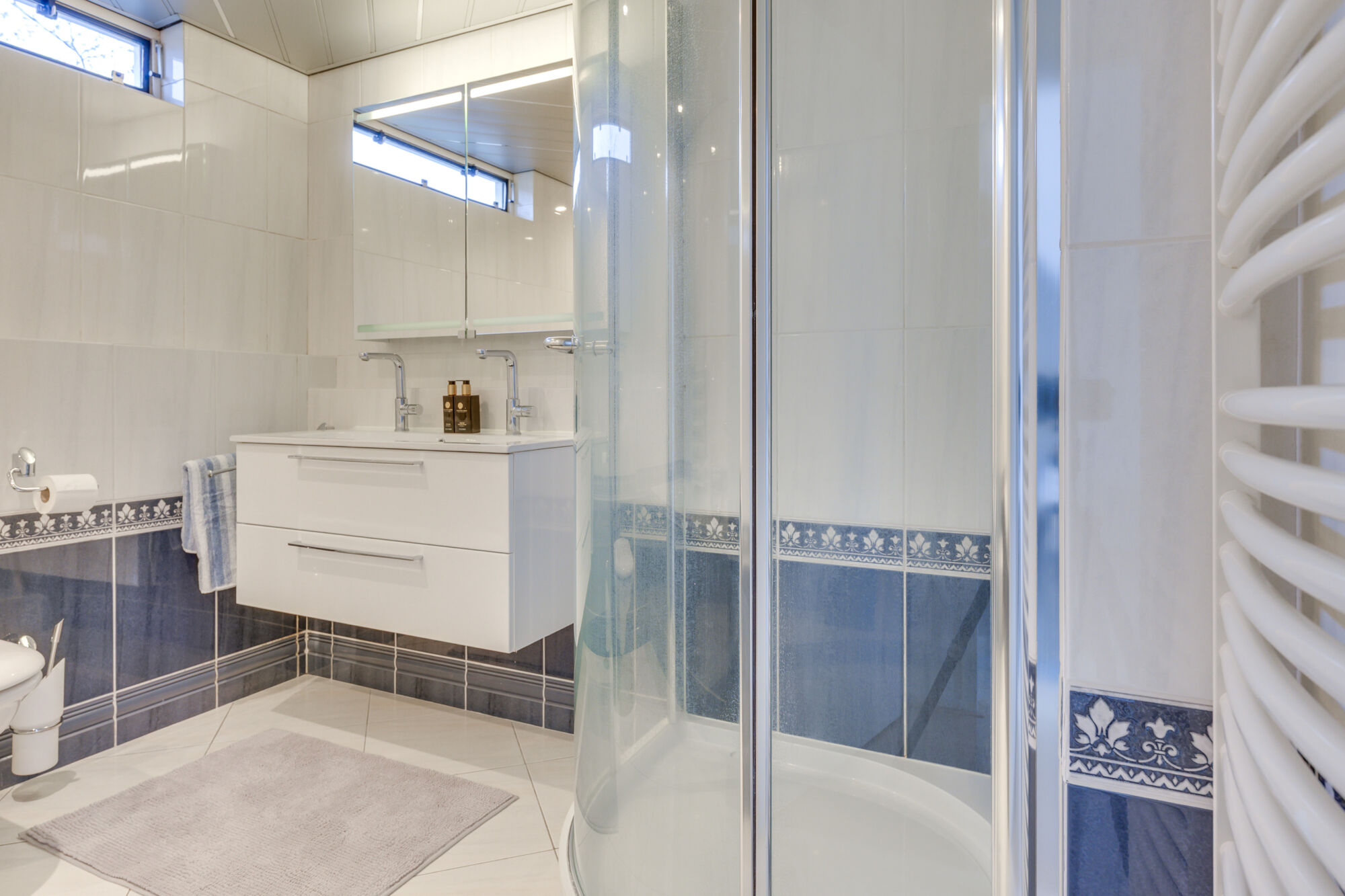 De badkamer is keurig onderhouden en uitgerust met een douchecabine, 2e toilet, wastafel met meubel en 2 kranen en een ligbad. Een raam zorgt voor daglichttoetreding en ventilatie.
