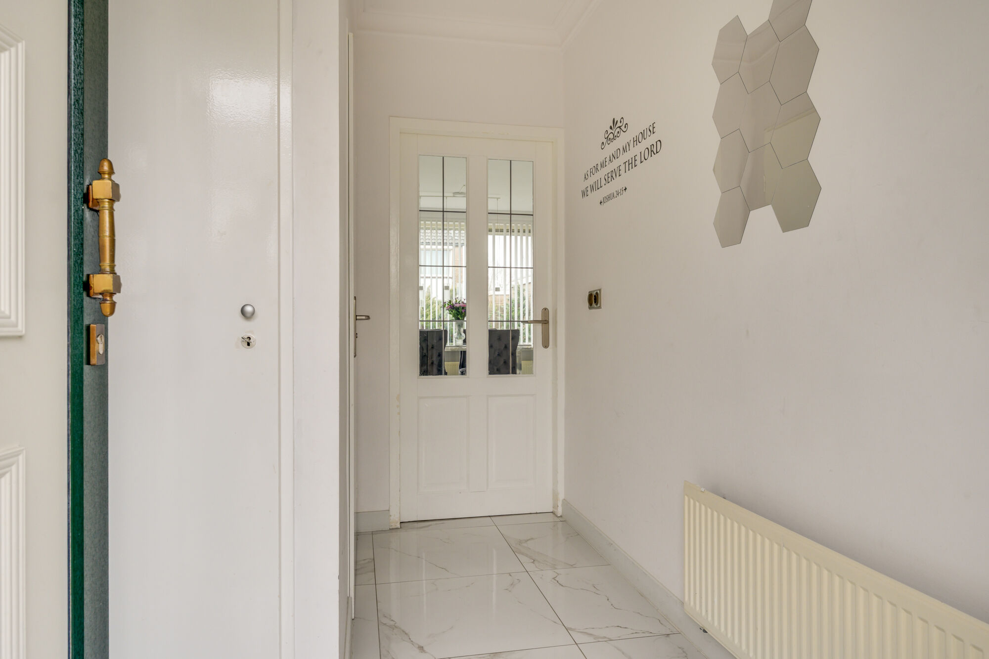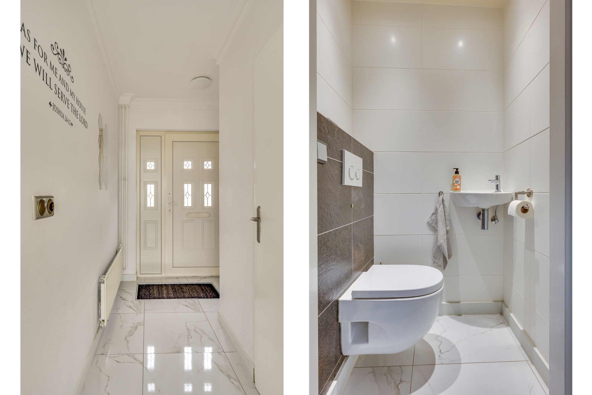 Middels overdekte entree bereiken we de hal welke toegang geeft tot de woonkamer, moderne toiletruimte en de meterkast.