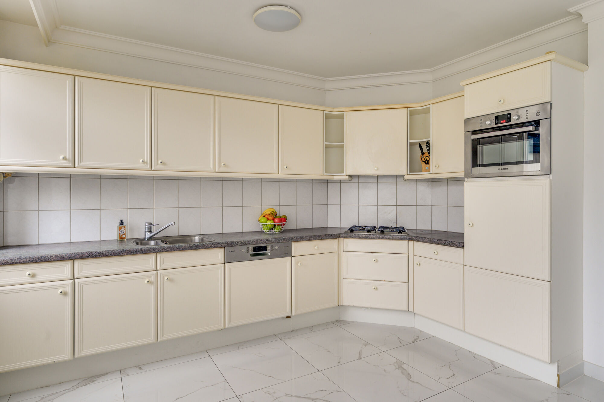 De inrichting van de open keuken is uitgevoerd in een hoekopstelling en voorzien van meer dan voldoende kastruimte. Aan apparatuur treffen we een vaatwasser, een gaskookplaat met afzuigkap, een combimagnetron/oven en een koelkast aan.