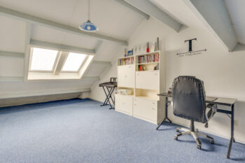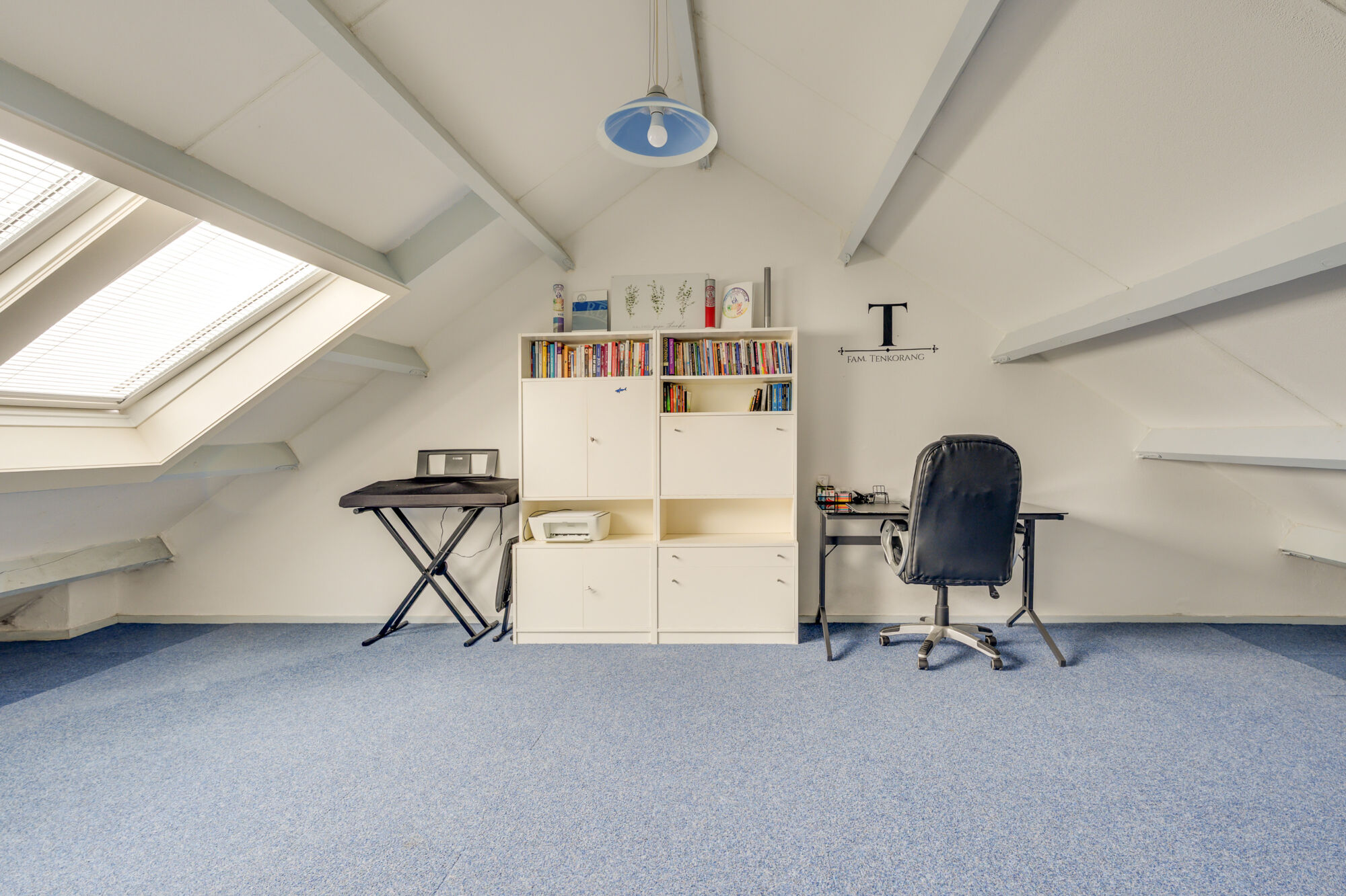 Via een vaste trap is de voorzolder te bereiken. Hier bevinden zich twee bergruimtes met ideale opbergmogelijkheden. In een van de bergingen bevindt zich de Nefit c.v.-ketel. De voorzolder geeft toegang tot een ideale zolderkamer. Deze zolderkamer is ruim en beschikt over twee Velux-dakramen, waardoor er zeer veel licht binnenvalt.